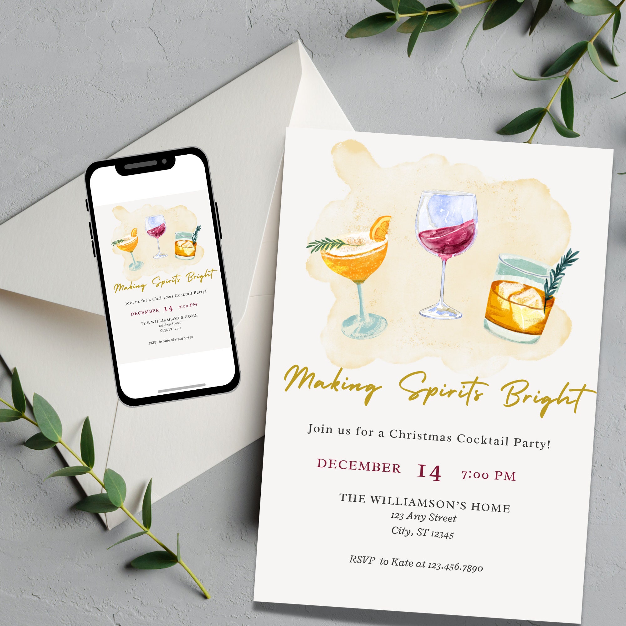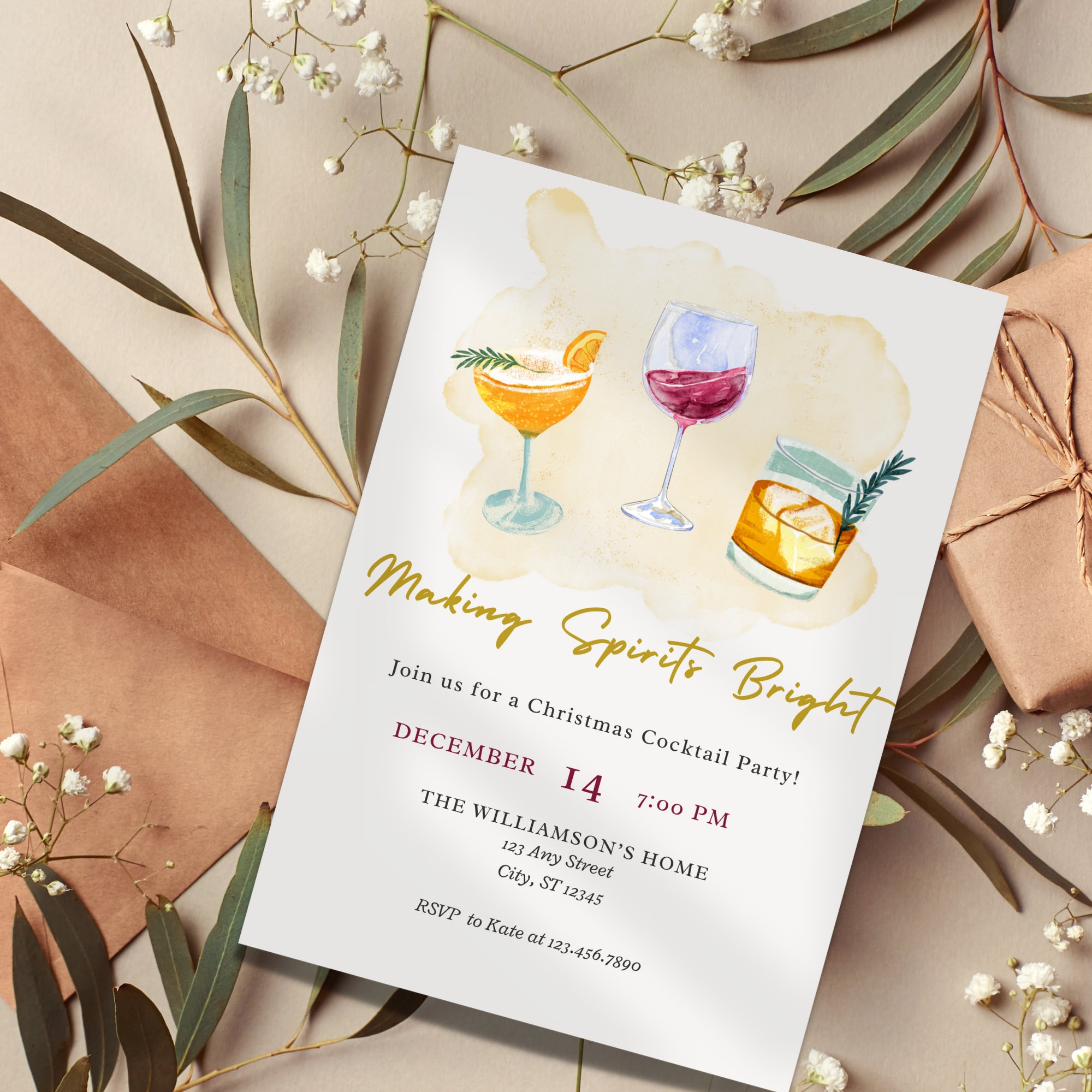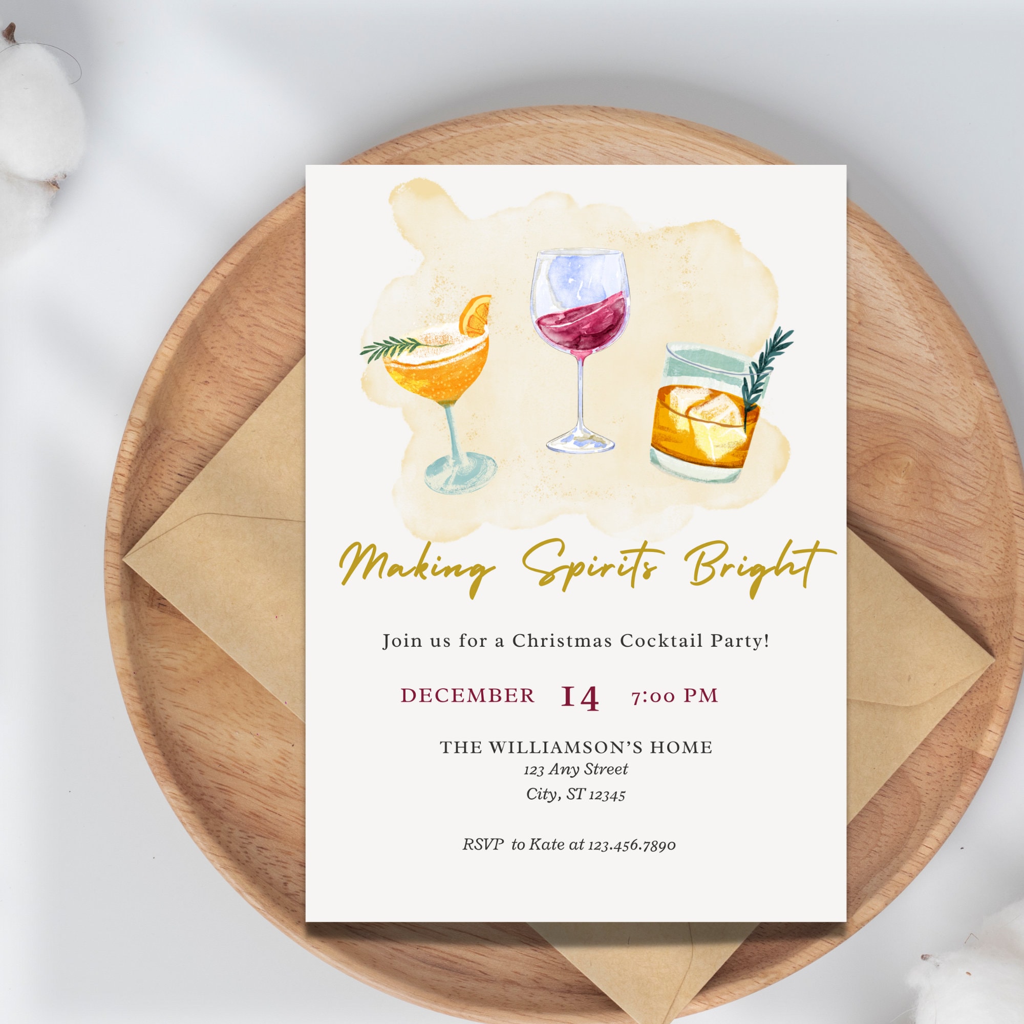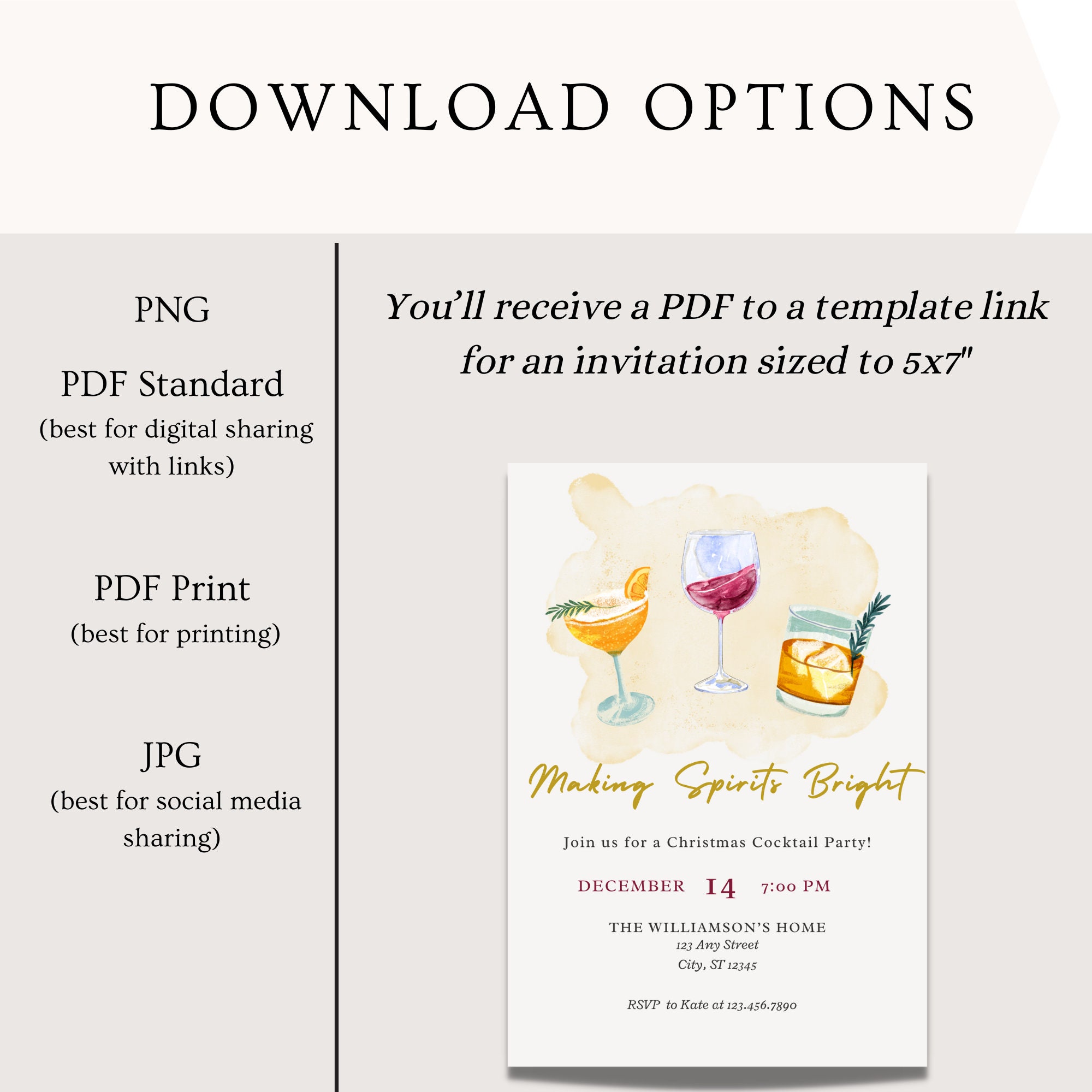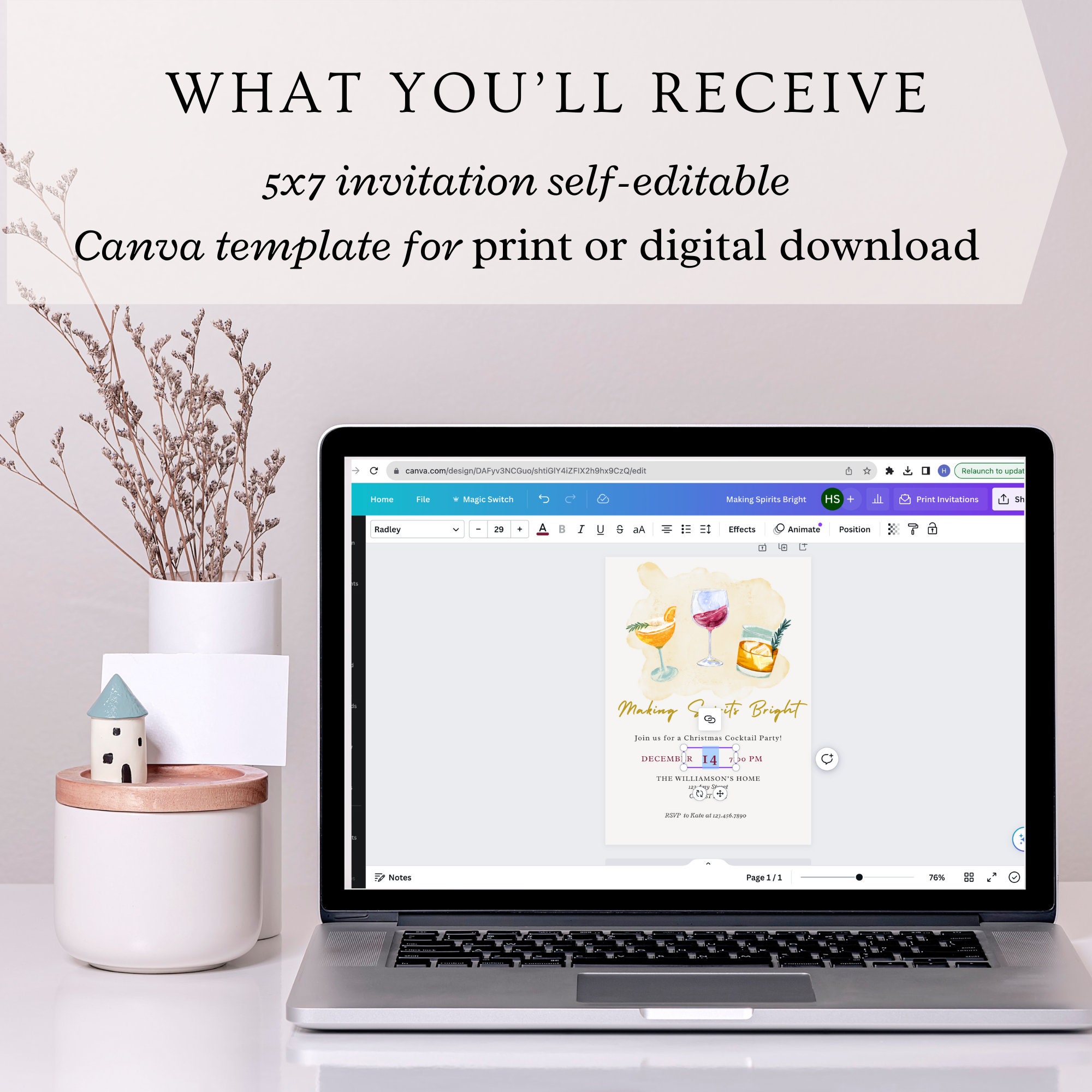 Looking for a festive and unique way to invite your friends and family for Christmas? Our Making Spirits Bright Christmas Cocktail Party Invitation is printable or digital and is perfect for any holiday celebration, from a cozy dinner at home to a big party at work. Plus, it's easy to customize – just add your name, address, and party details, and you're ready to go! This template is effortlessly editable on Canva, but if you're new to editable stationary, it comes with 9 free videos to help navigate customizing!