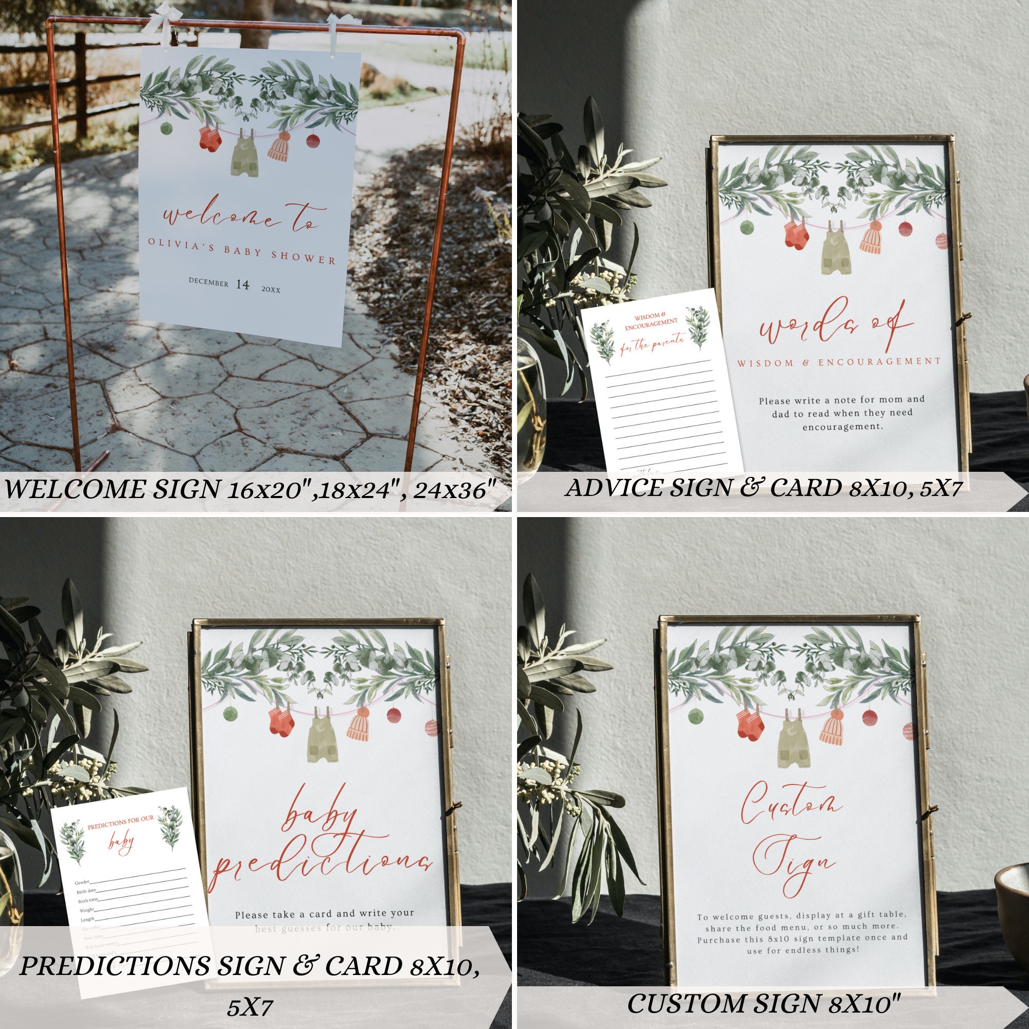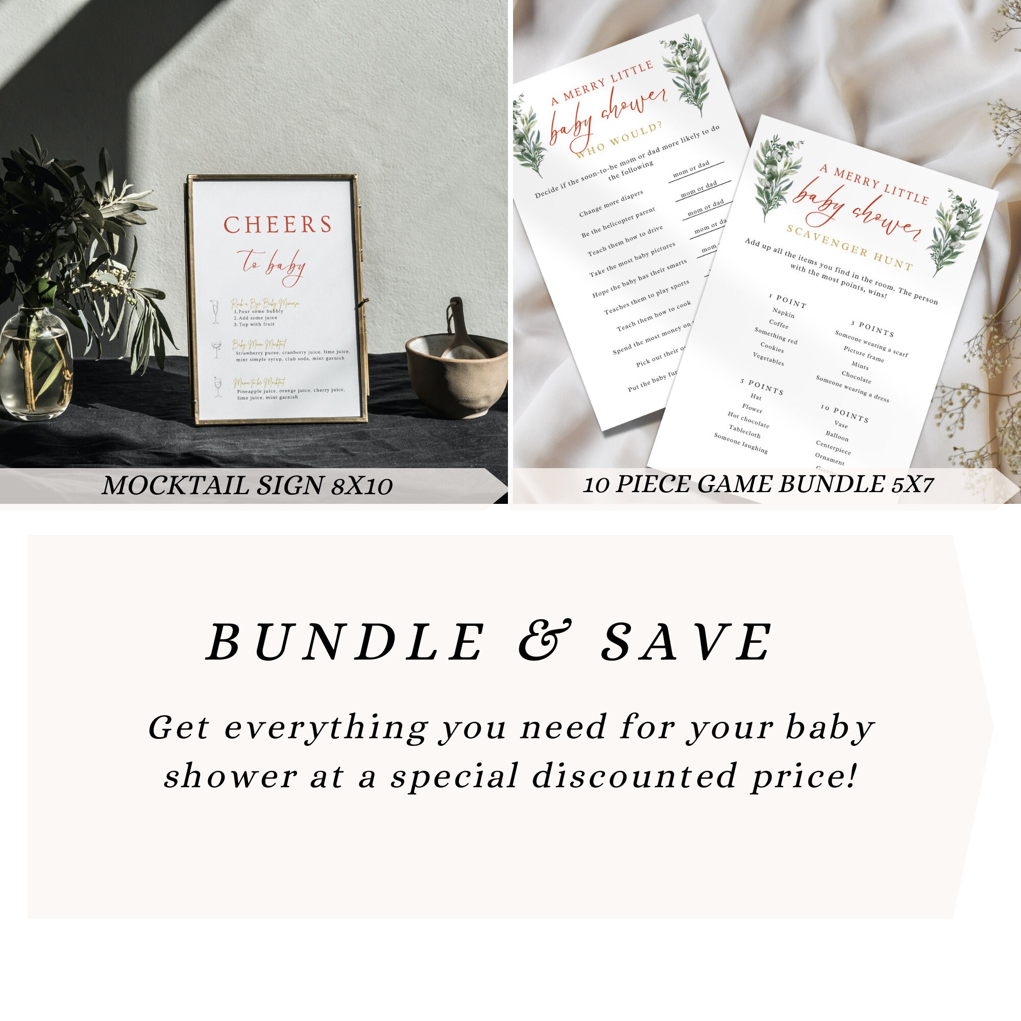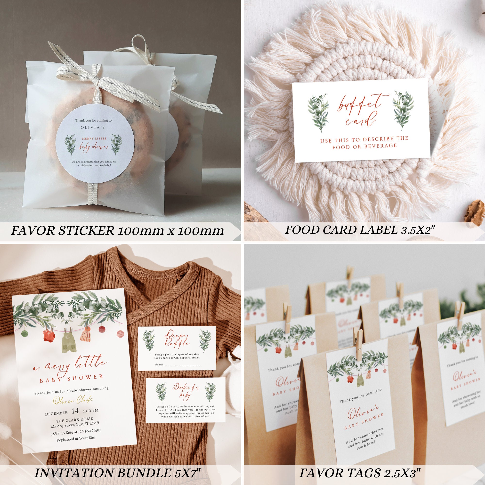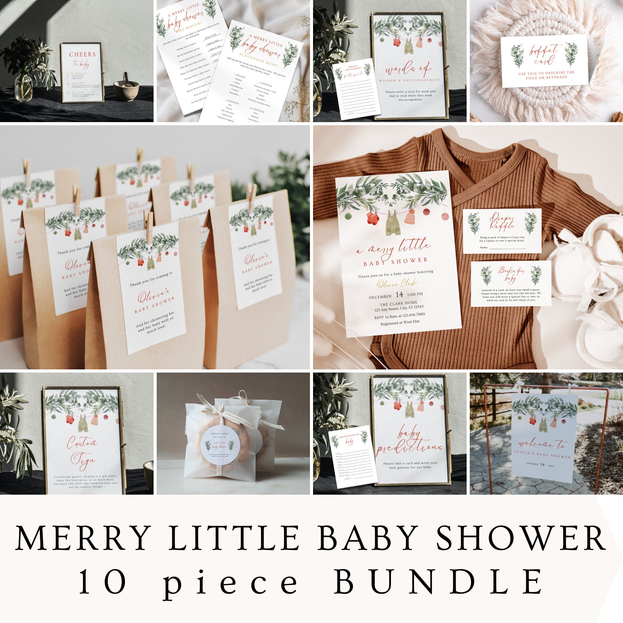 Our Winter Baby Shower Decorations Bundle has the most adorable theme for any Christmas Baby Shower: A Merry Little Baby Shower Bundle comes with the complete set of matching templates. Each is beautiful, stylish and easy to customize. They feature watercolor green foliage, baby clothes and festive Christmas ornaments. The typeface is both feminine and modern- perfect for a gender neutral baby shower. These templates are lovely for the cold months and can be customized to fit your specific needs. Plus, they're available as instant downloads, so you can get them ready in no time at all! The bundle includes: