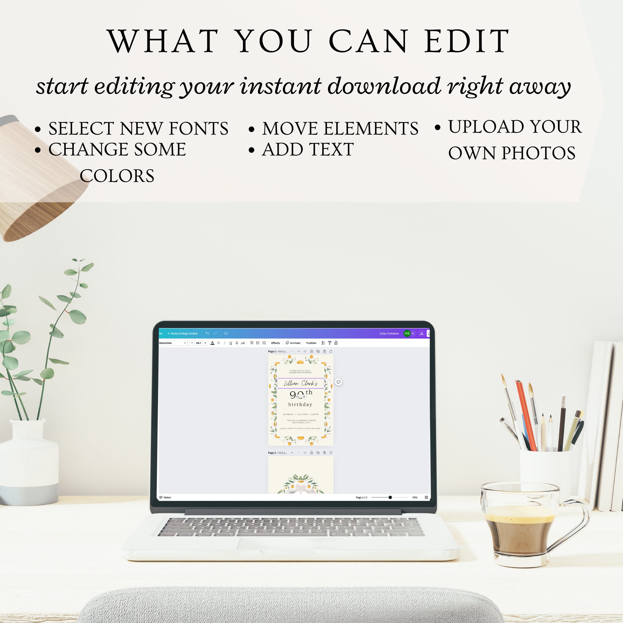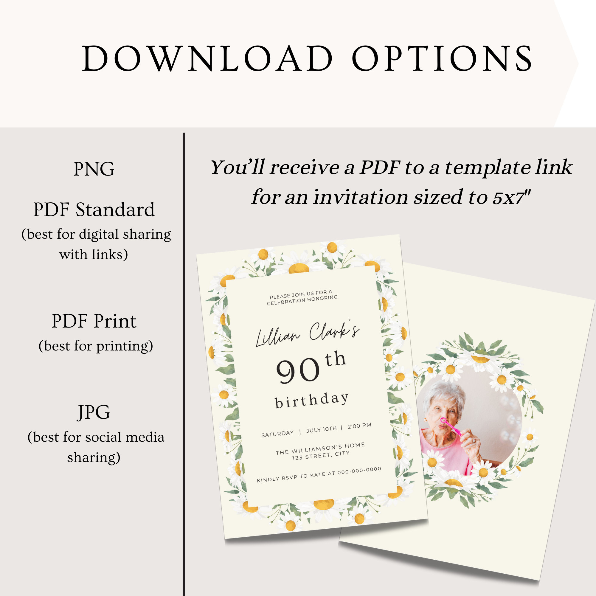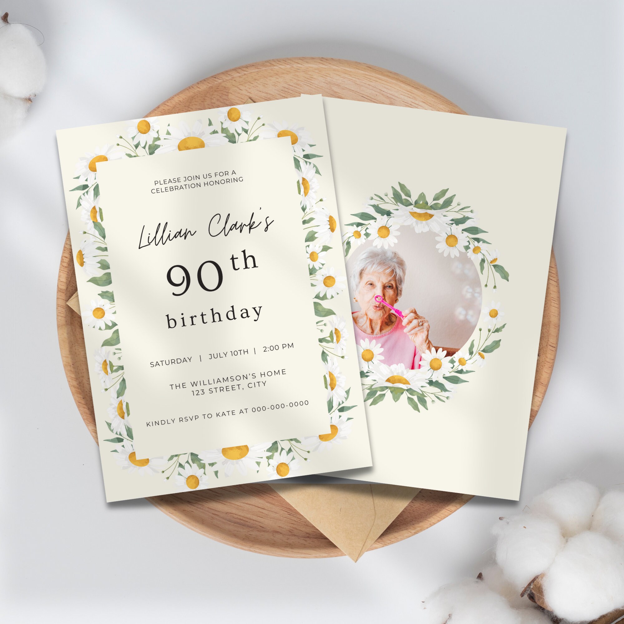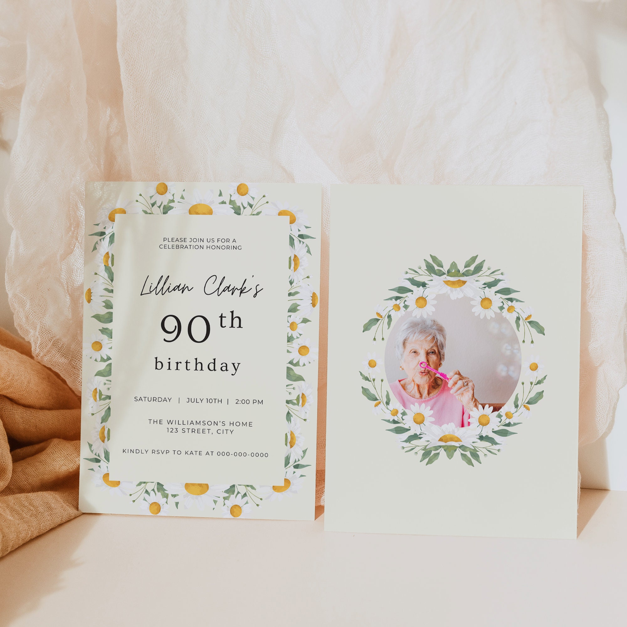 Celebrate her milestone 90th birthday in style with this beautiful floral invitation template. This instant download digital invitation is perfect for any woman's 90th birthday party and features lovely daisies and a feminine typeface. Simply edit the text and add a picture with our easy-to-use template and to create a personalized and unique invite. Make her special day memorable with this custom mobile invite that can be easily printed or shared via text or email. Get ready to wow your guests with this lovely 90th birthday invitation designed specifically for her. Invitation sized to 5x7" and comes with 9 editing tutorial videos.