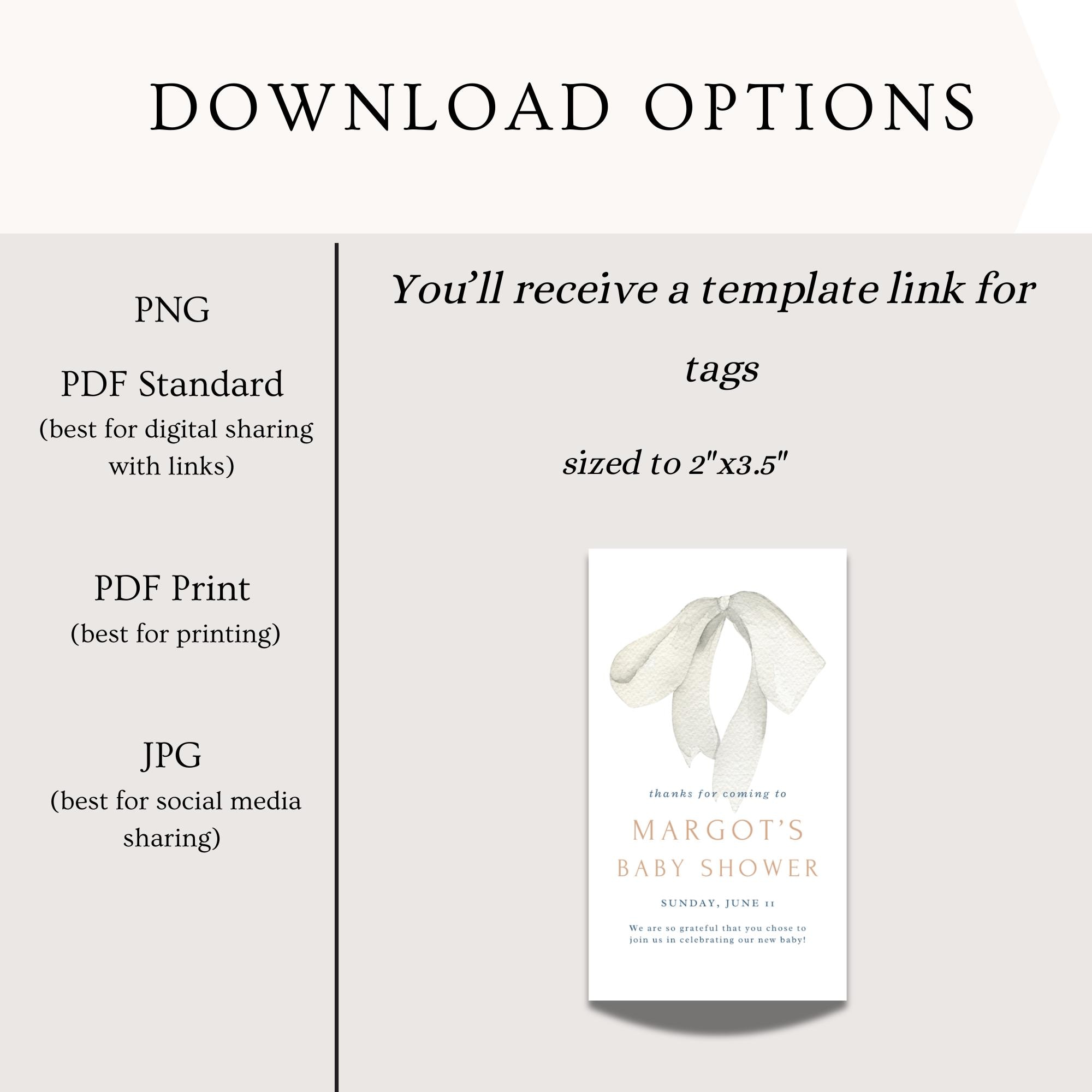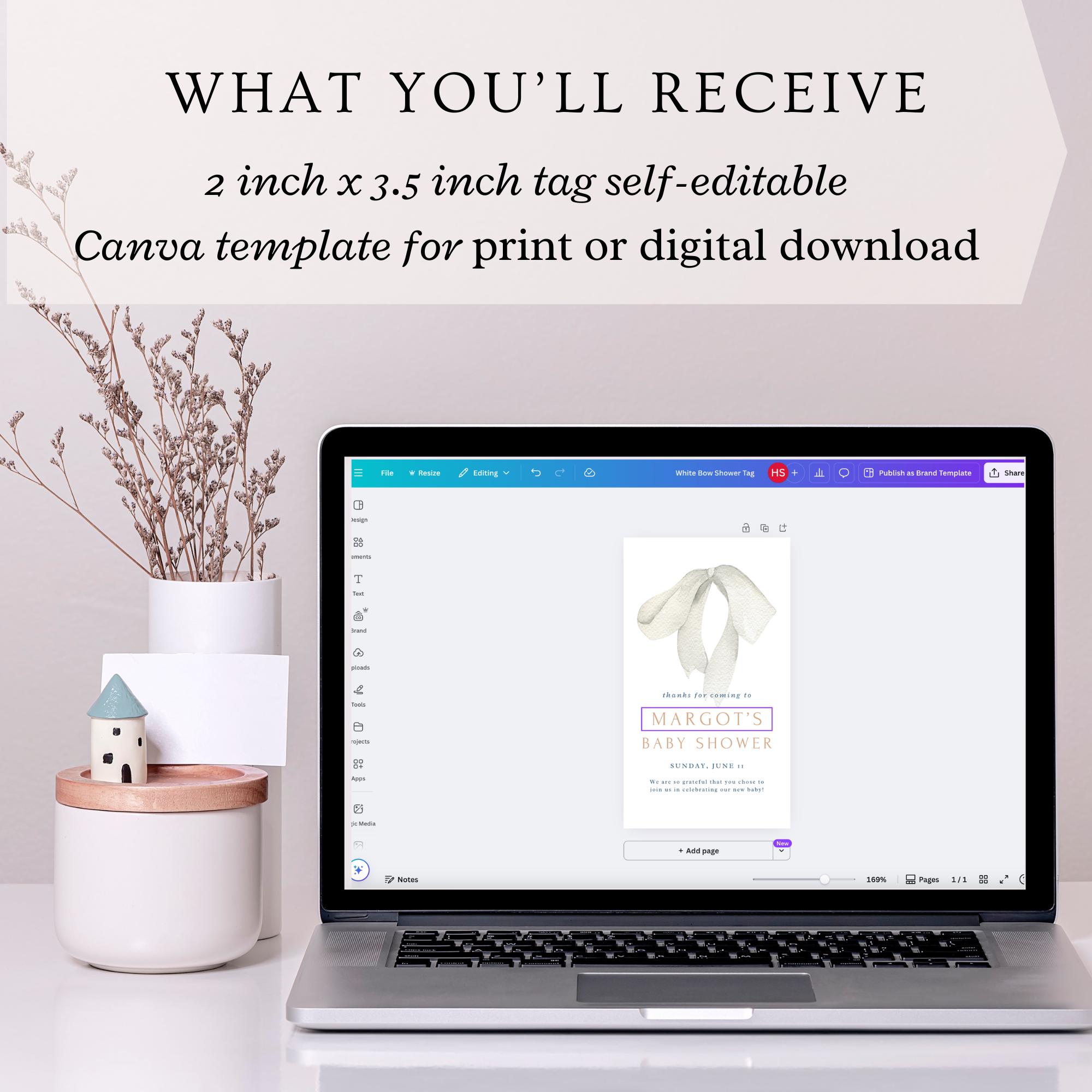 Add a little charm to your shower favors with this darling tag that’s as easy to use as it is adorable! This tag template is sized to 2x3.5" and is easily customizable on Canva. If you're new to editable stationary, this template comes with 9 free tutorial videos!