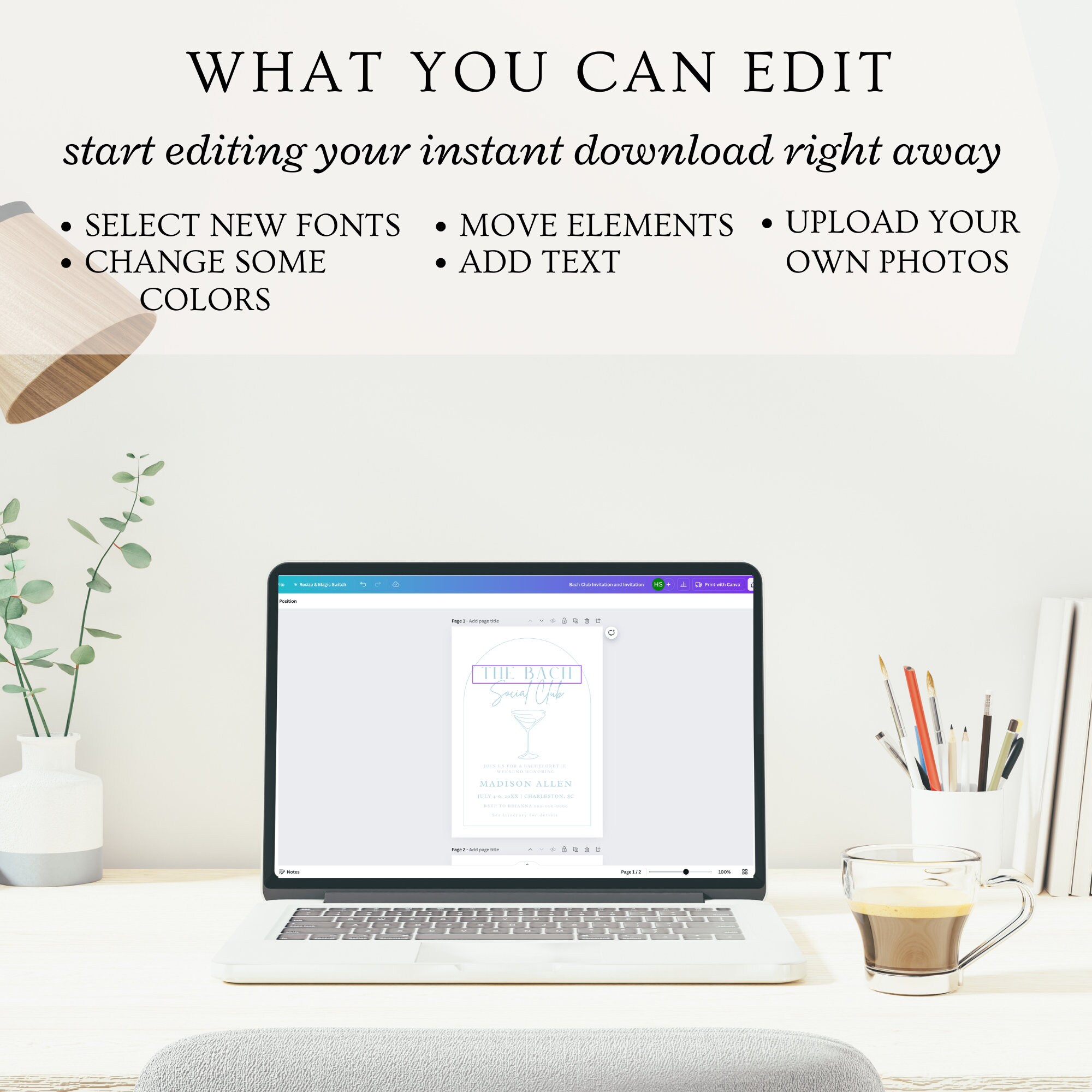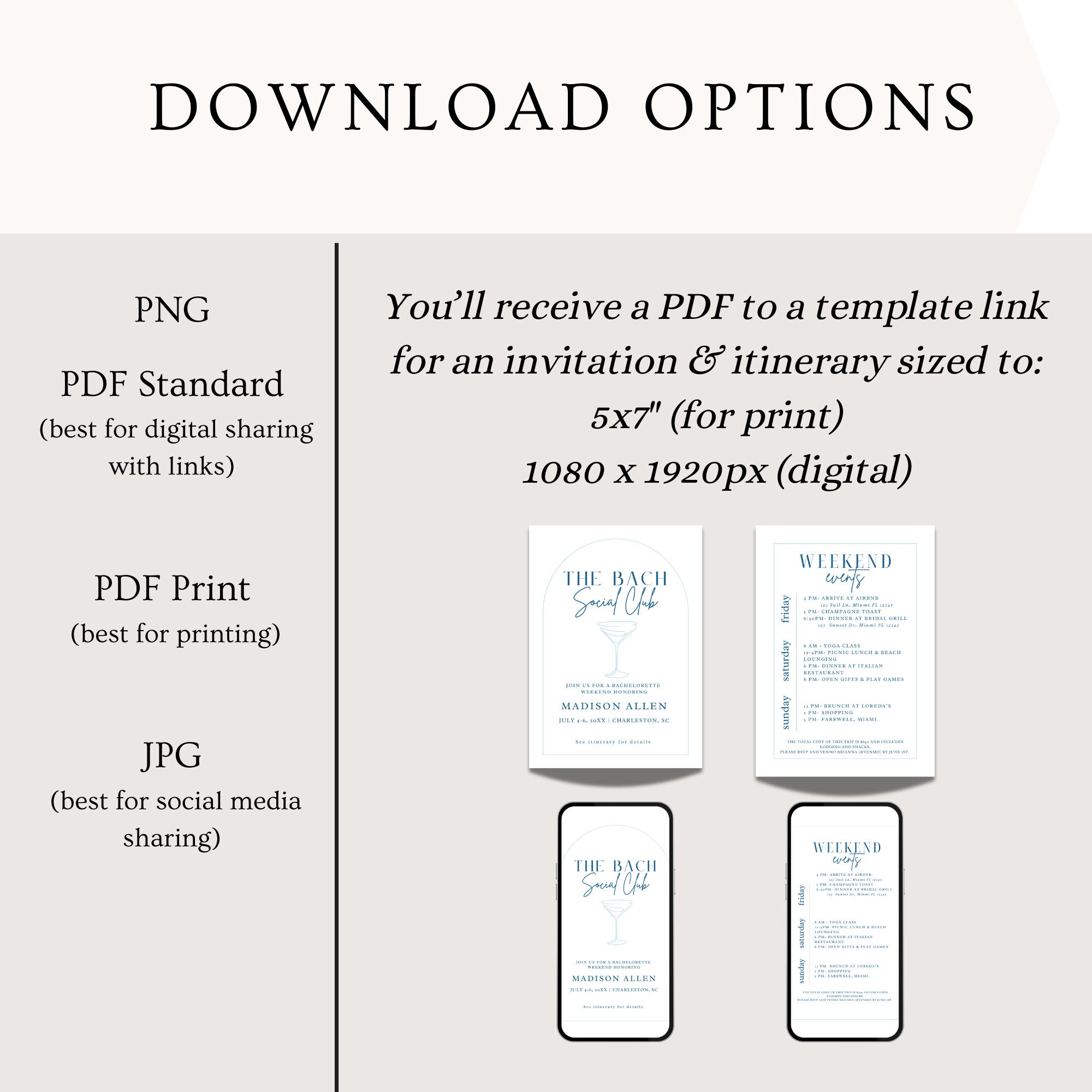 Get ready to celebrate with our Bach Social Club Bachelorette Invitation and Itinerary templates! Whether you're planning a coastal bachelorette, beach weekend, or a fun bach itinerary, our customizable invitation templates on Canva have got you covered. With options to edit colors, fonts, and add a personal touch, these invitations are perfect for a hen party by the sea. Featuring a trendy sketched cocktail glass design and classic blue hues, it's the ideal choice for a last toast on the coast with your favorite gal pals. This invitation and itinerary template is sized to 5x7, includes a digital 1080x1920px version, and comes with 9 editing tutorial videos.