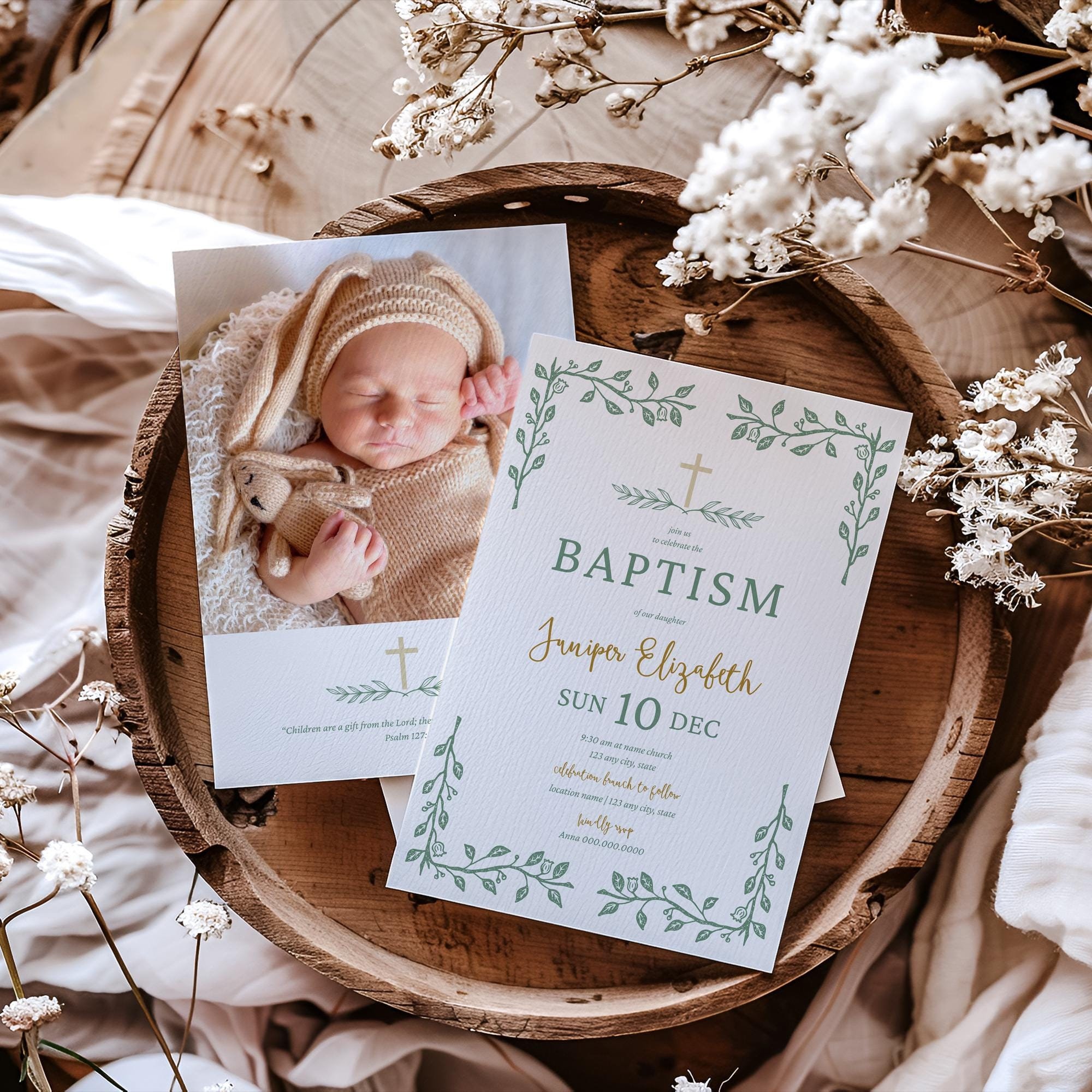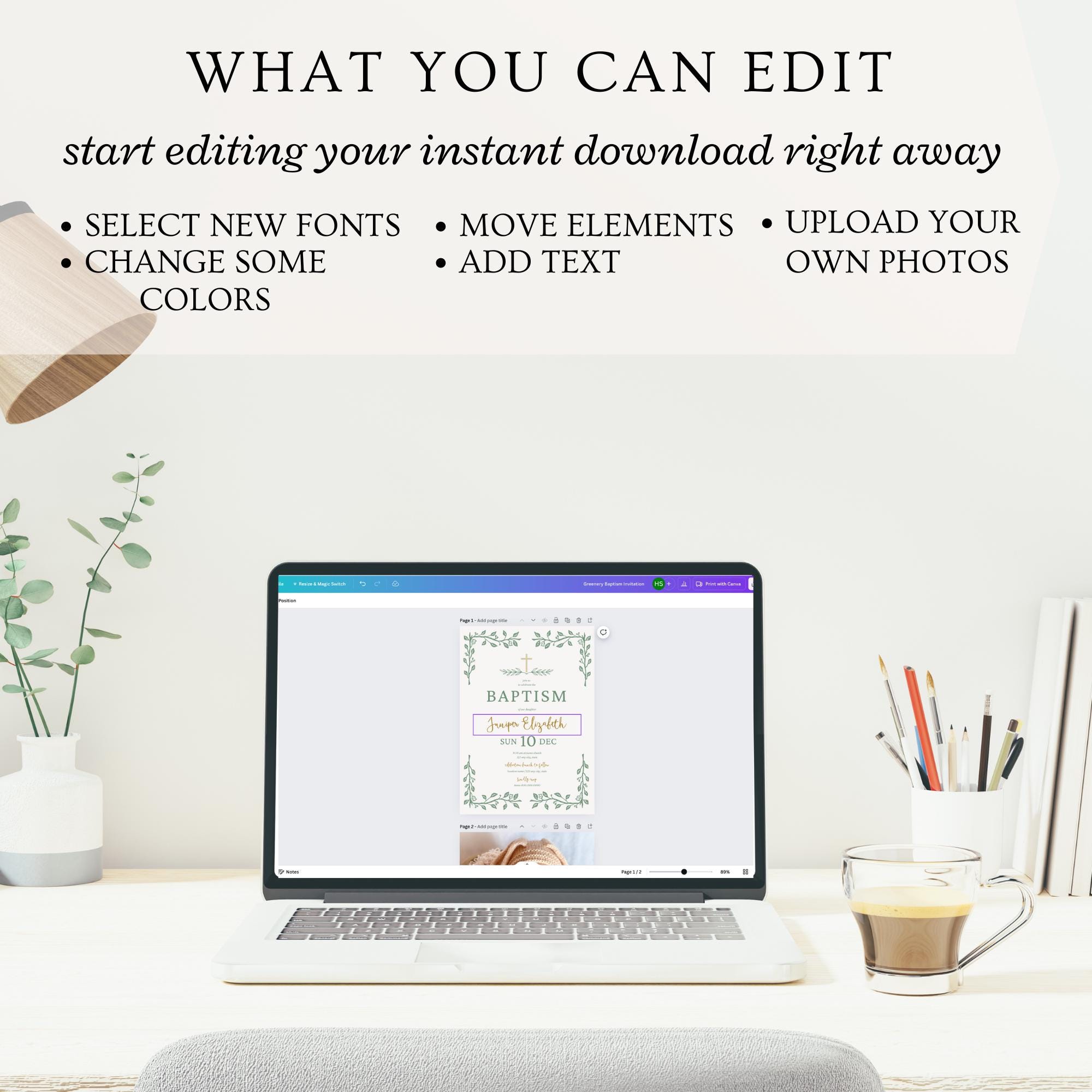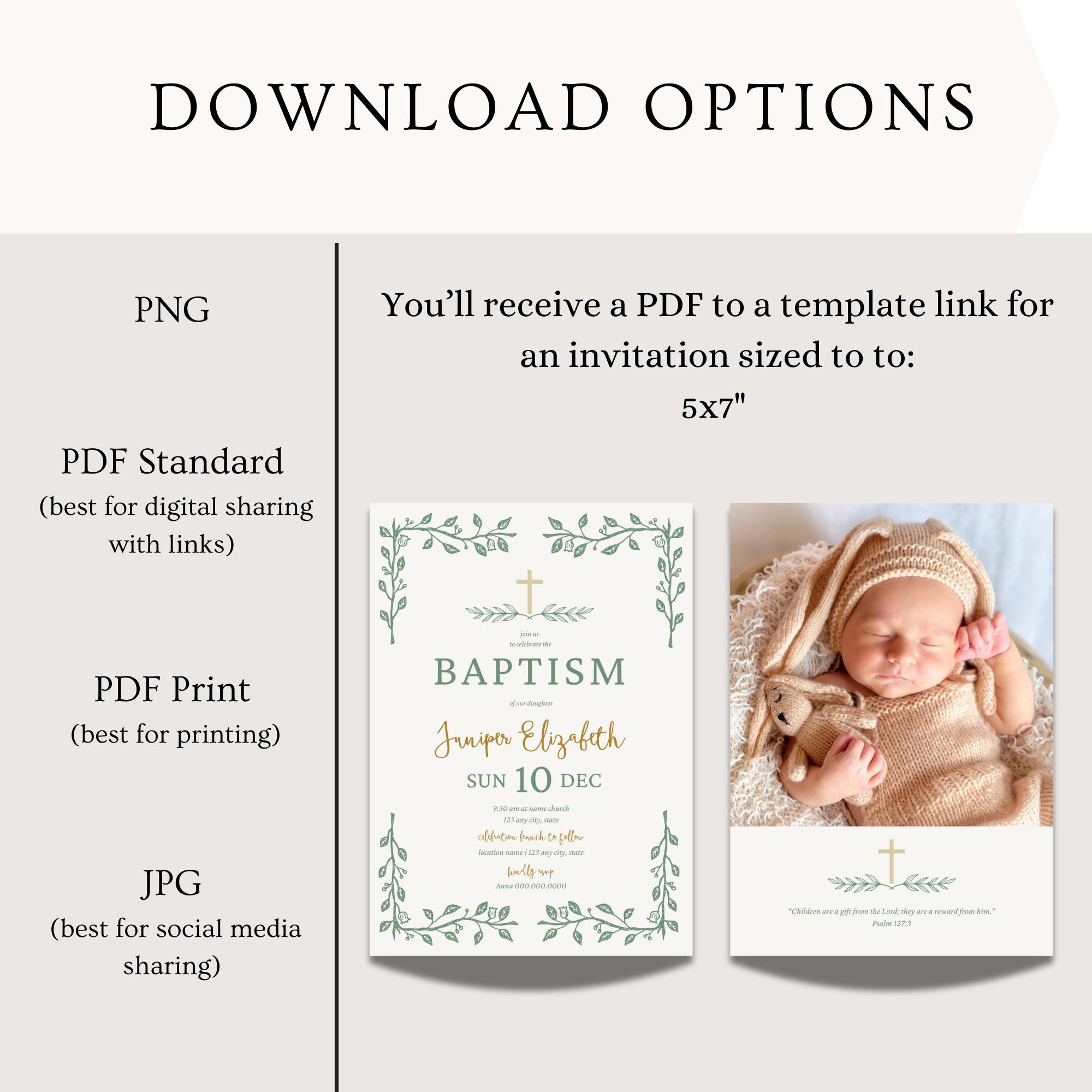This Baptism Invitation is designed to beautifully celebrate this special occasion for son or daughter. It features a foliage border, calligraphy typefaces, and a cross. All colors and fonts are completely customizable- choose any color to match your celebration theme, gender, or season of the year. Choose to add your child's photo to the back of the invitation for extra charm! This invitation is effortlessly editable on Canva, but if you're new to editable stationary, it comes with 9 videos. Sized to 5x7."