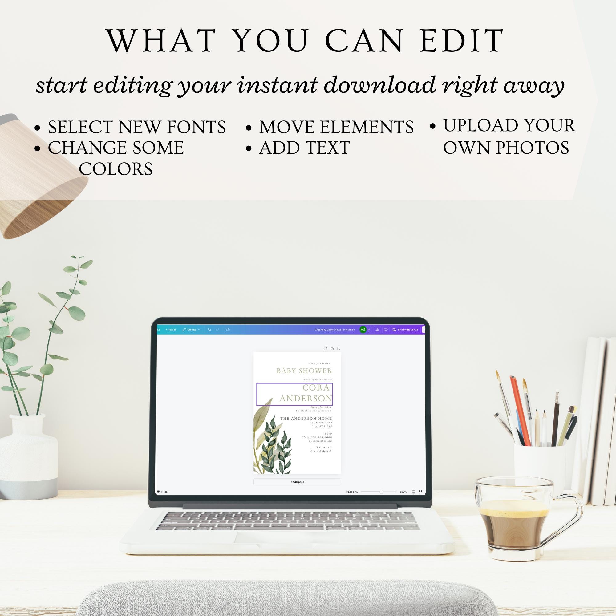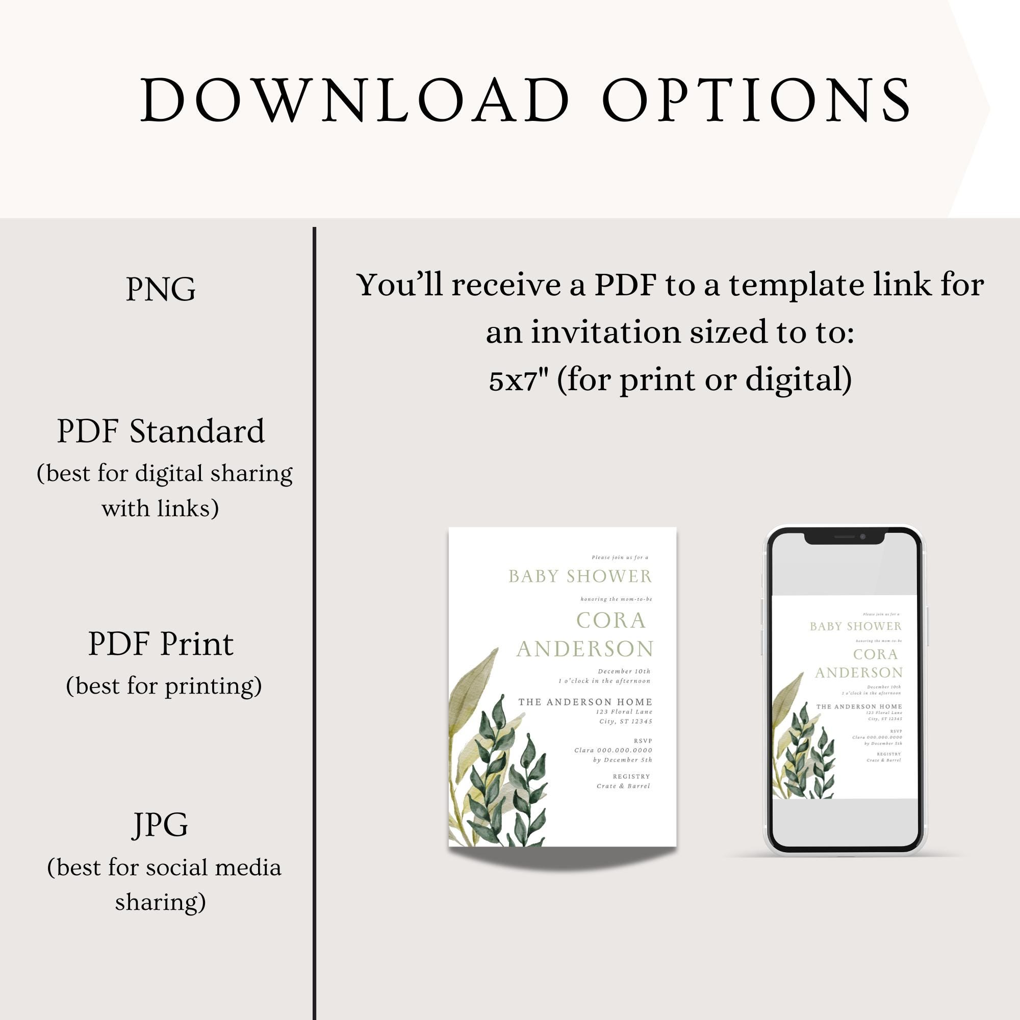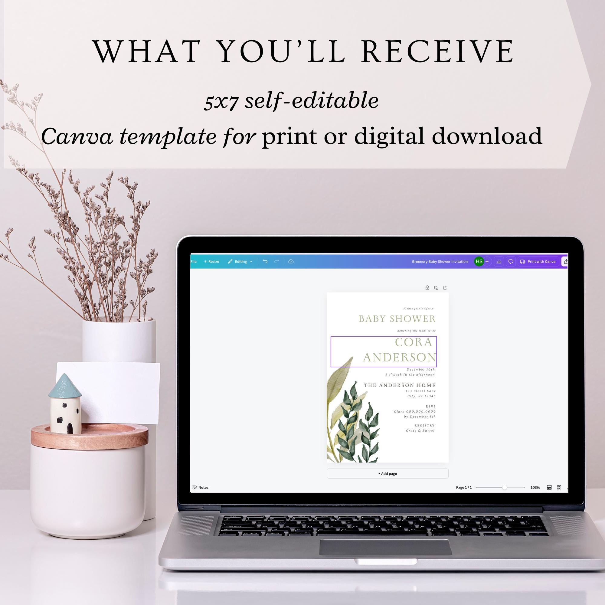 Celebrate your baby shower or sprinkle with our Greenery Baby Shower Invitation! This charming baby shower invite features a beautiful watercolor foliage design that perfectly captures the essence of Christmas winter botanicals, making it ideal for any theme, whether you’re welcoming a girl or boy. Our simple, cute, and trendy design can be easily customized with our DIY editable Canva template, allowing you to create a one-of-a-kind invite in no time. Plus, with instant download options, you can print it at home and get started on your celebration right away! Perfect for those who love boho style, this greenery design is sure to impress your guests and set the tone for a memorable baby shower. This template is sized to 5x7 and comes with 9 editing tutorial videos.