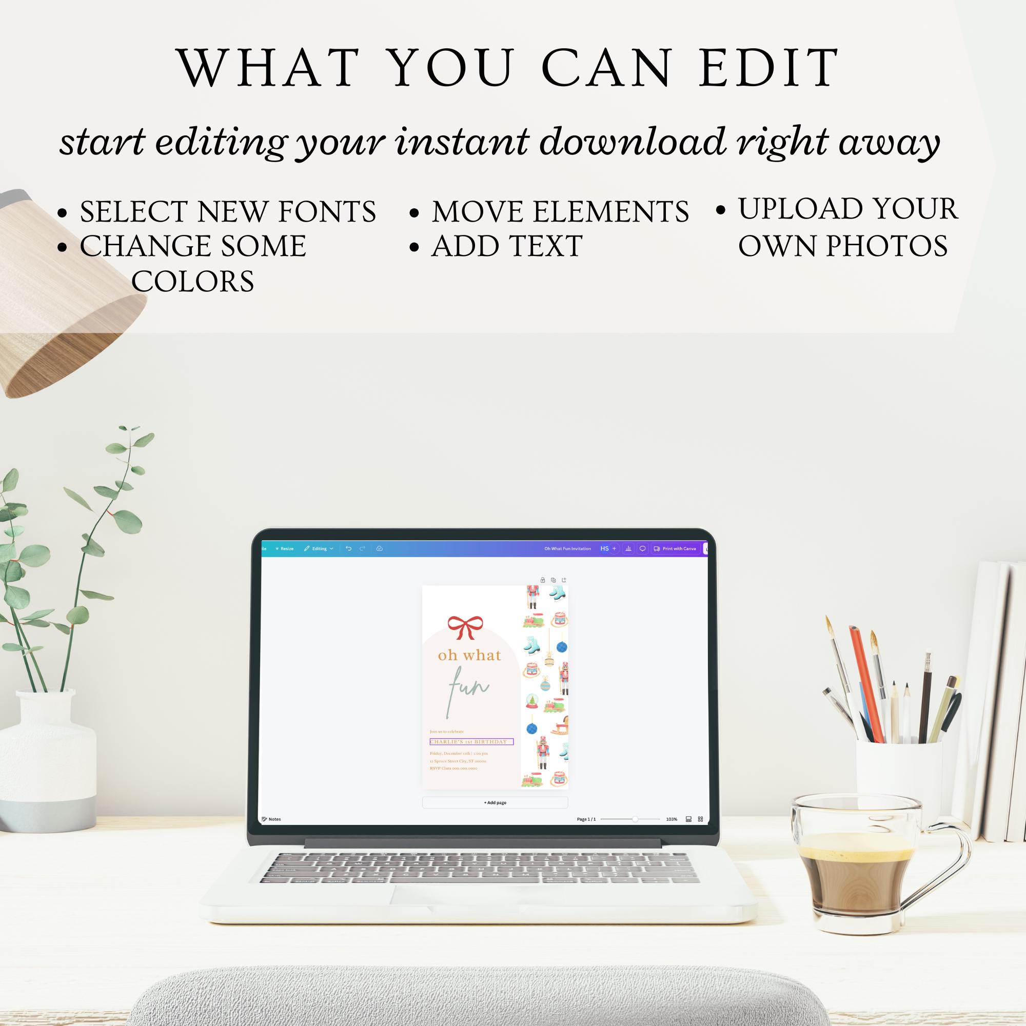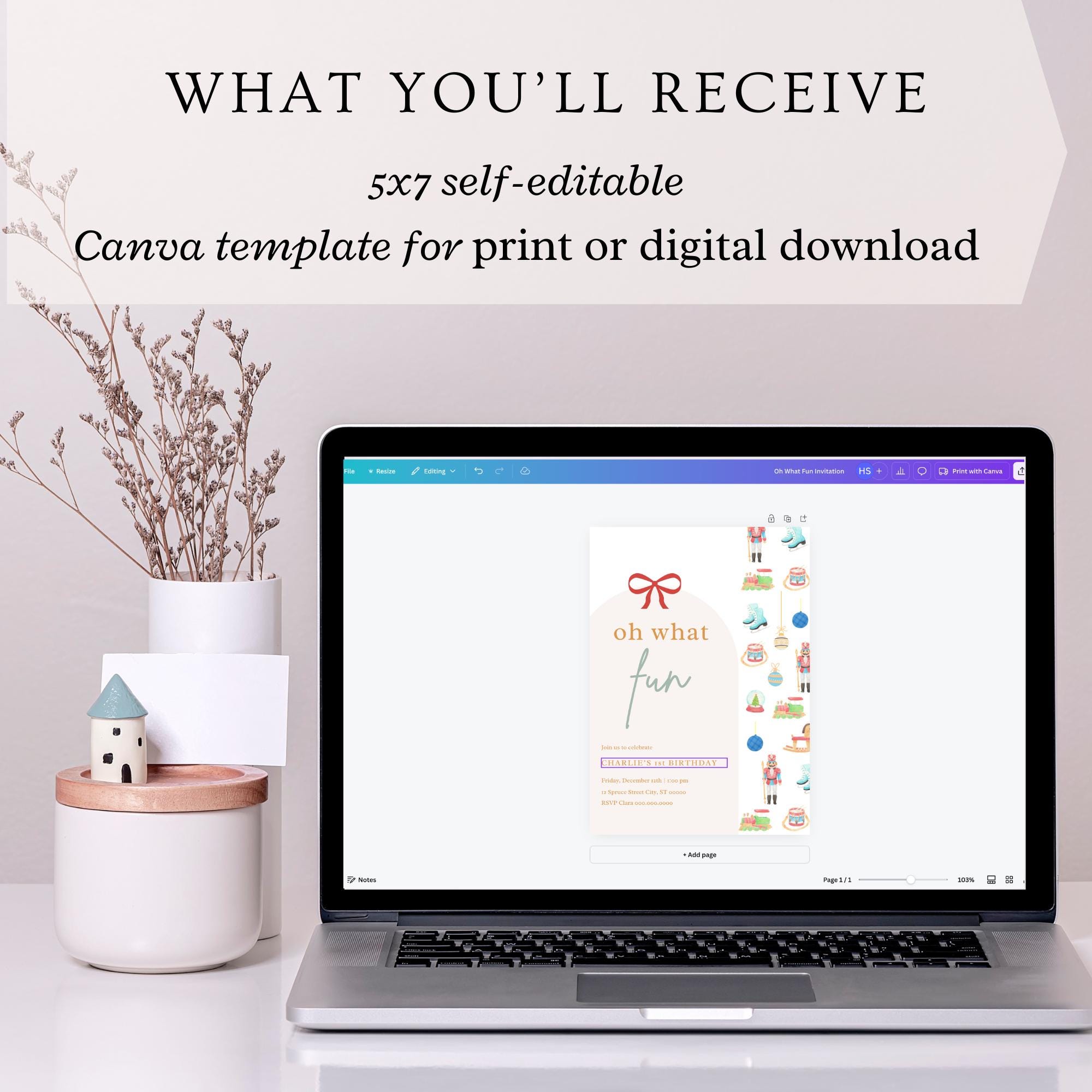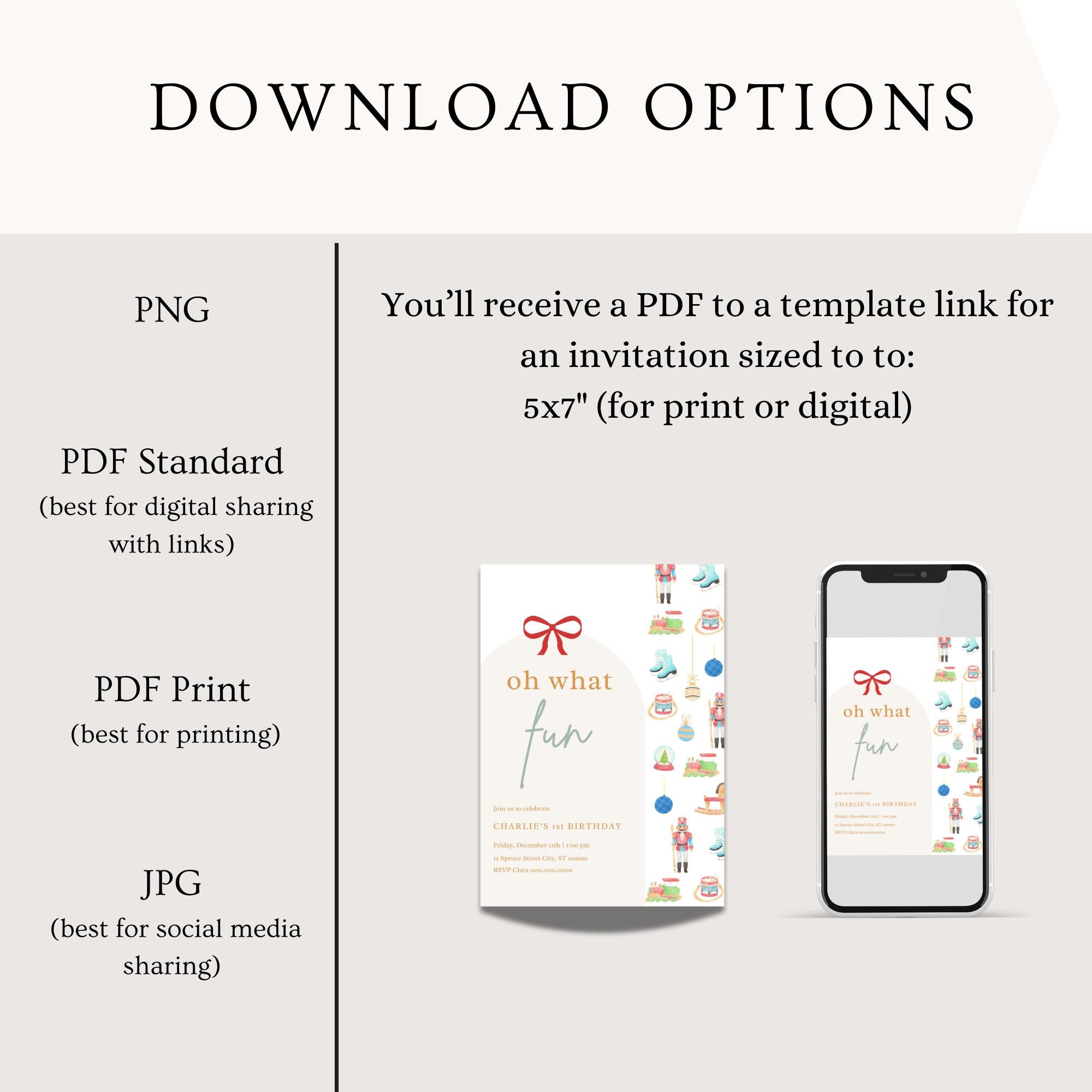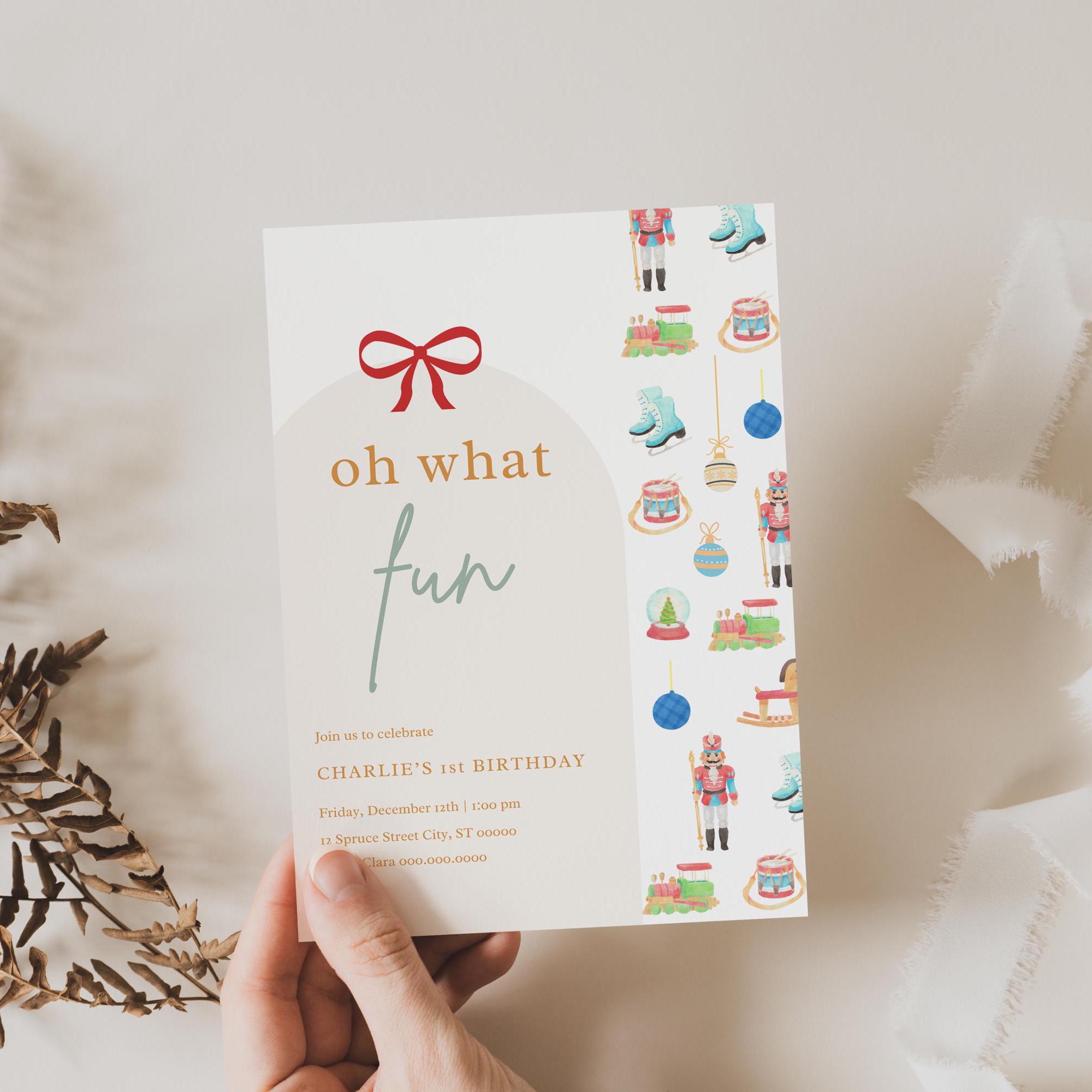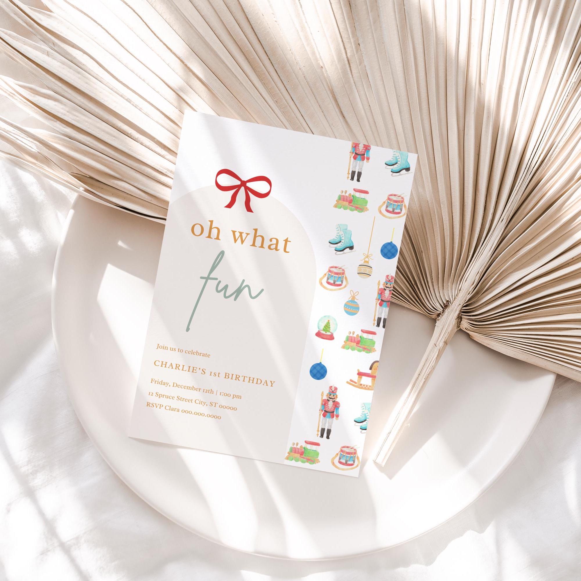 Celebrate your little one’s first year with this whimsical Oh What Fun birthday invitation! Bursting with Christmas charm and Nutcracker nostalgia, this editable Canva template is perfect for a joyful holiday birthday party filled with toys, sweets, and festive cheer.