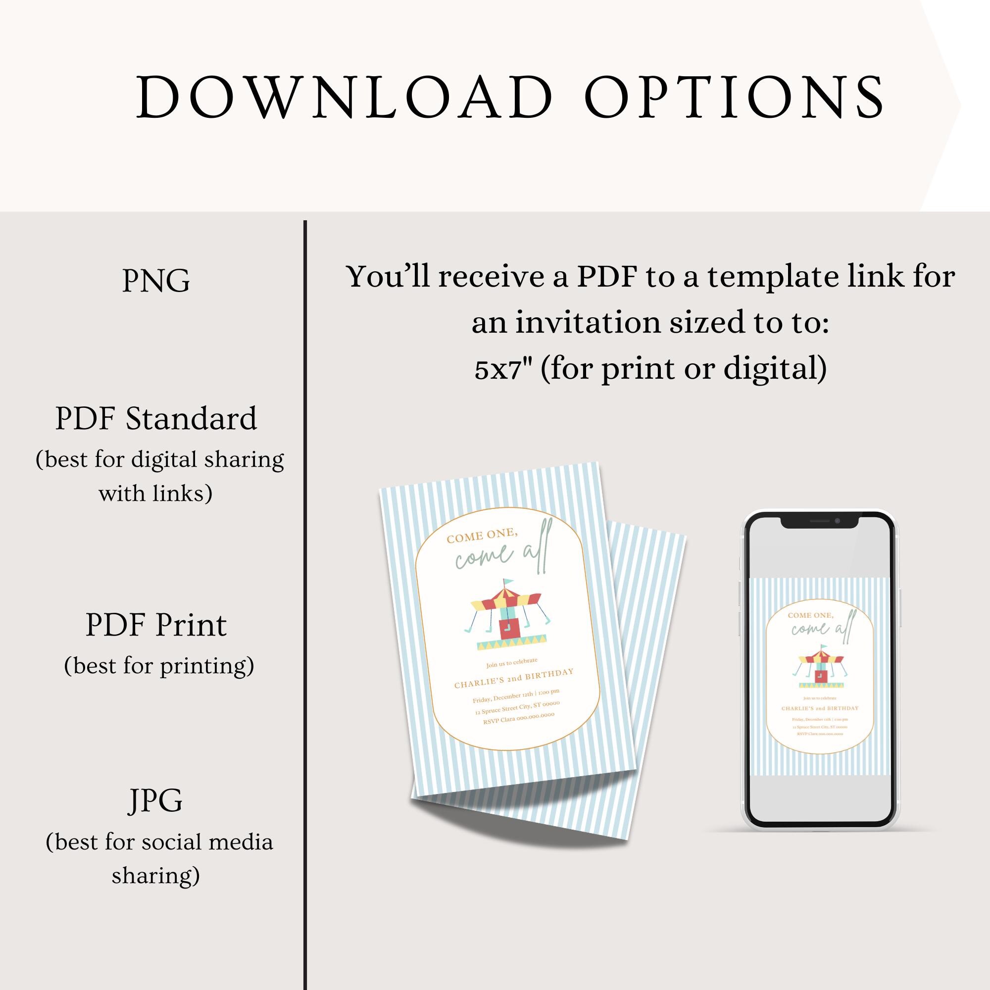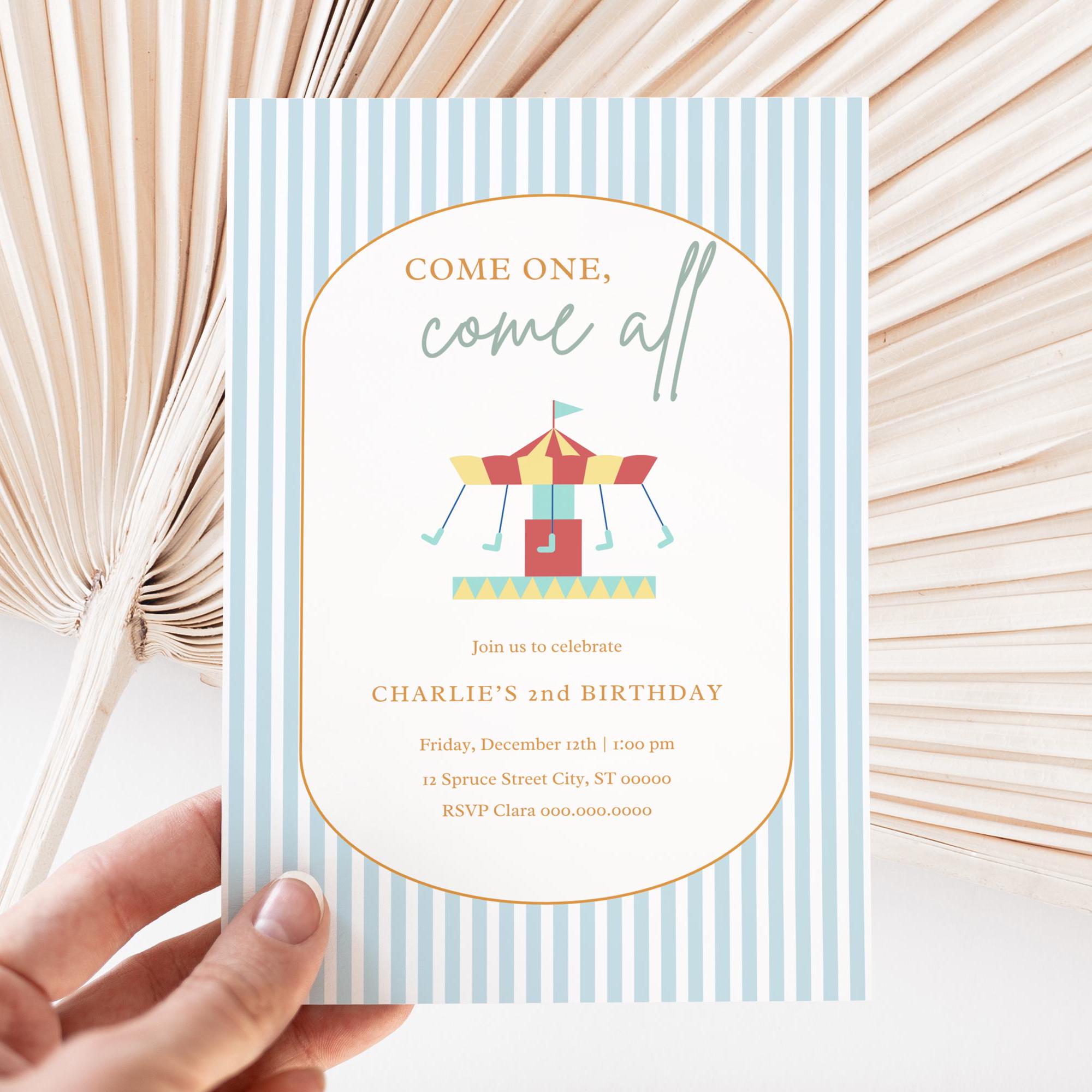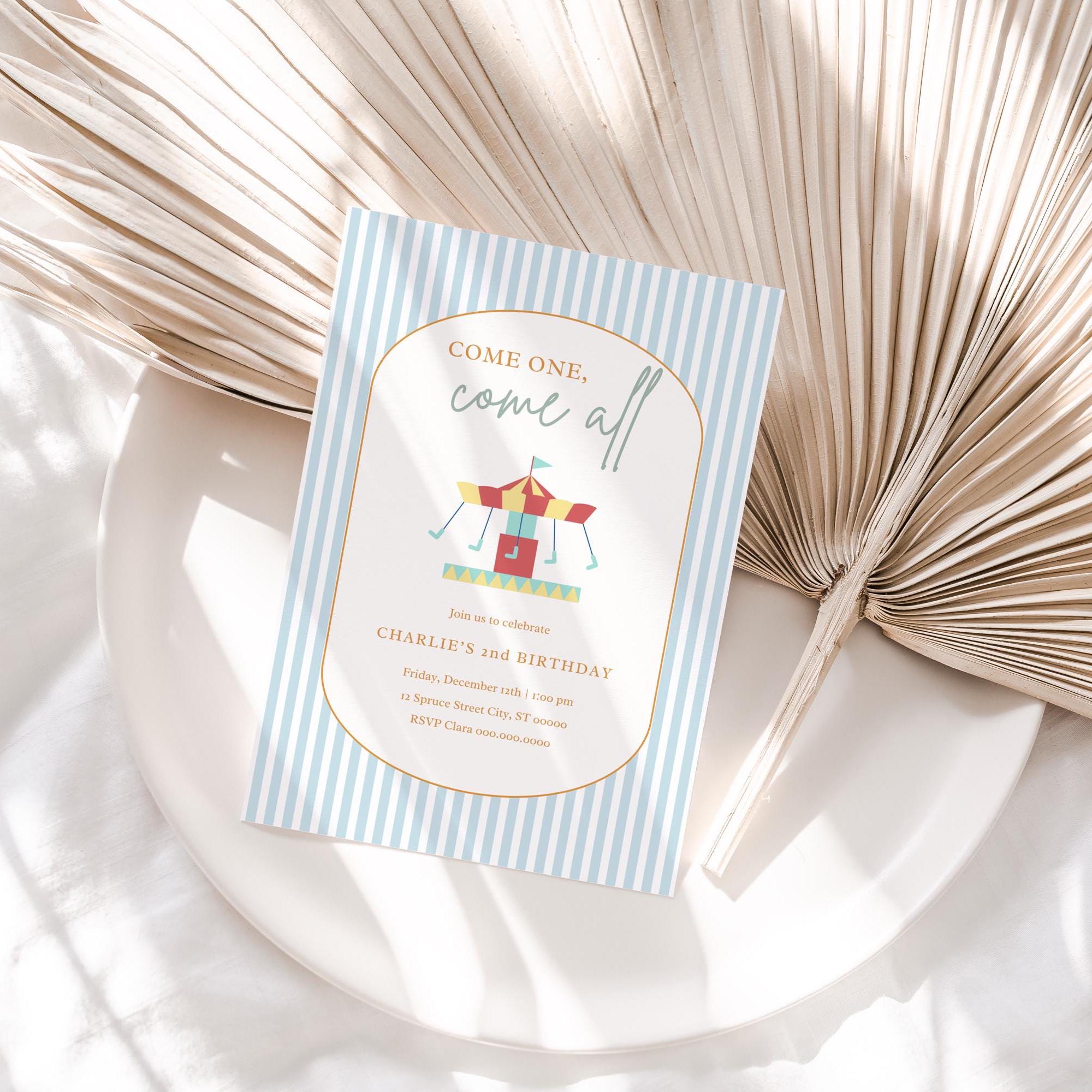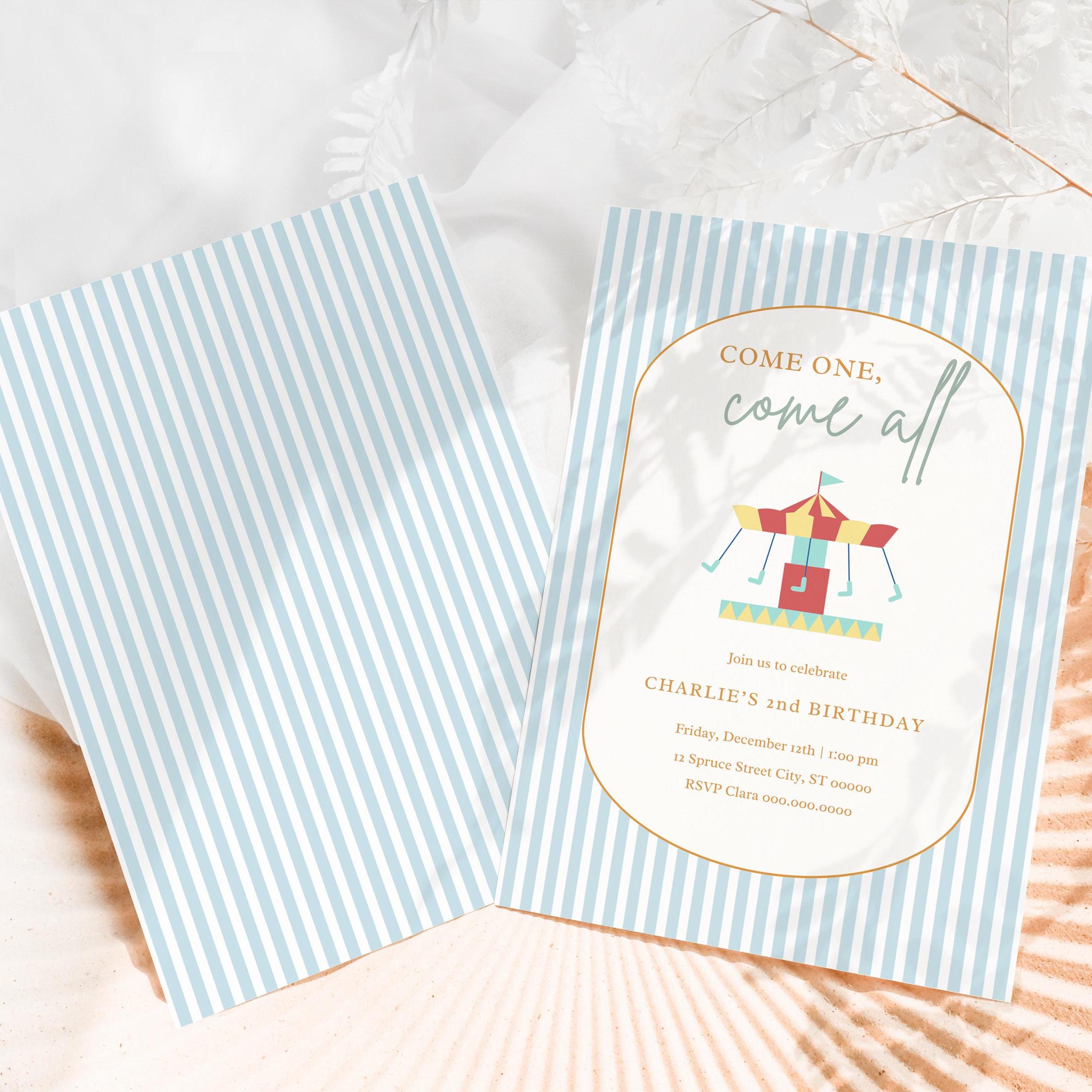 Make your child's birthday celebration unforgettable with our pastel carnival invitation! This whimsical fair-themed invitation template is perfect for any birthday party, offering a boy-girl neutral design that appeals to everyone. With an instant download feature, you can easily edit it on Canva to add your personal touch and print it at home. The blue and yellow retro colors, combined with charming stripes and ride, create a simple, trendy, and cute aesthetic that will excite your guests. Capture the joy of a vintage circus while making your party planning a breeze with this delightful pastel carnival invitation! This invitation template is sized to 5" x 7" and comes with 9 free editing tutorial videos.