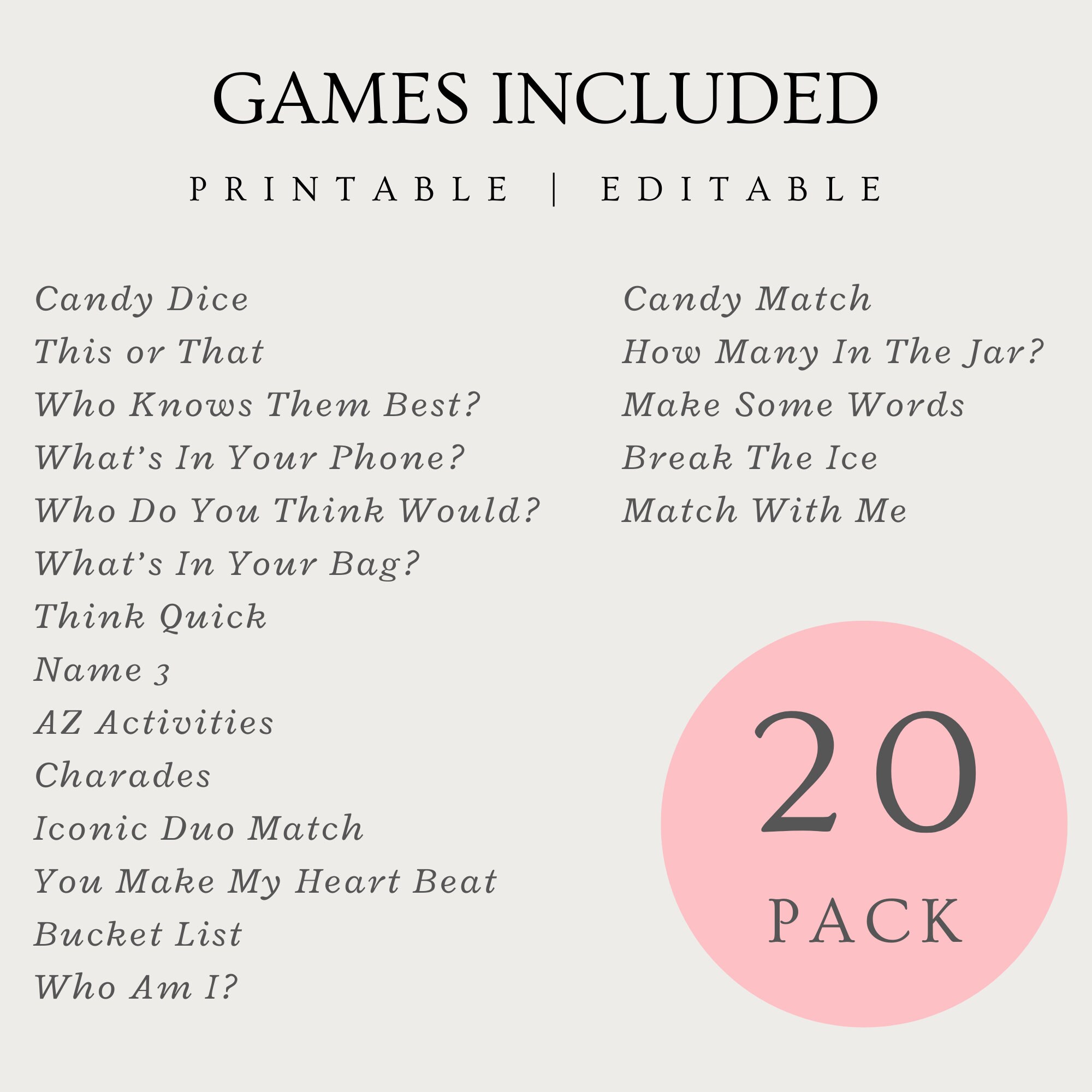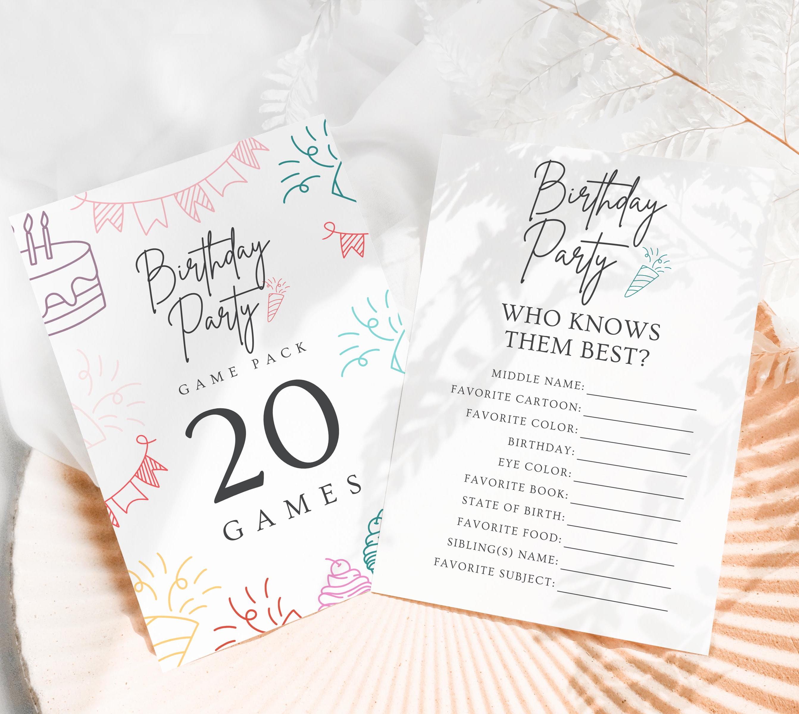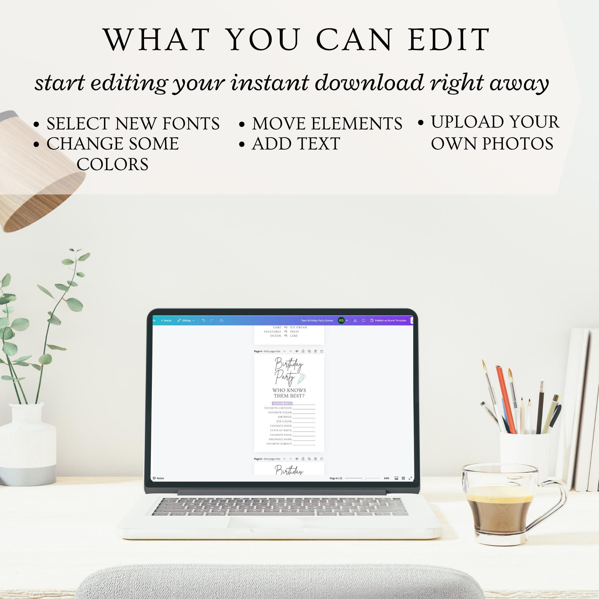 Our Birthday Games Bundle pack comes with 20 editable games, and features the favorite, "Who Knows The Birthday Girl Best?" These fun activities are all editable so you can customize them for the birthday girl, and will keep your guests entertained all night long. There's something for everyone! Plus, they're instant download and printable from home, so you can get started right away. Each game is sized to 5x7" and comes with 9 editing tutorial videos.