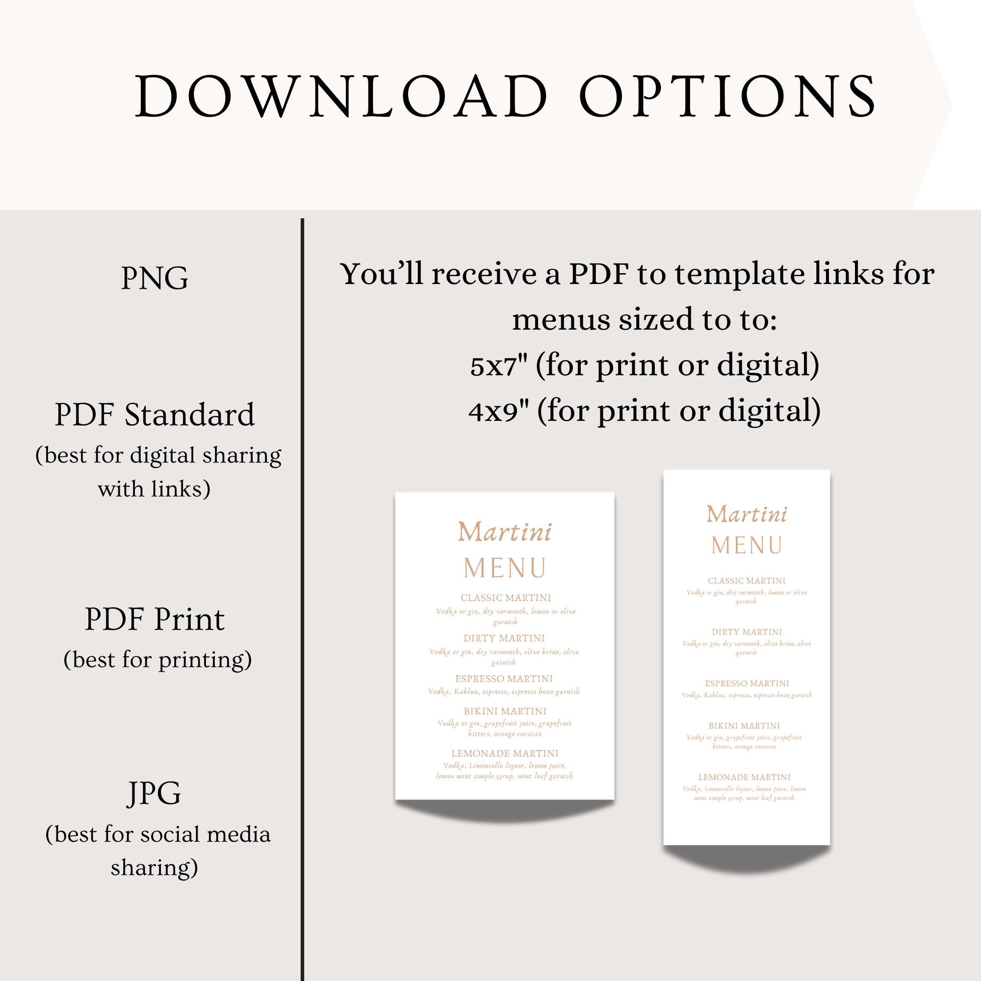 Celebrate that special milestone with our charming "Tiny Bit Older" cocktail menu! Perfect for themes like a martini birthday bash or a fun dirty thirty celebration, this customizable decor will add a touch of elegance to any adult birthday party, whether it's a 21st, 30th, or 40th. Our editable template means you can easily tailor the menu to fit your unique celebration, making it a delightful way to introduce and offer guests a martini of their choice. With an instant download option, preparing for your event has never been simpler. Two template sizes are included: 5x7" and 4x9", and they're effortlessly editable on Canva, but if you're new to editable stationary, they come with 9 tutorial videos.