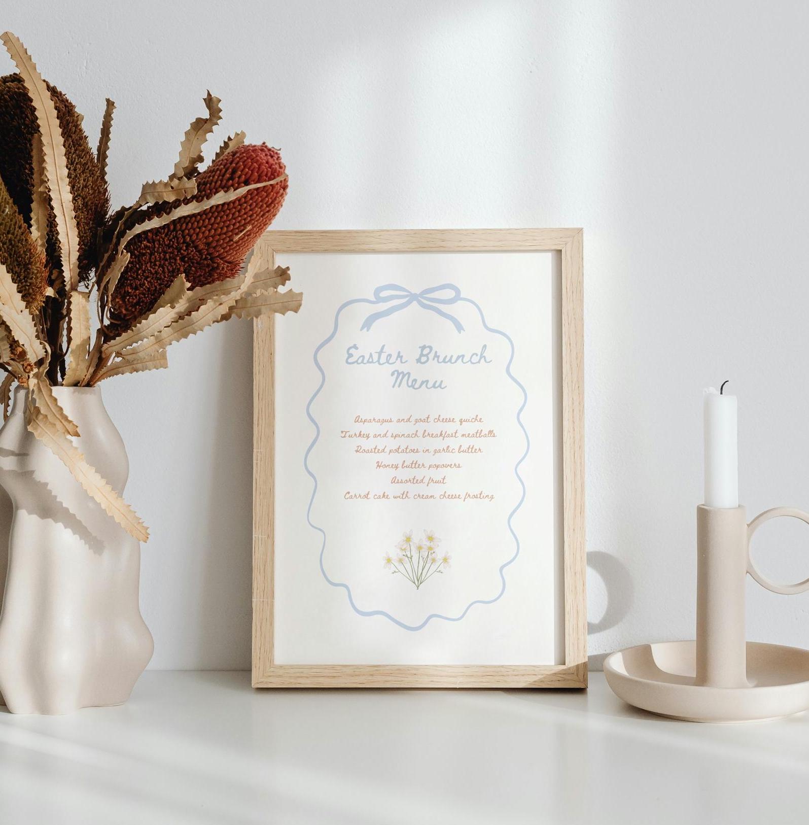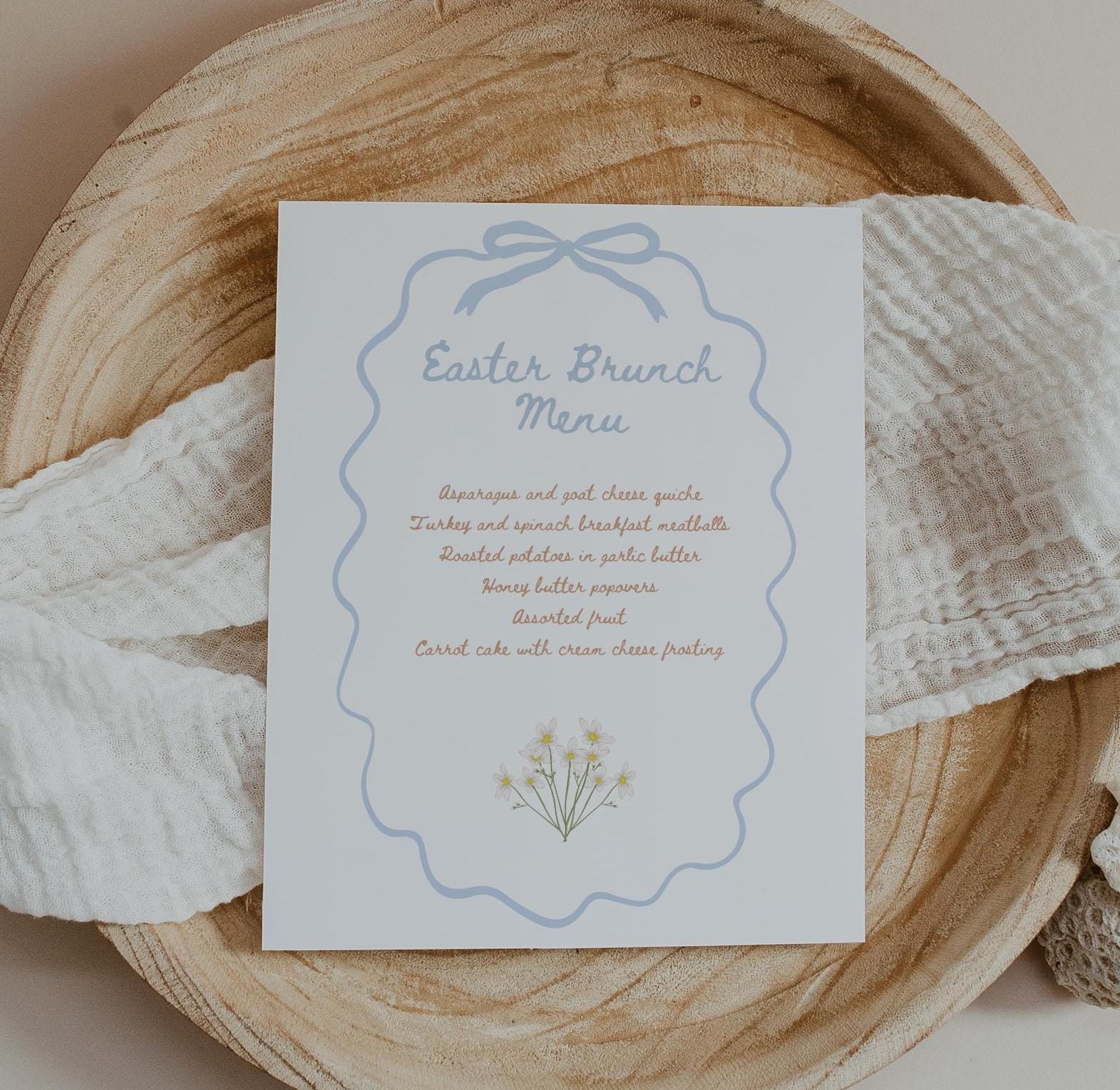 Celebrate the joy of spring with our Easter Menu sign! This charming and whimsical sign features beautiful florals and a delightful blue bow that will surely set the tone for your family gathering or church gathering. Whether you're planning a lovely brunch, lunch or dinner, our Easter brunch menu features a hand drawn typeface and soft spring colors in muted and pastel blue and beige. Plus, with the convenience of an instant download, you can quickly customize your menu and print from home. Menu is sized to 8x10" and includes 9 editing tutorial videos.