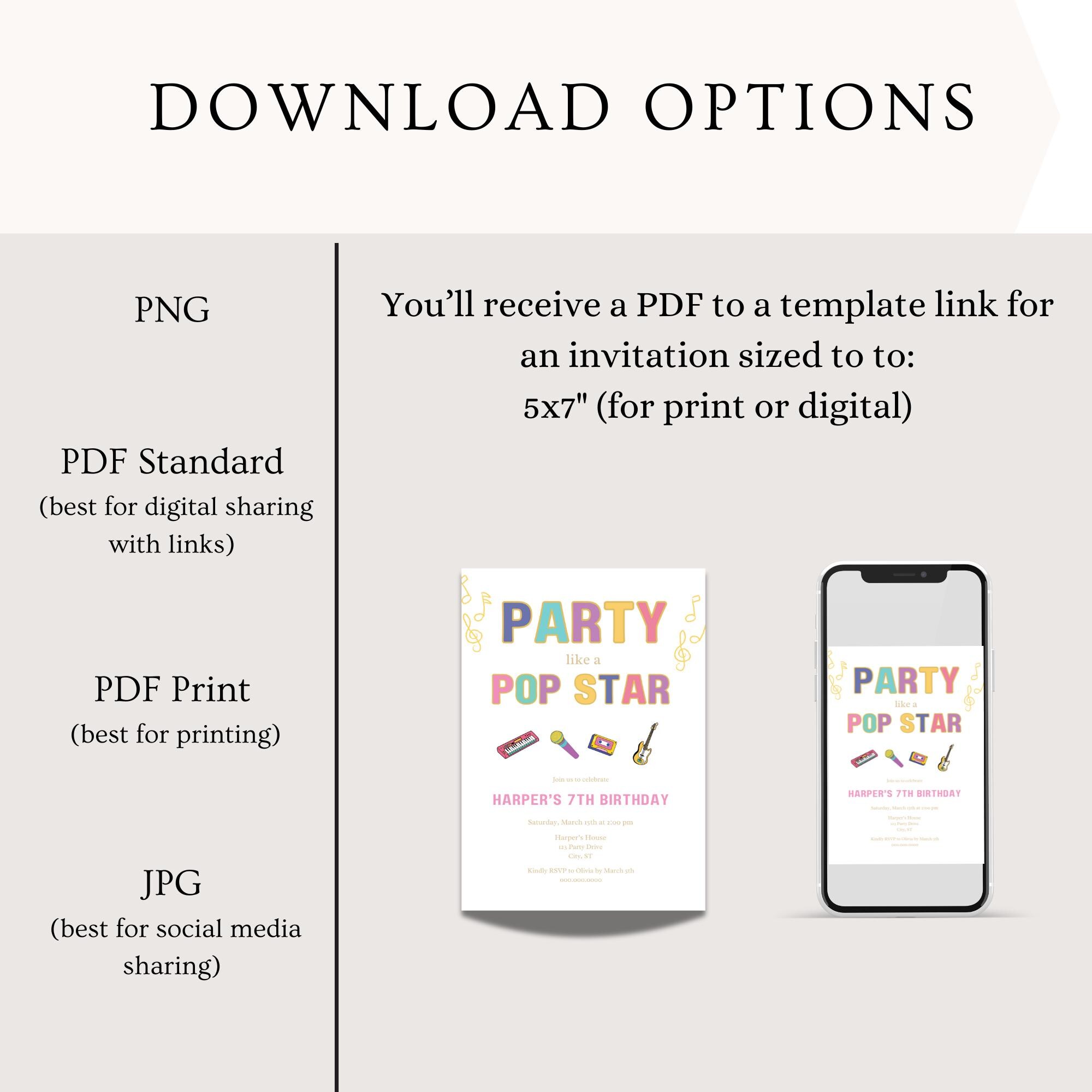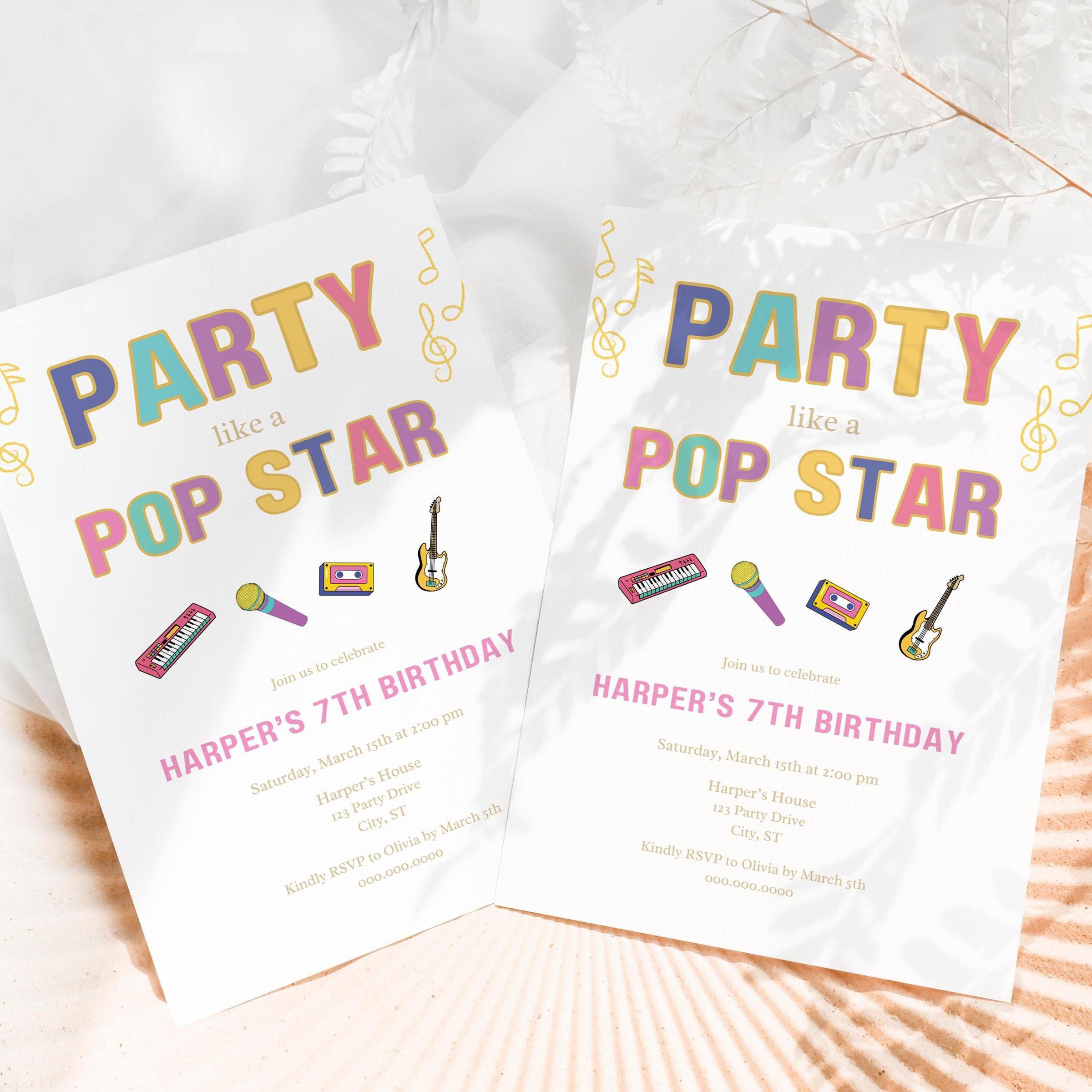 Celebrate your daughter's birthday with our "Party Like a Pop Star" Invitation! This vibrant and fun invitation is perfect for girls or teens who love singing and music, especially if they're fans of rock and roll from the 80s and 90s. With its rainbow colors and playful design featuring band instruments, it's sure to get all your guests excited for a birthday party or karaoke night like no other. This easy-to-use, editable template allows you to personalize every detail, making it a breeze to create a digital download that perfectly fits your celebration. Plus, you can print at home or send it as a printable evite. Template is sized to 5"x7" and comes with 9 editing tutorial videos.