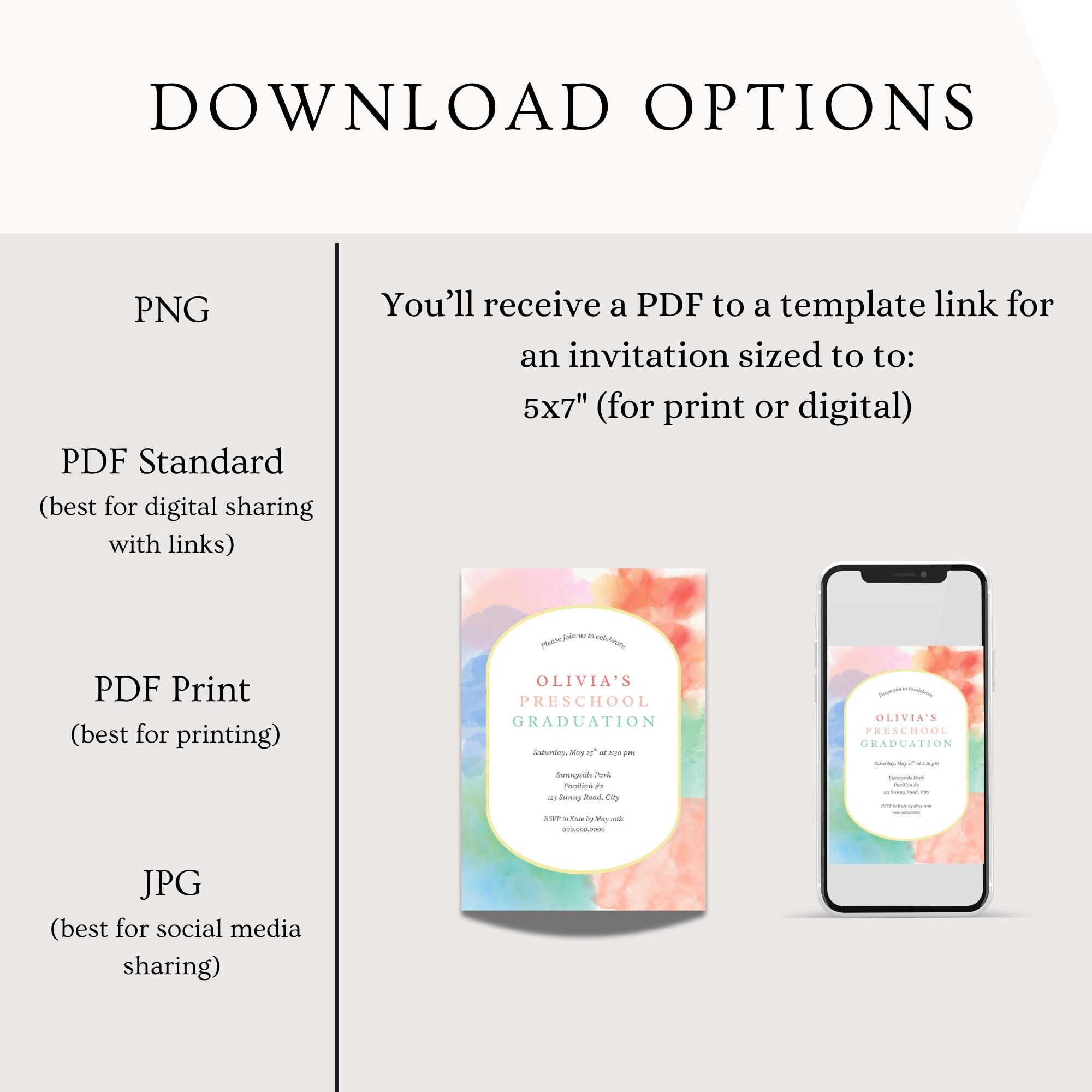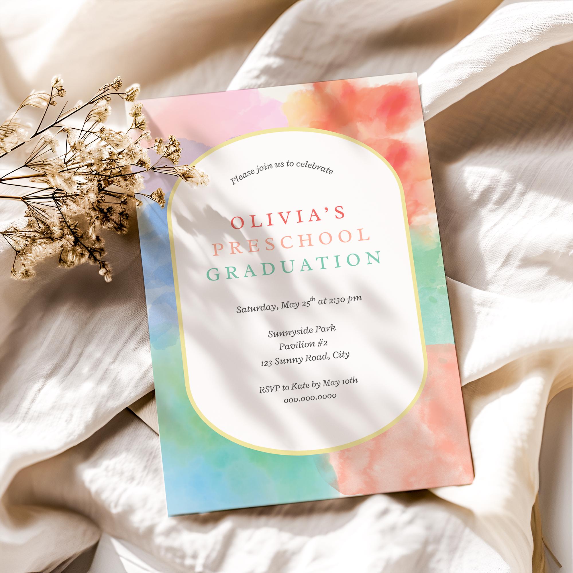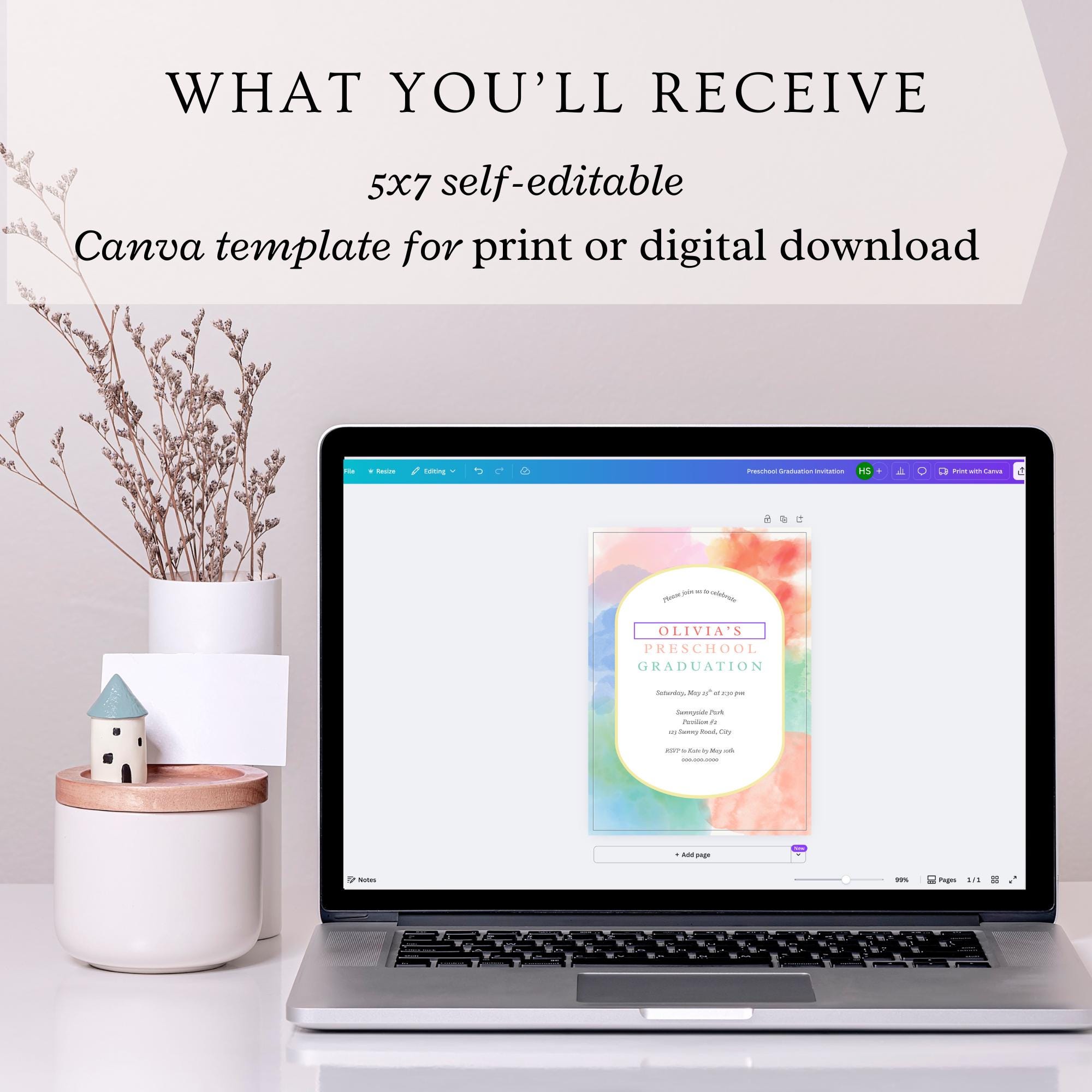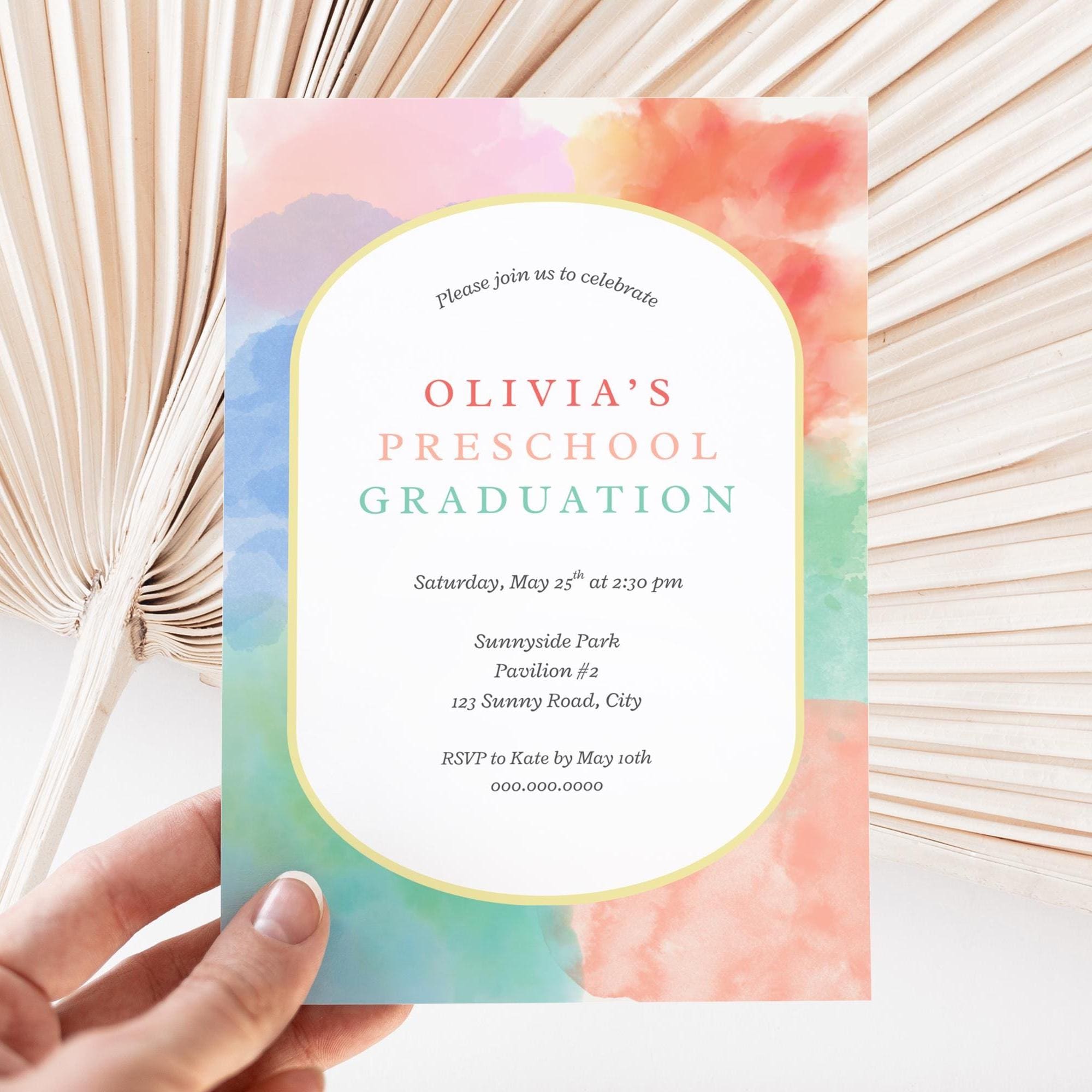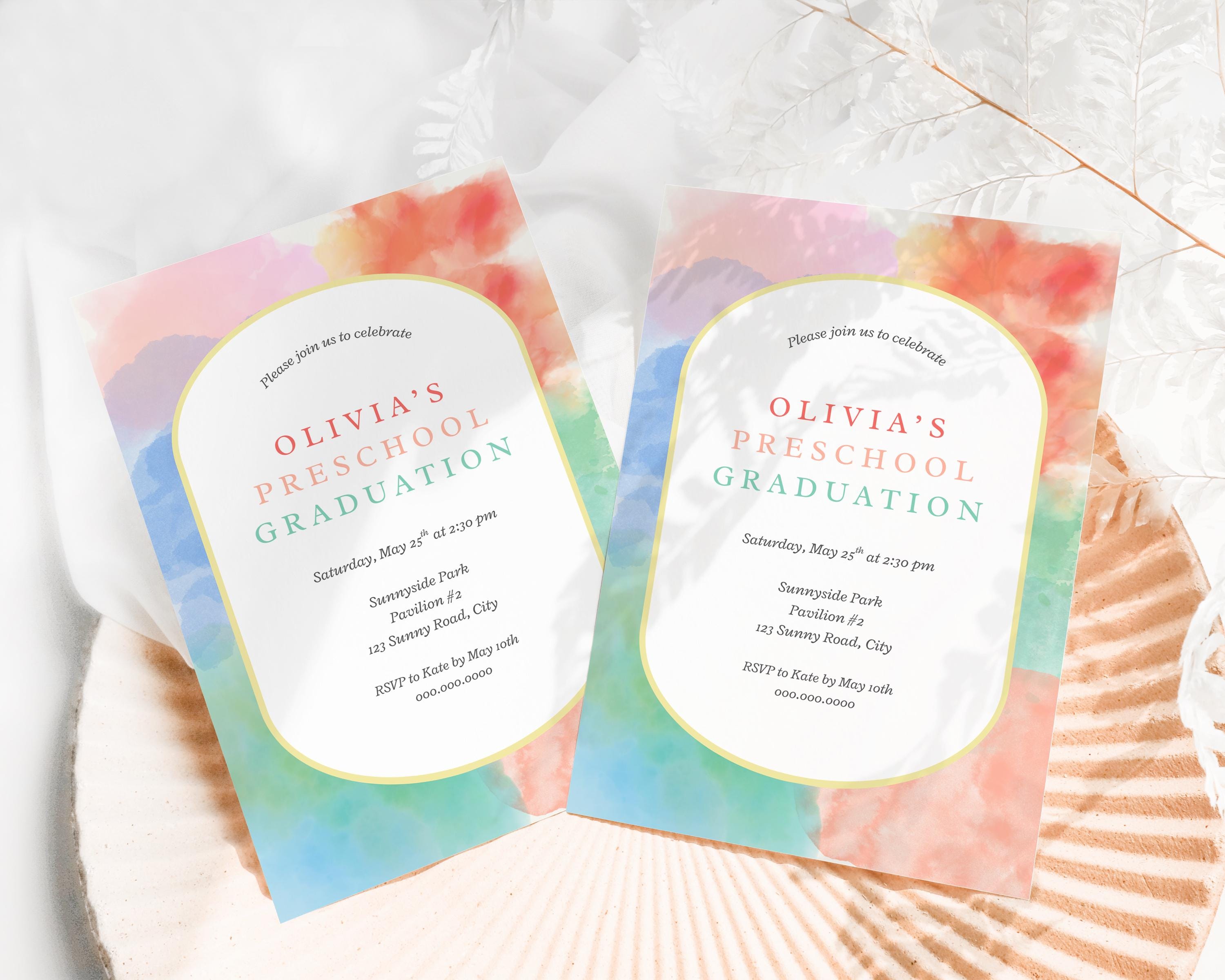 Celebrate your little one's preschool graduation with this digital download invitation template! This editable invitation is perfect for your kindergarten grad's ceremony party, featuring a stunning watercolor design in pastel colors that adds a touch of charm. Whether you prefer to send it digitally via evite, text, or email, or print it out for a more personal touch, this instant download gives you the flexibility you need. Easy to customize, this simple, trendy, and cute Canva template makes planning the perfect celebration for your kindergarten kids a breeze. If you're new to editable stationary, this template comes with 9 free tutorial videos! Invitation is sized to 5x7.