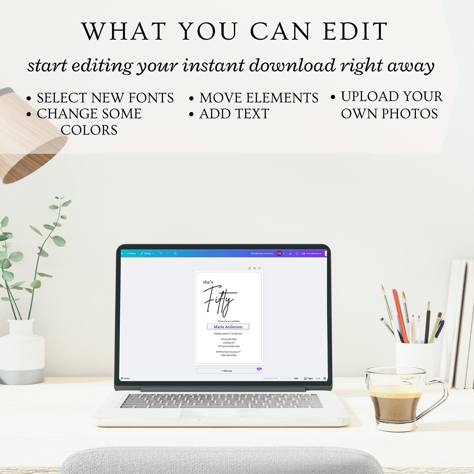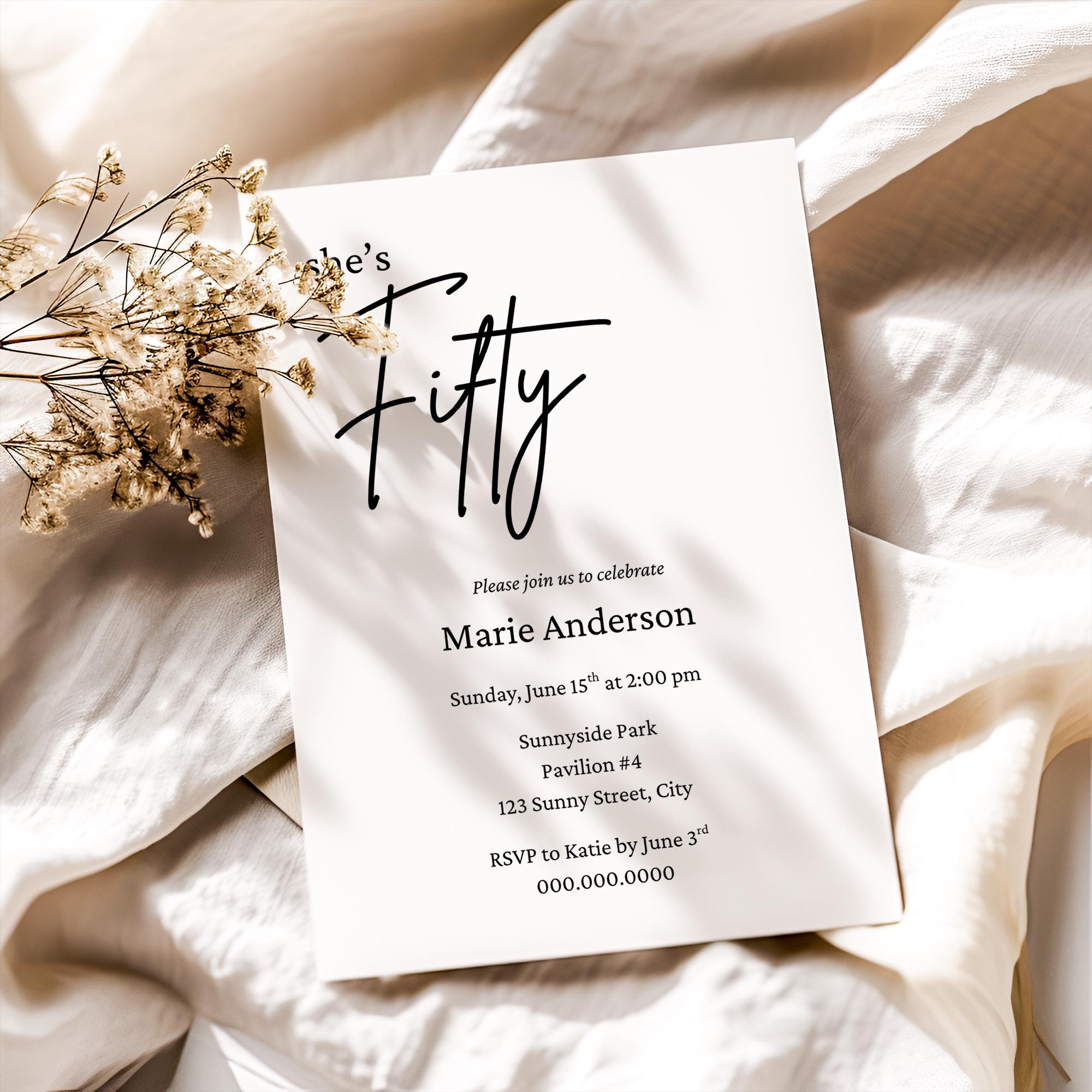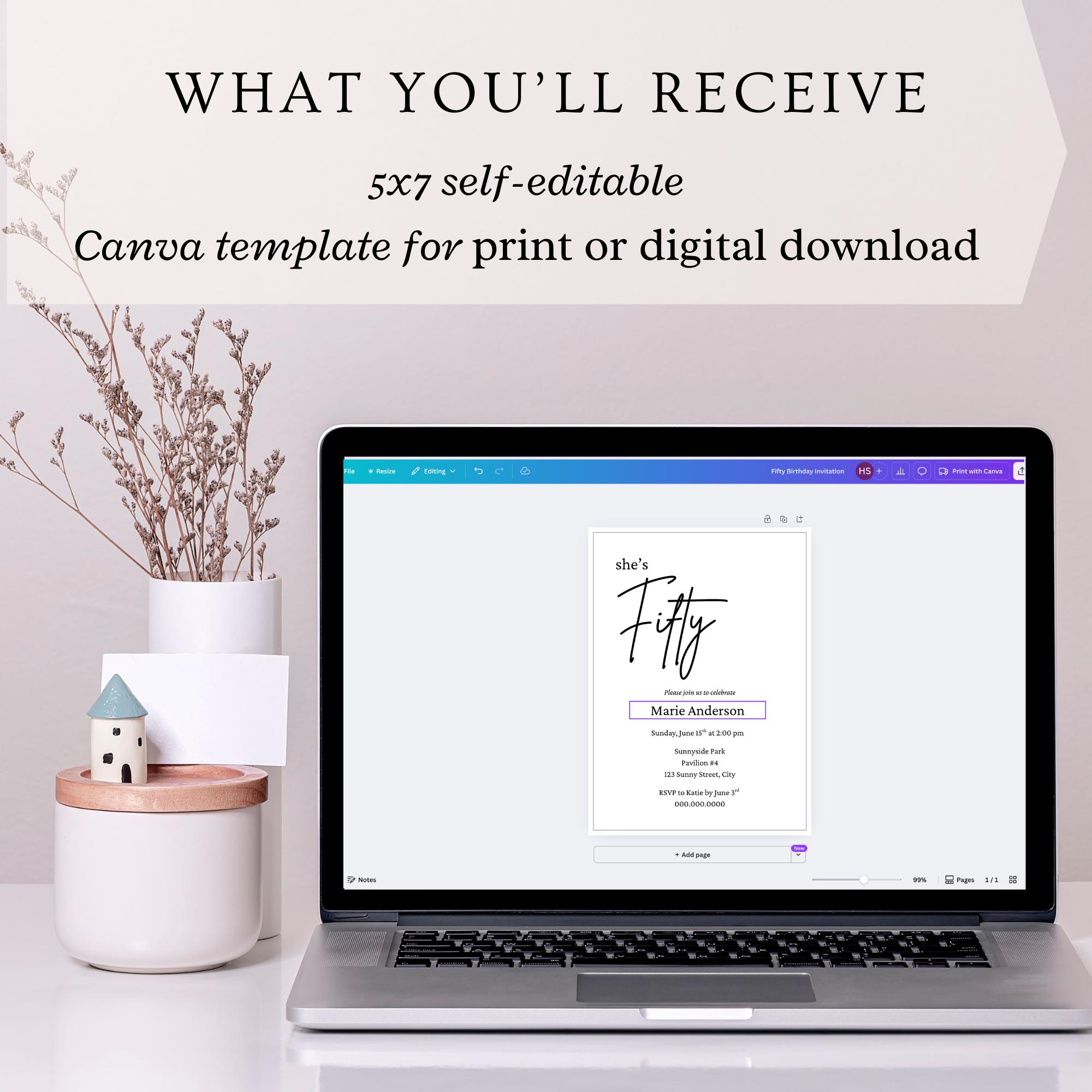 Celebrate the milestone of turning fifty with our beautifully designed downloadable invite for a 50th birthday party. Perfect for a dinner party or gathering, these invitations come in a minimalist black and white design that adds a touch of elegance to your fiftieth year celebration. With our editable template, you can easily customize the invites with your own details and colors, whether sending them via text message, email, evite or mail. Enjoy the convenience of instant download, allowing you to print at home and get your invitations out to friends and family in no time. This template is sized to 5x7 and comes with 9 editing tutorial videos.