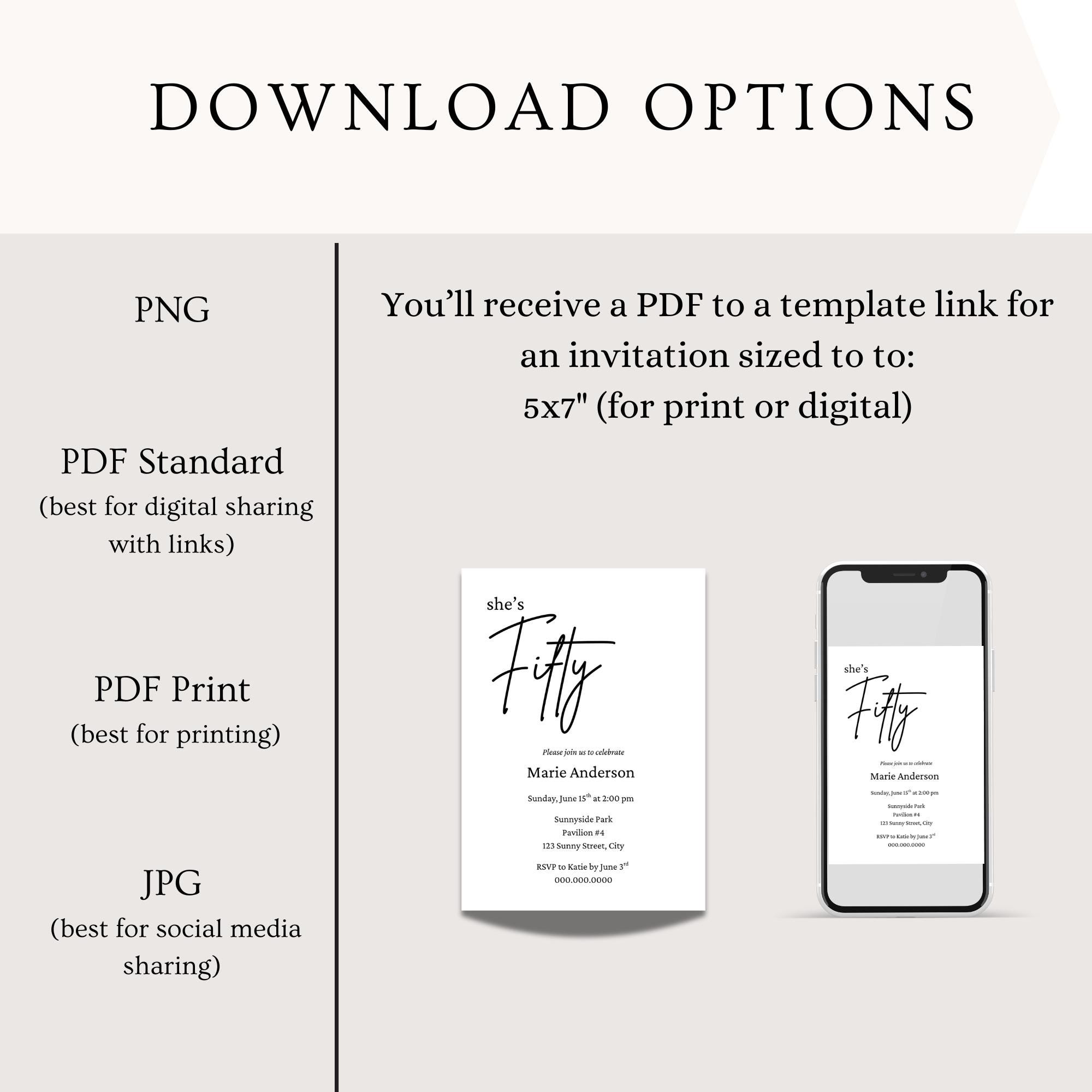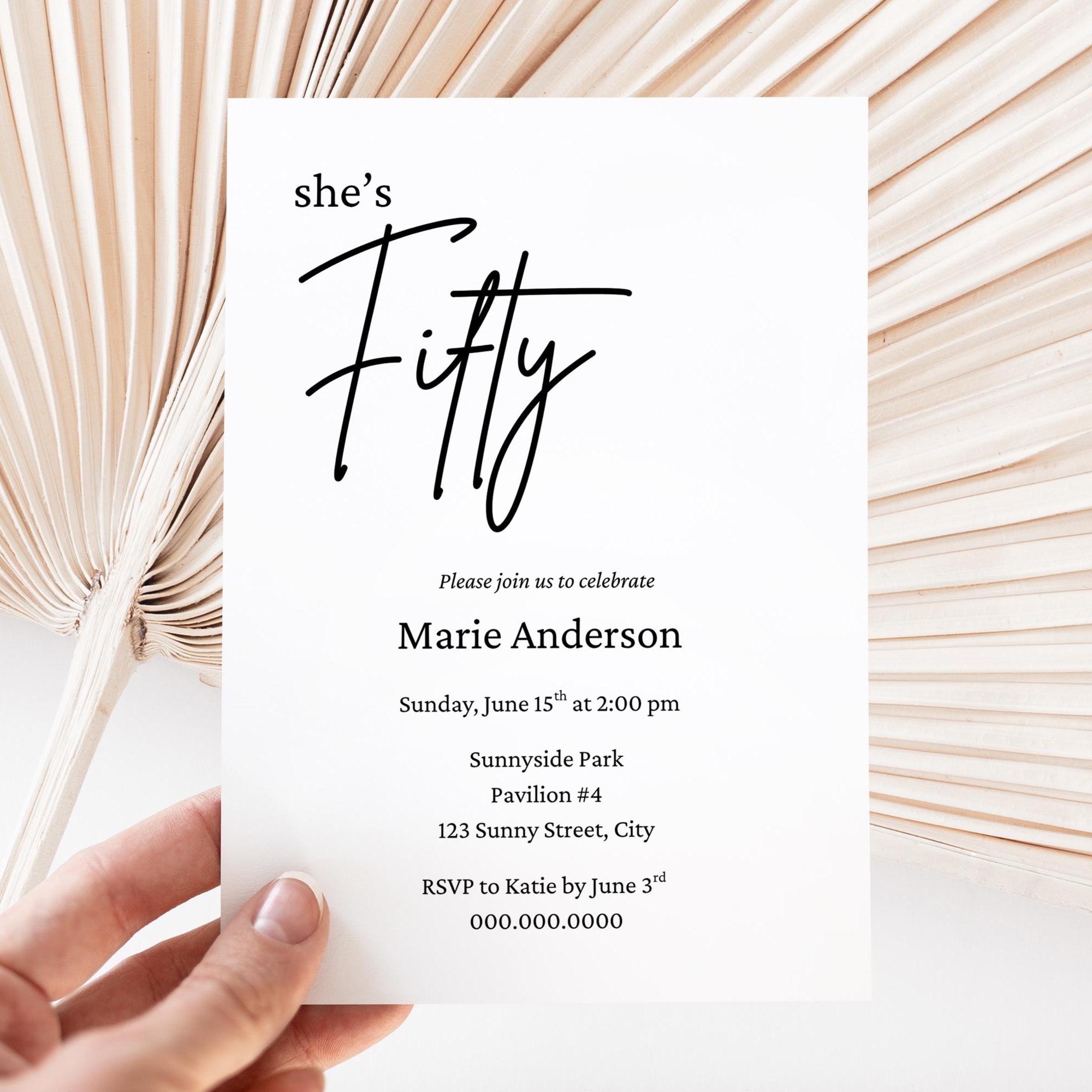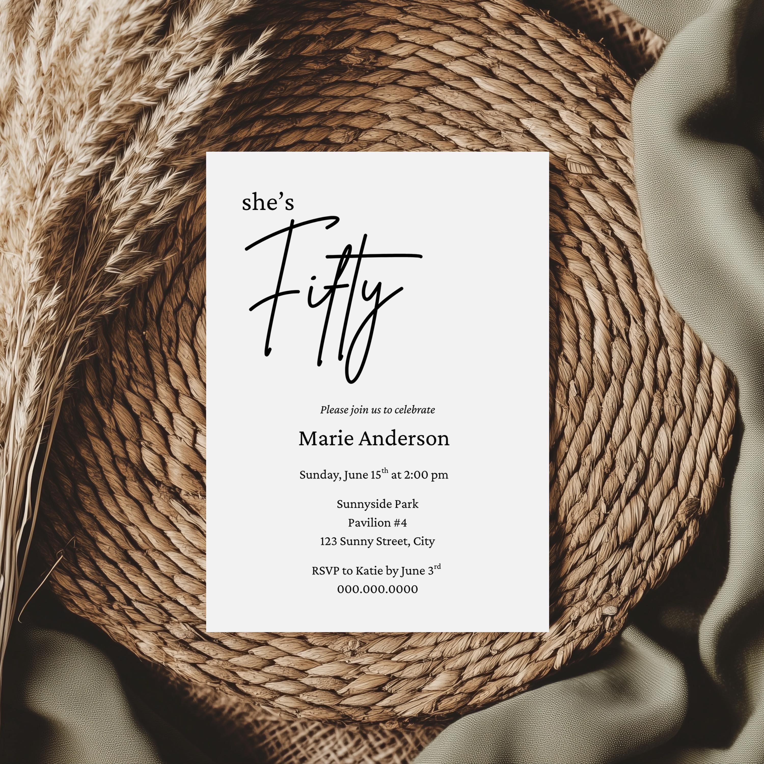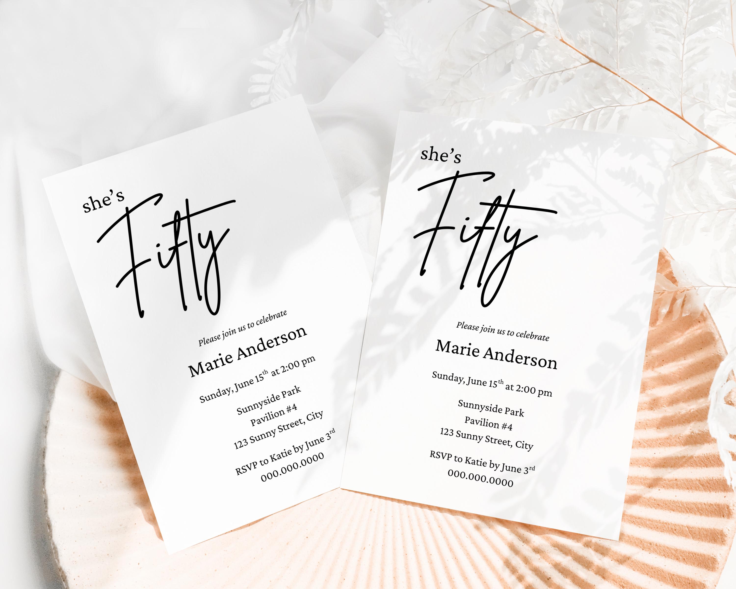 Celebrate the milestone of turning fifty with our beautifully designed downloadable invite for a 50th birthday party. Perfect for a dinner party or gathering, these invitations come in a minimalist black and white design that adds a touch of elegance to your fiftieth year celebration. With our editable template, you can easily customize the invites with your own details and colors, whether sending them via text message, email, evite or mail. Enjoy the convenience of instant download, allowing you to print at home and get your invitations out to friends and family in no time. This template is sized to 5x7 and comes with 9 editing tutorial videos.