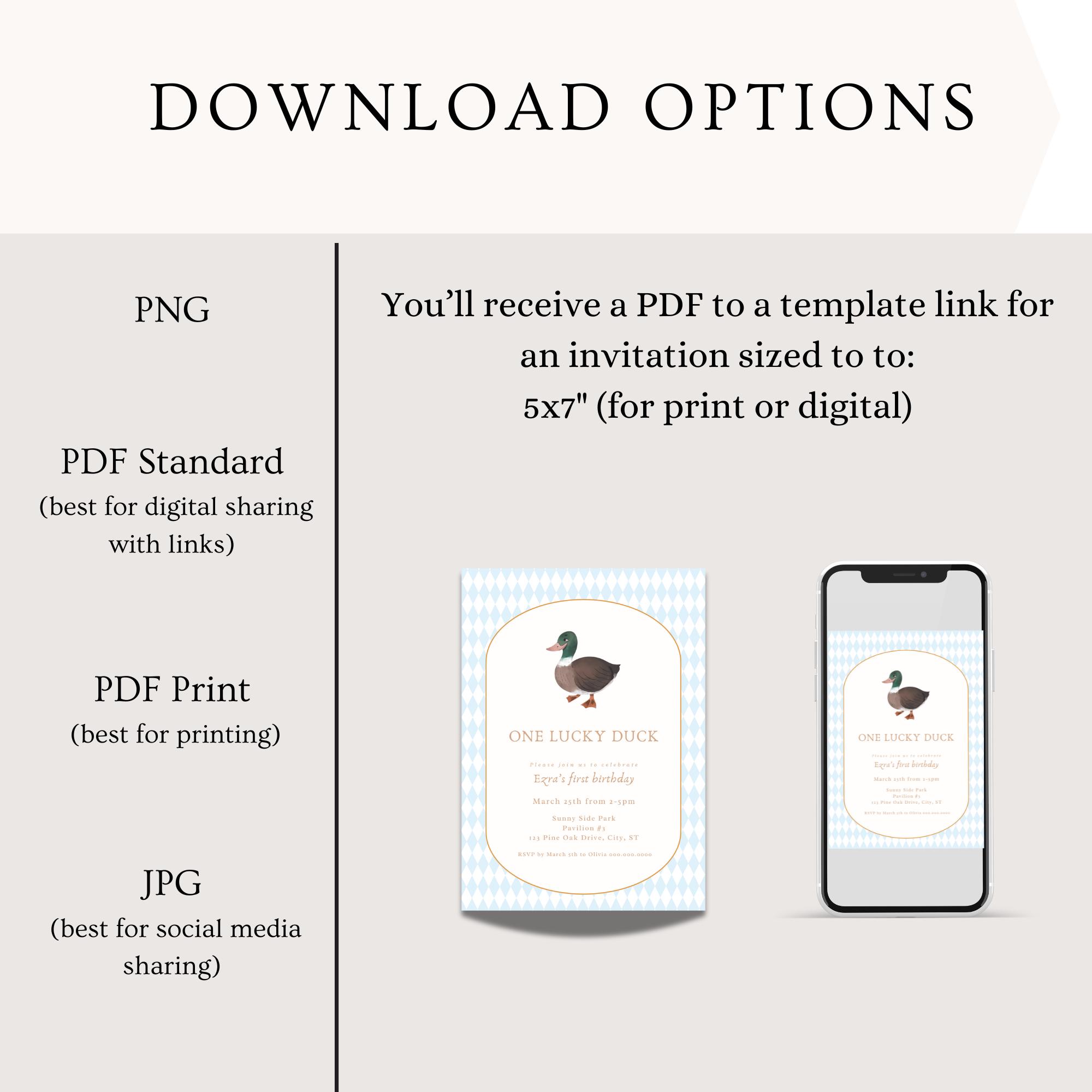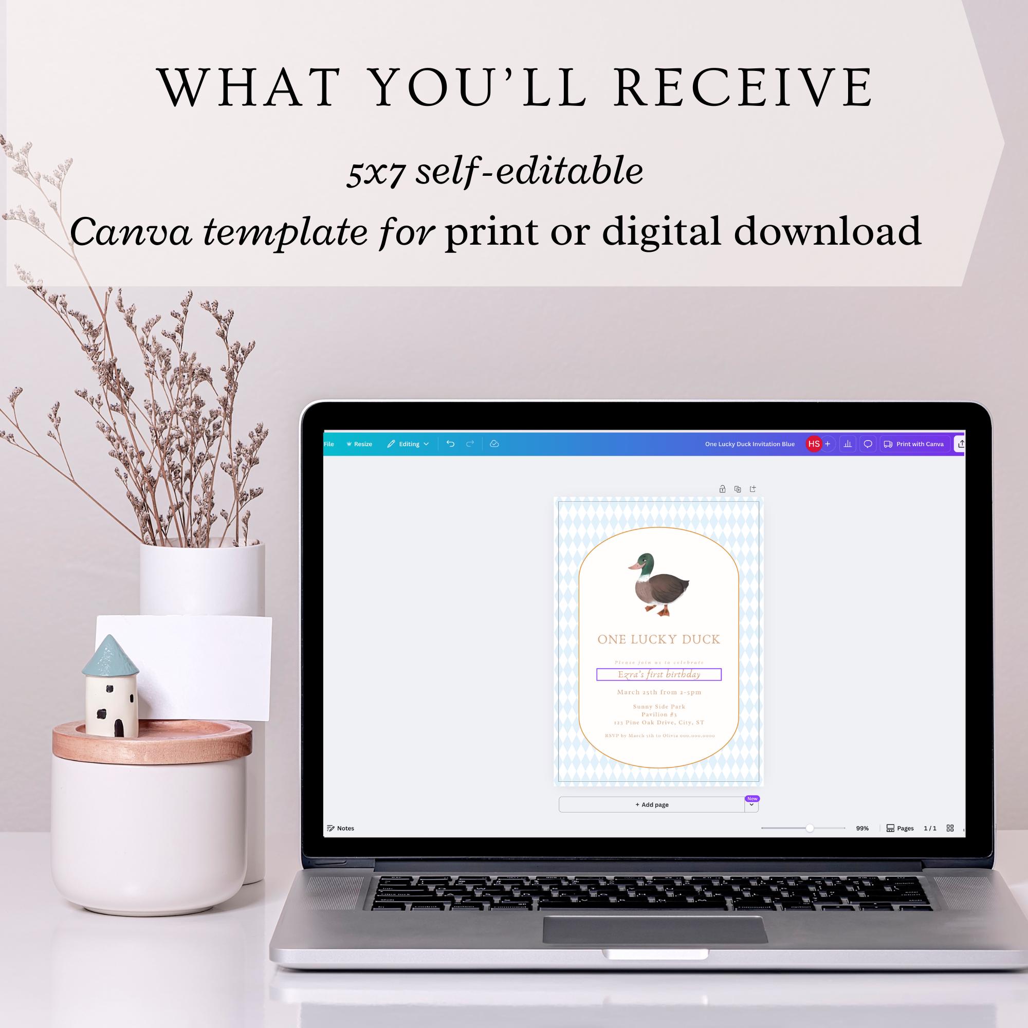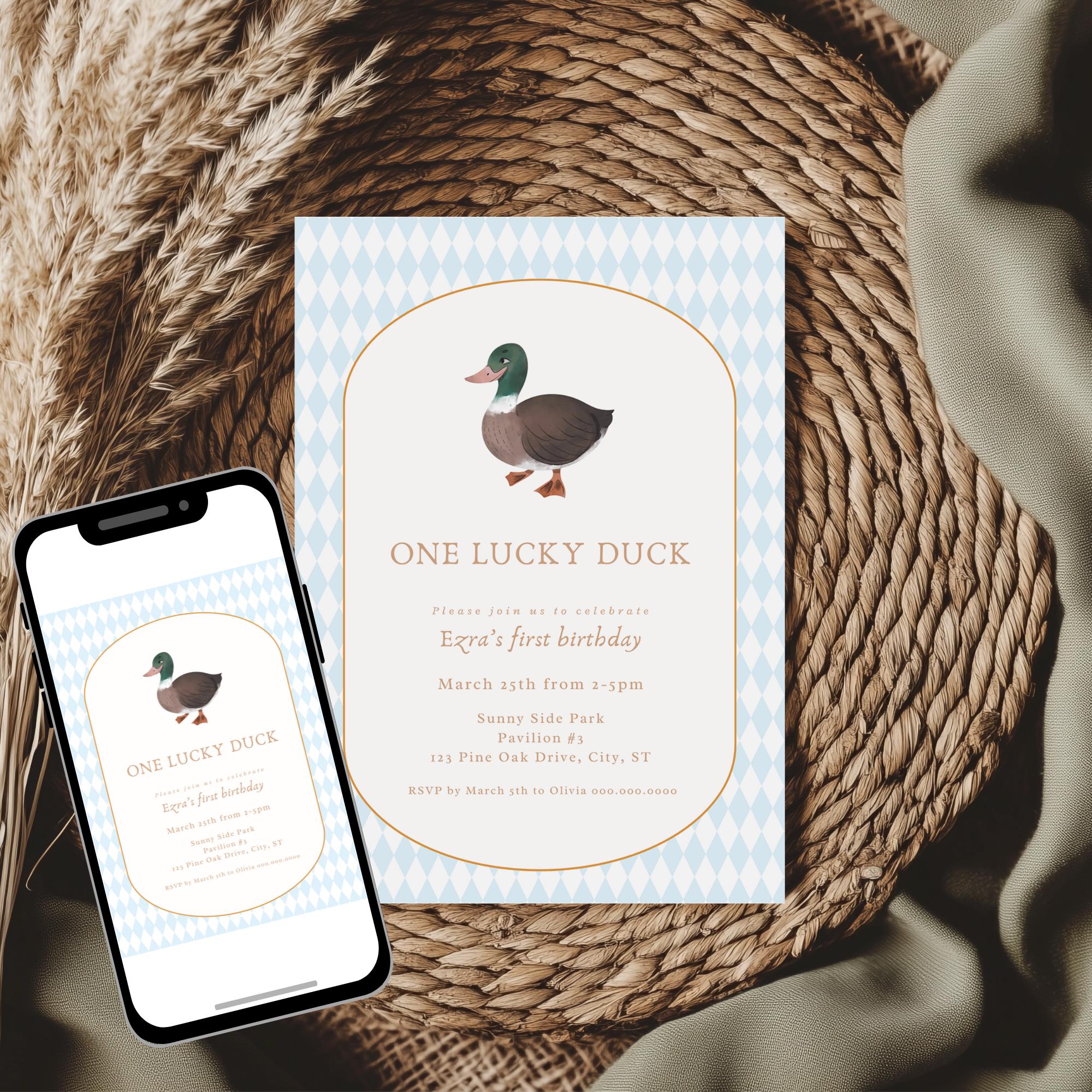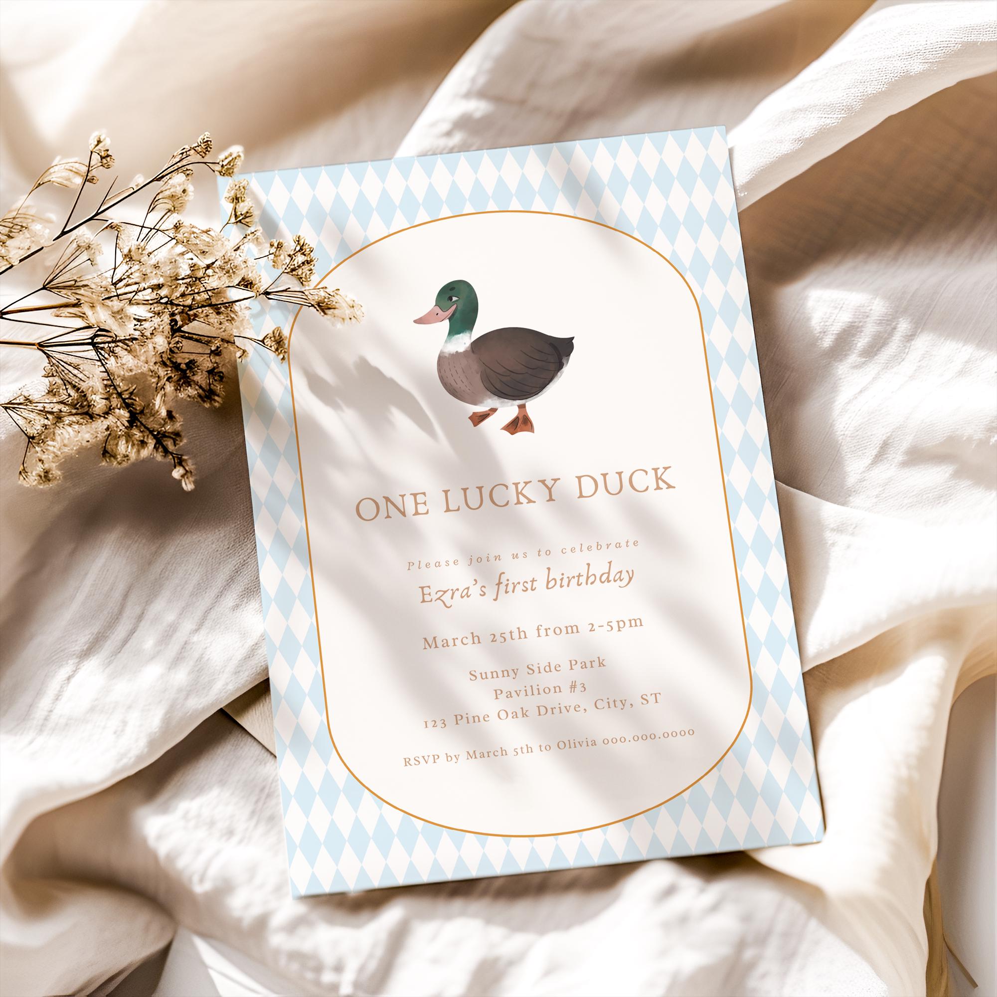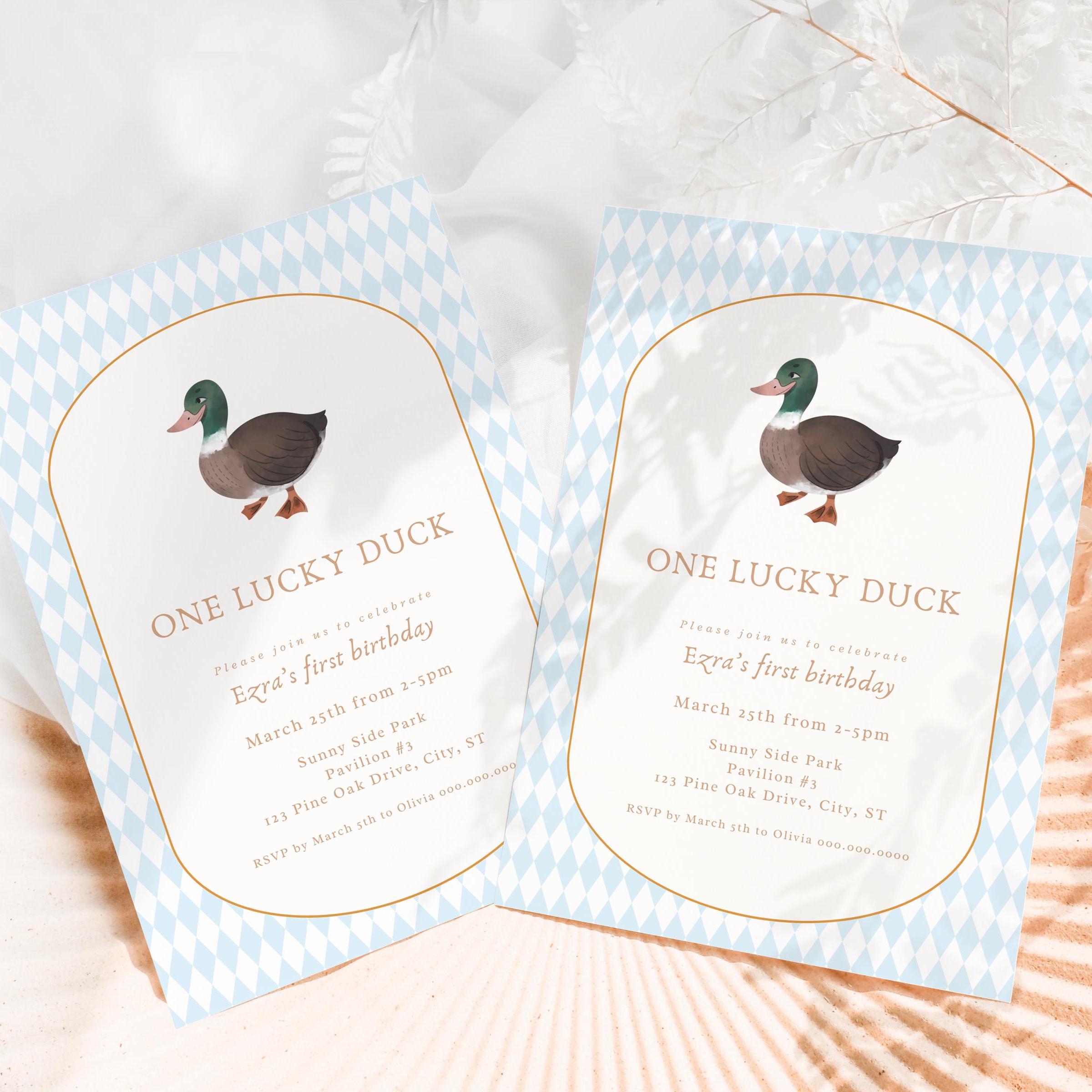 Celebrate your little duckling’s 1st year celebration in style with this vintage classic invitation that’s as adorable as it is timeless! Featuring a charming watercolor mallard, sweet light blue gingham background, and cheerful light yellow font, this gender neutral design is perfect for a boy or girl turning the big ONE. Whether you're planning a backyard bash or a cozy indoor gathering, this editable template makes it super easy to send a text, evite, or print your invites at home. It’s an instant download, so you can get the party started quack-fast! Perfect for parents who love a soft, sweet aesthetic with a touch of nature-inspired charm. 💛💙 This template is sized to 5x7 and is effortlessly editable on Canva, but if you're new to editable stationary, they come with 9 free videos to help navigate customizing!