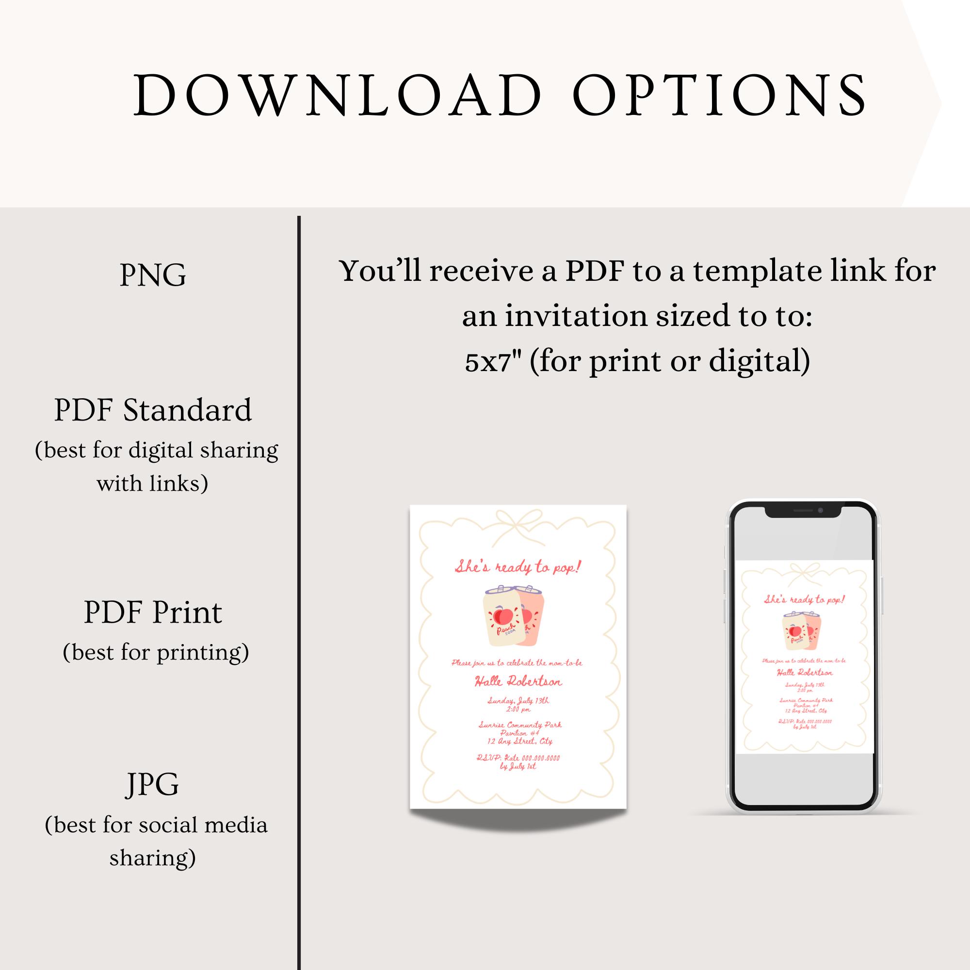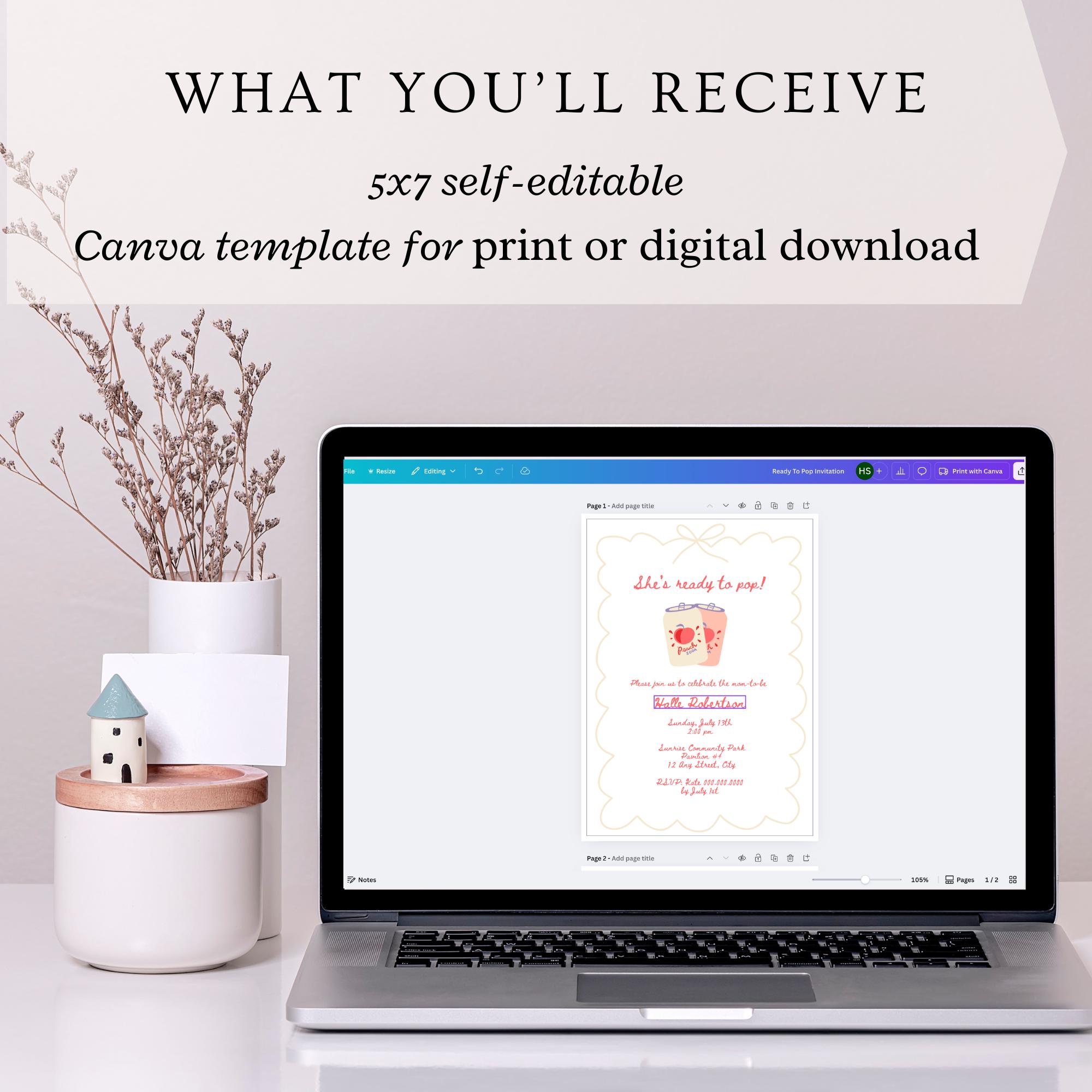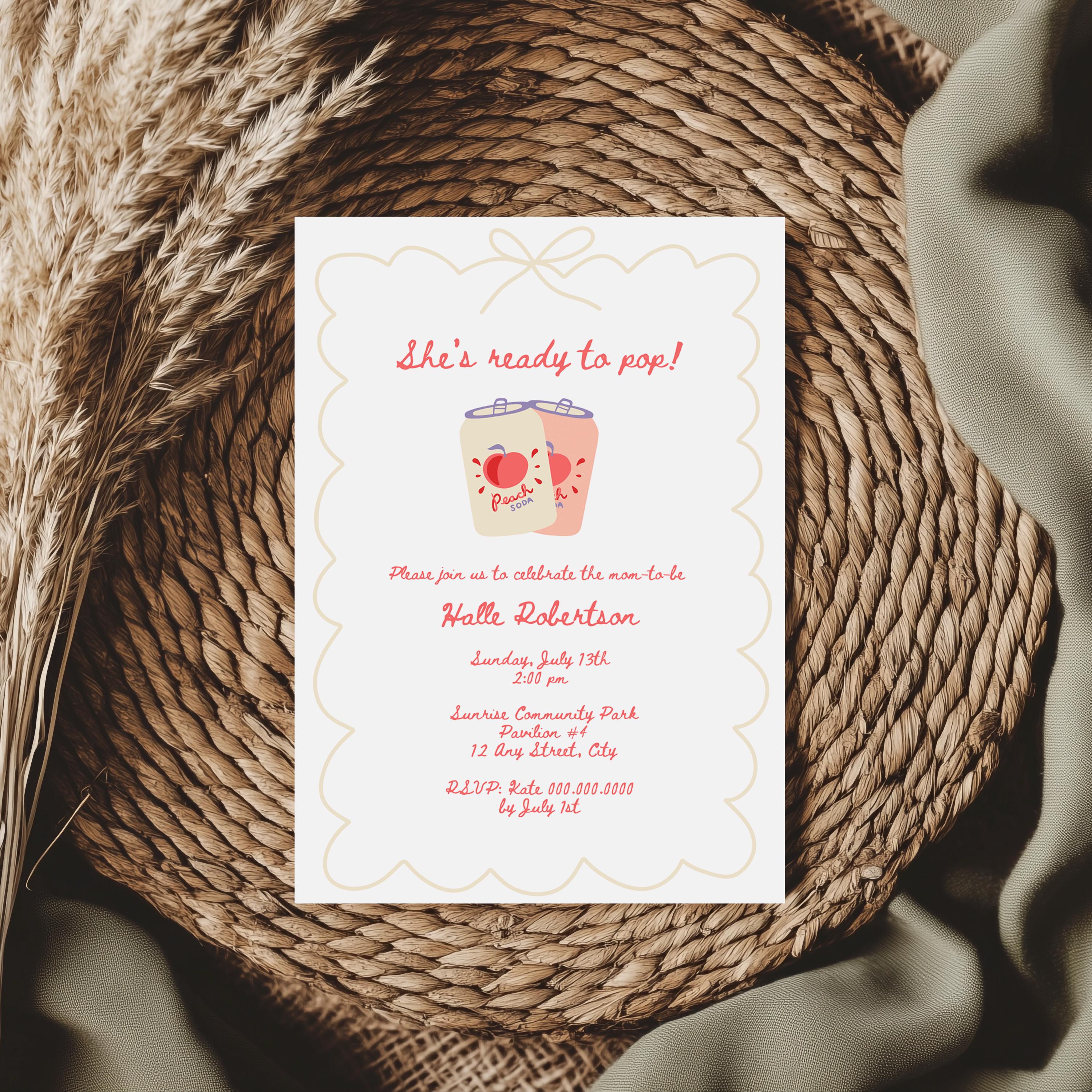 Celebrate the upcoming arrival of your little one with our “Ready to Pop" Baby Shower Invitation. This charming baby shower invite features a delightful neutral colored peach soda design complemented by a hand-drawn border and a handwriting typeface, perfect for any summer shower or sprinkle. The editable template allows you to personalize the details easily and quickly. With this digital invitation, you can enjoy an instant download, allowing you to print at home or send through evite, text, or email for a quick delivery. Perfect for a gender-neutral celebration, this invitation makes your baby shower planning a breeze. This template is sized to 5x7 and comes with 9 editing tutorial videos.