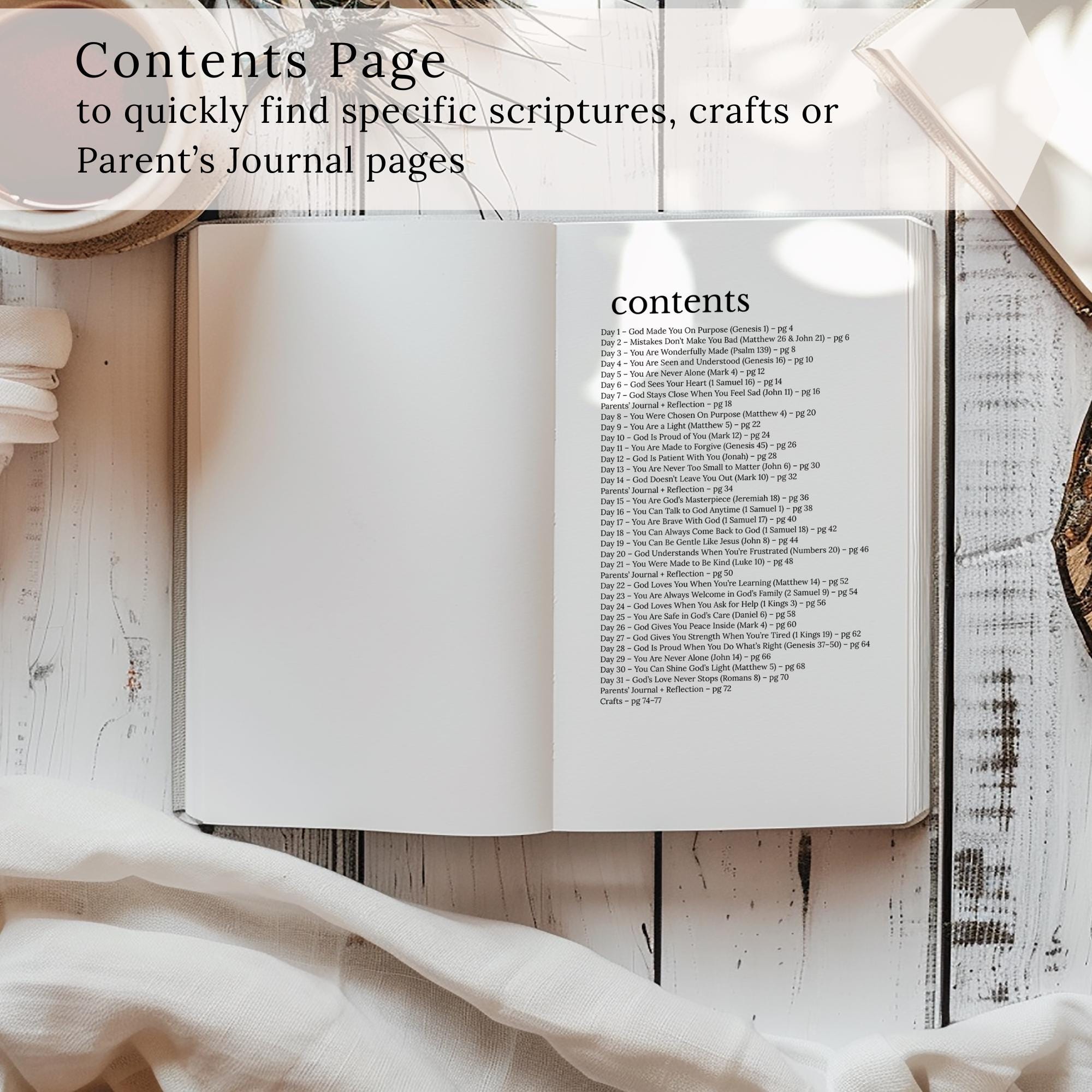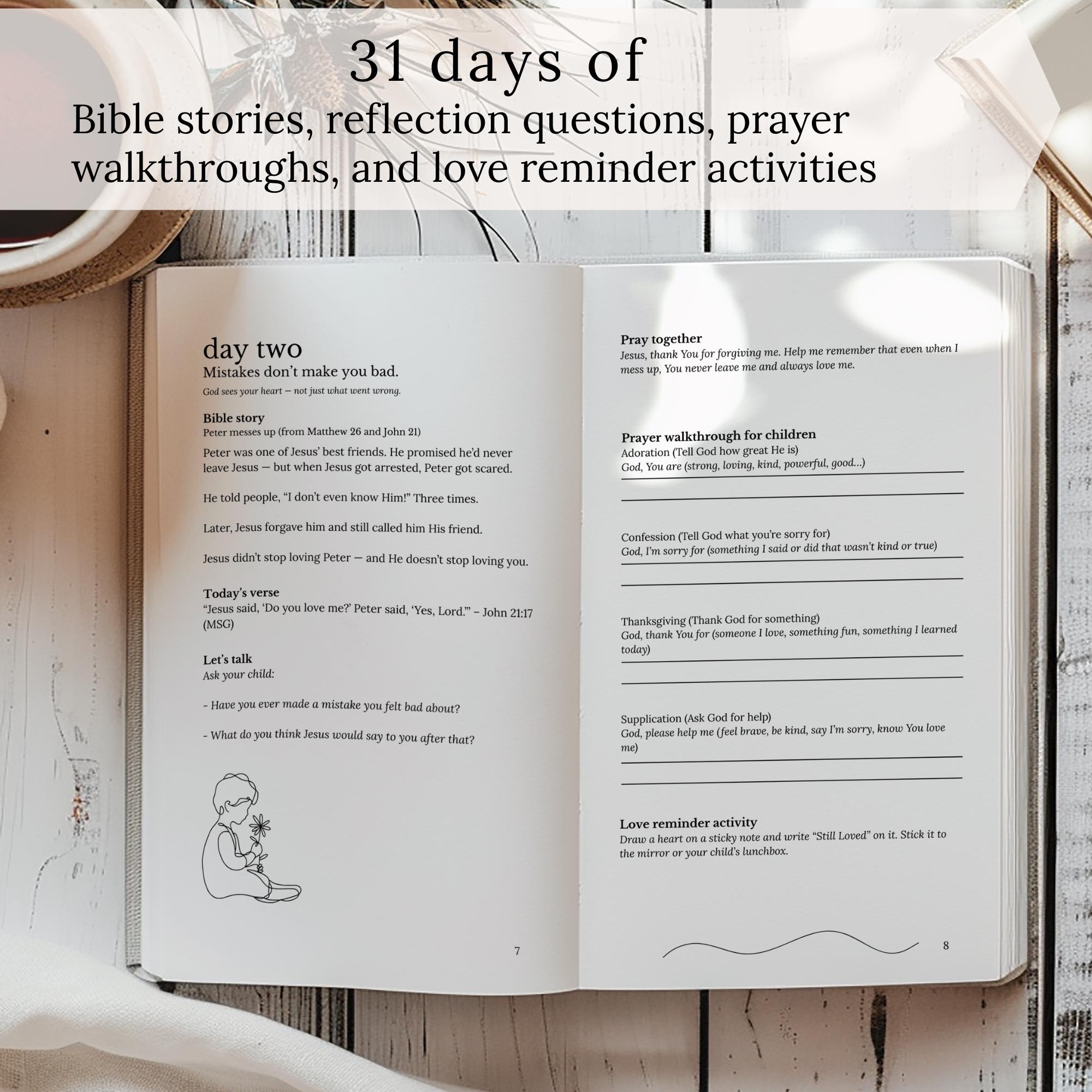 ✨ 31-Day Devotional Journey – Each day has one devotional page with scripture, a simple teaching, and encouragement for your child, followed by a guided prayer page.