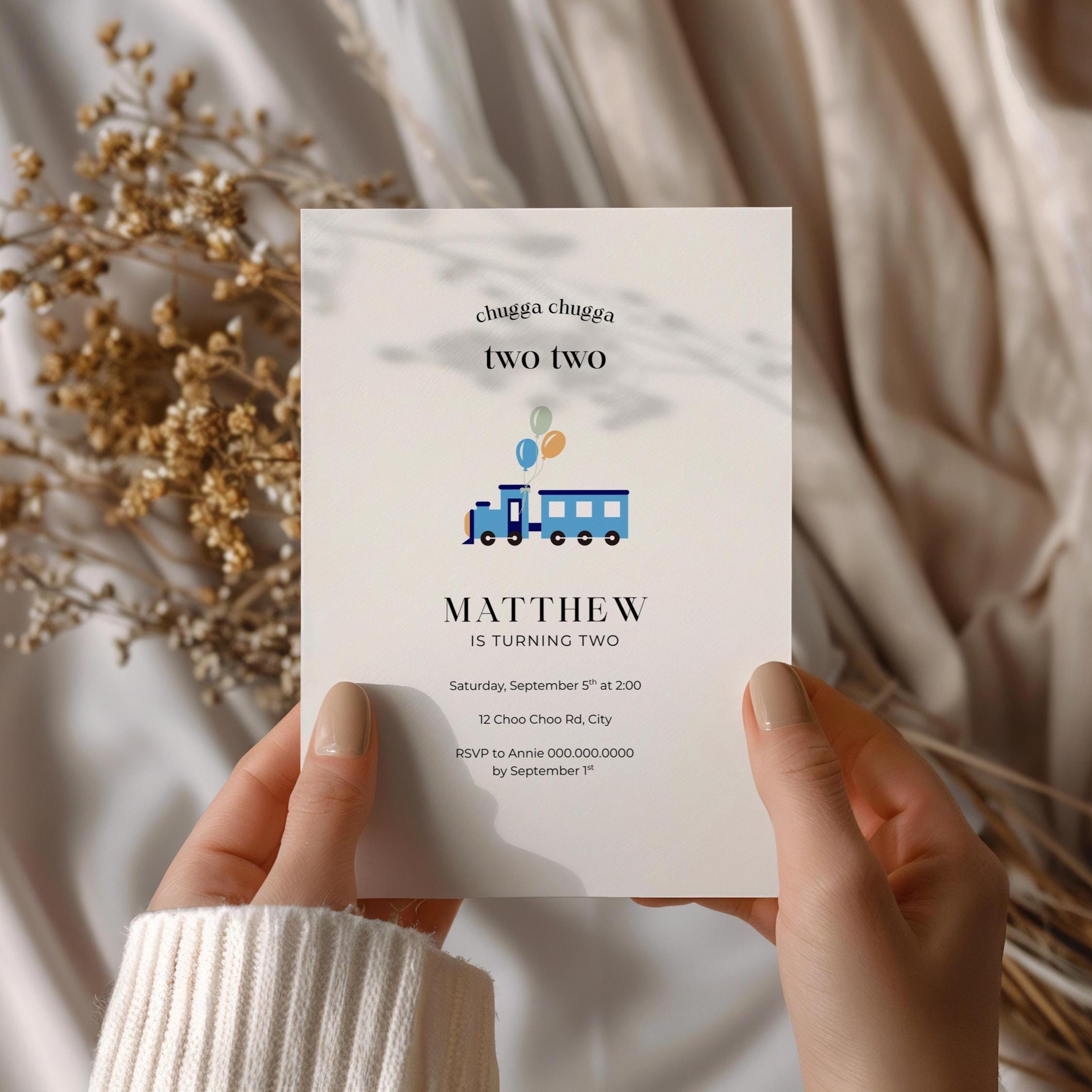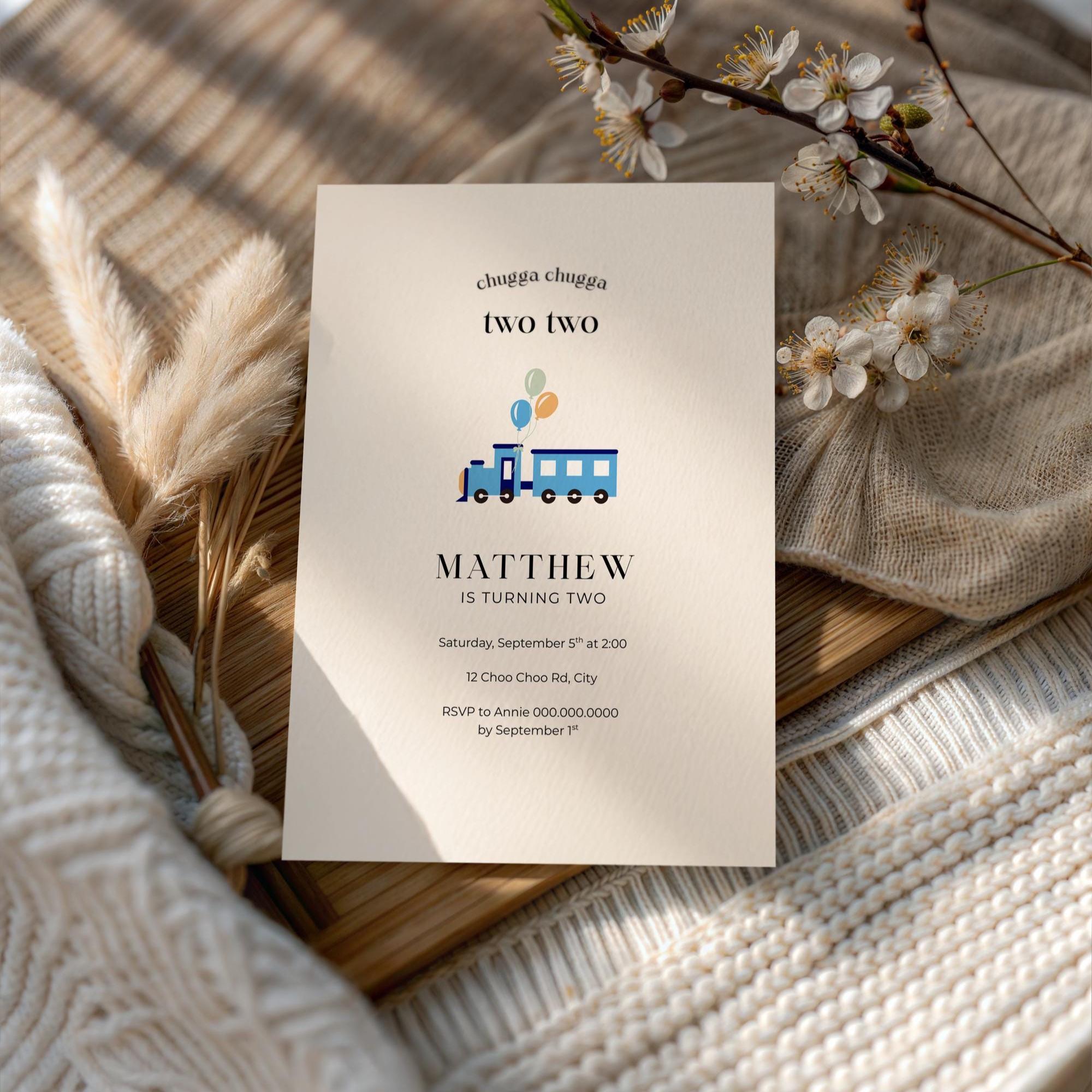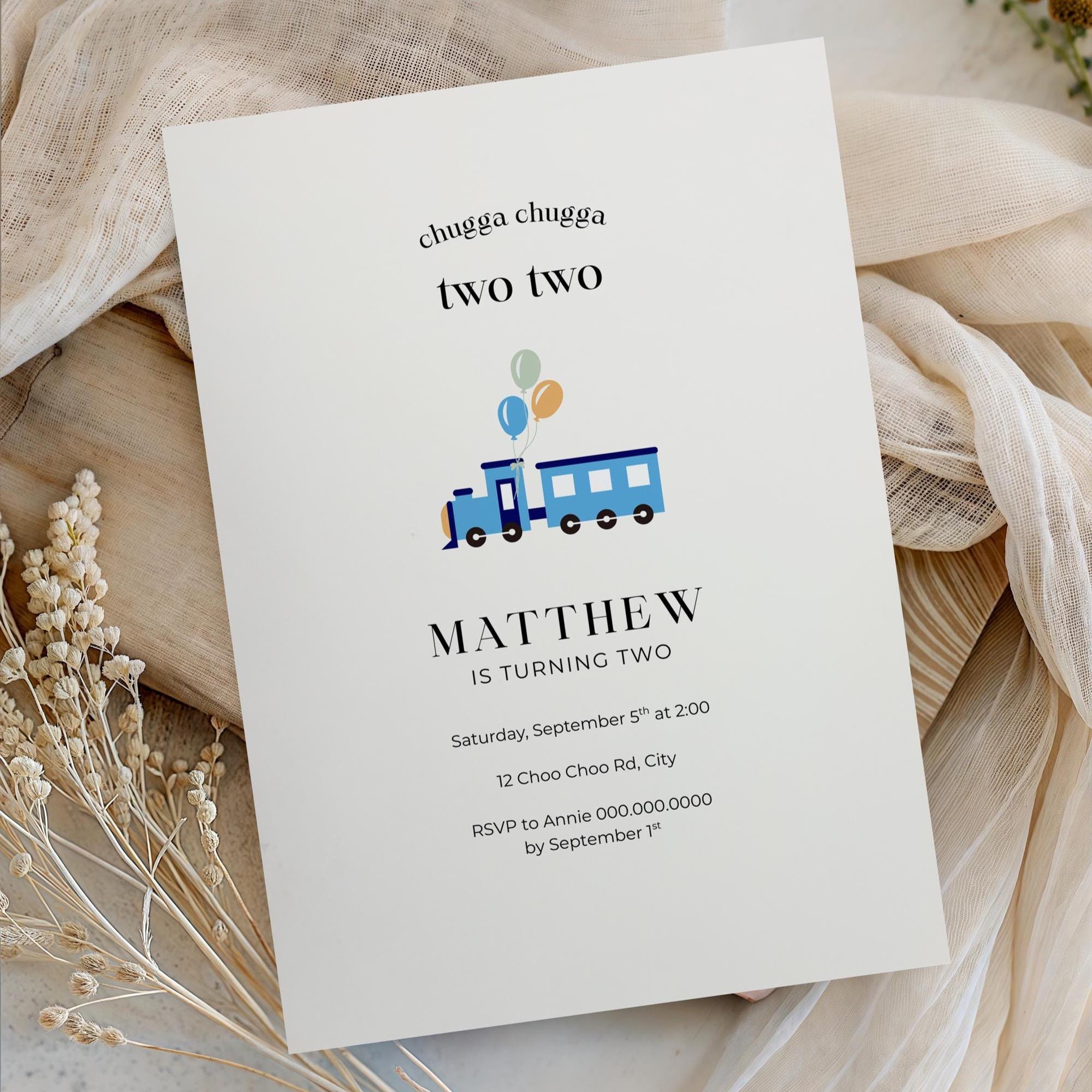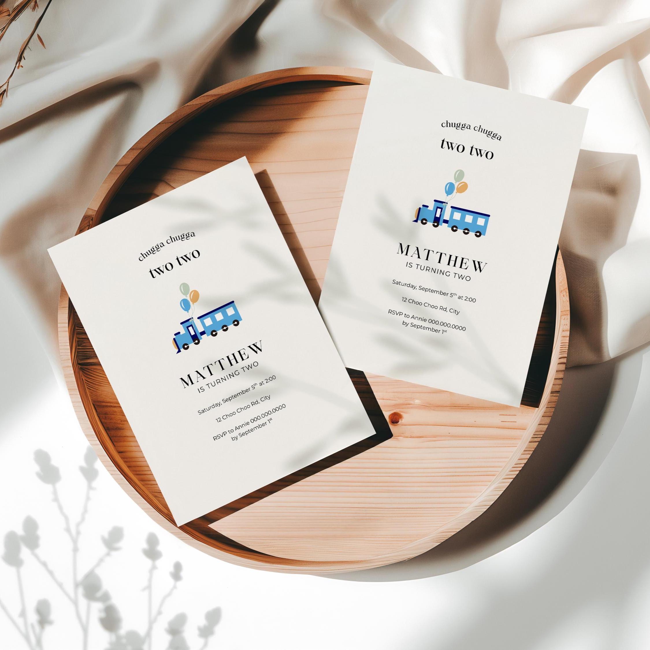 All aboard for a train-tastic 2nd birthday celebration! This editable "Chugga Chugga Two Two" invitation is perfect for your little conductor’s special day. Featuring a sweet blue train with pastel balloons, this second birthday party invite is gender-neutral, modern, and easy to customize!