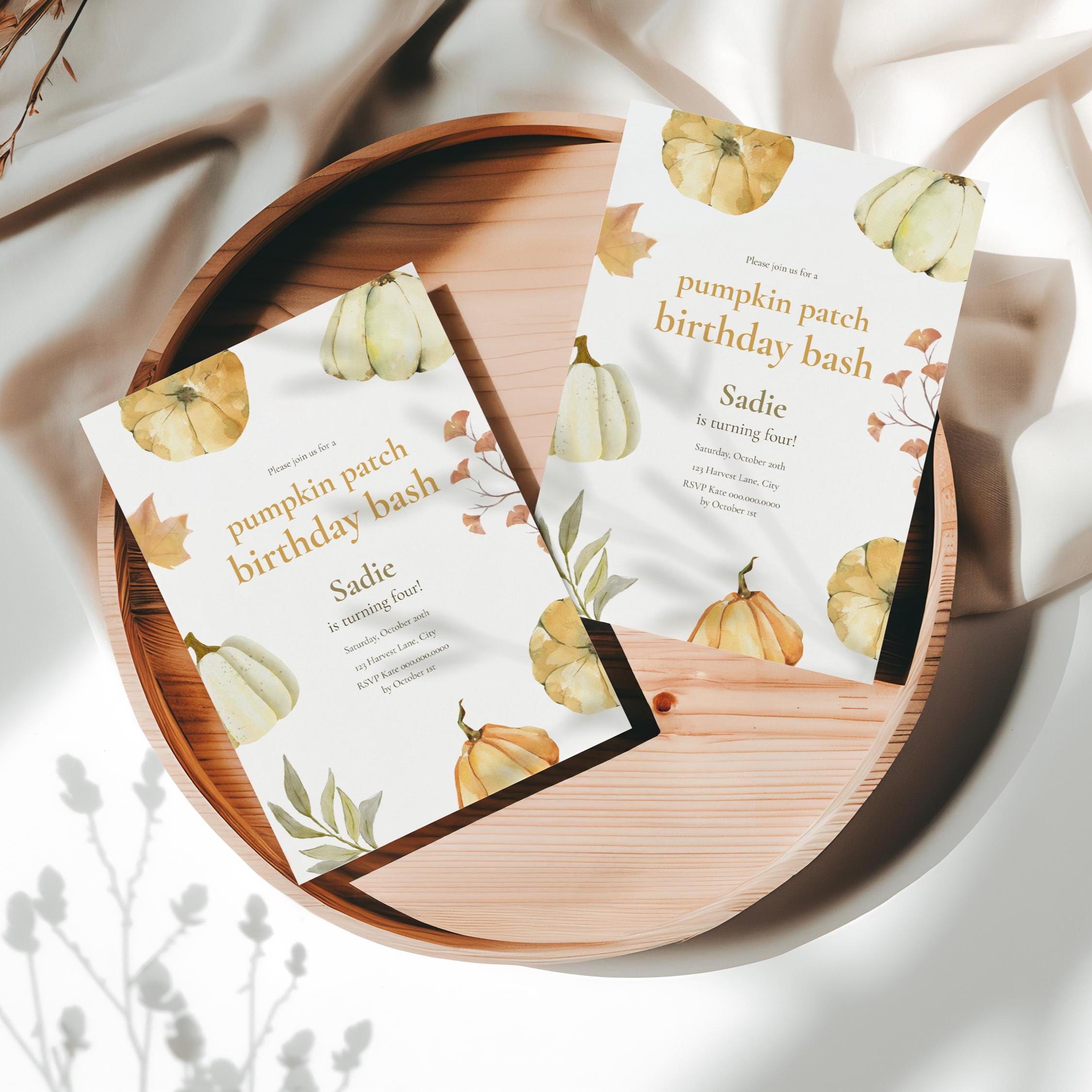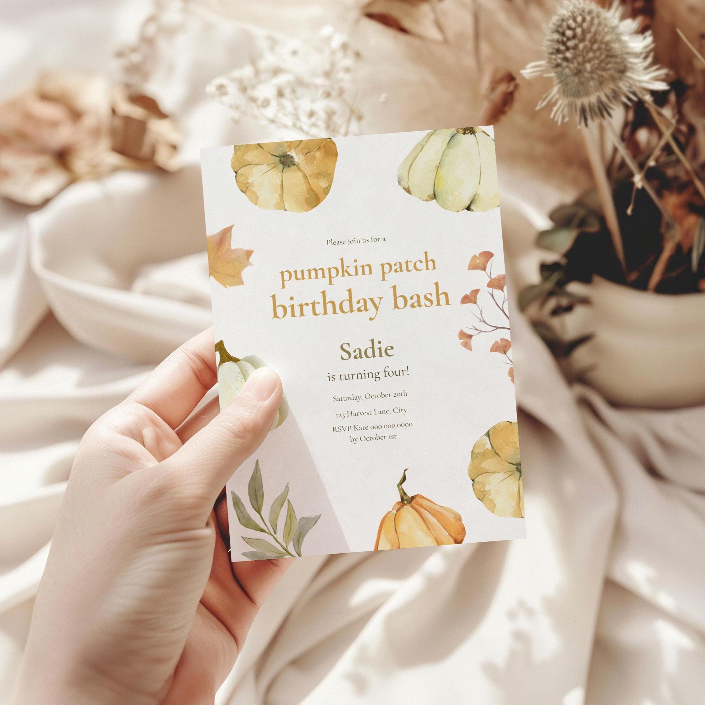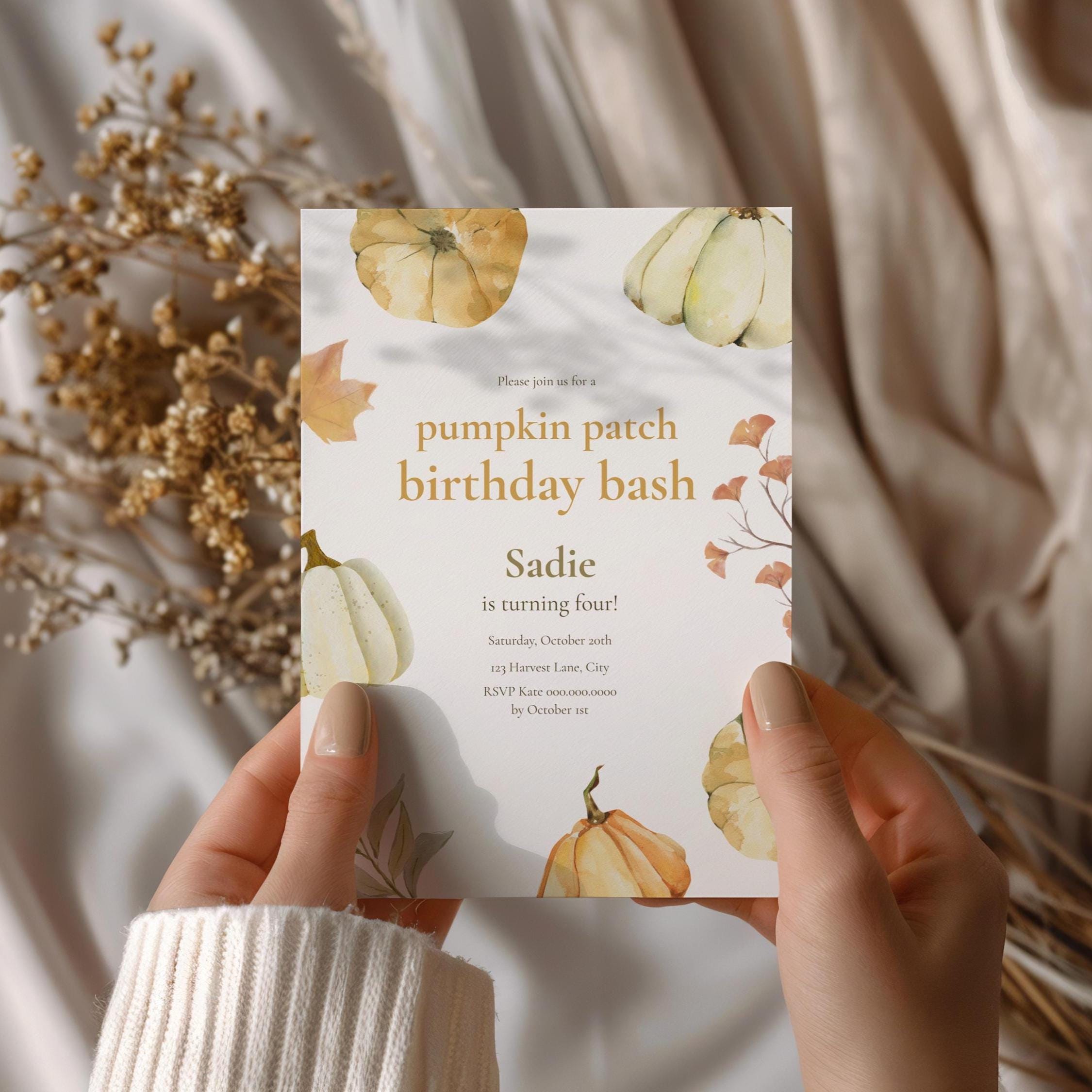 Celebrate your little pumpkin with this pumpkin patch birthday invitation! Featuring hand-painted watercolor pumpkins and cozy autumn foliage, this editable fall birthday invite is perfect for a backyard bash, pumpkin patch party, or hayride celebration.
