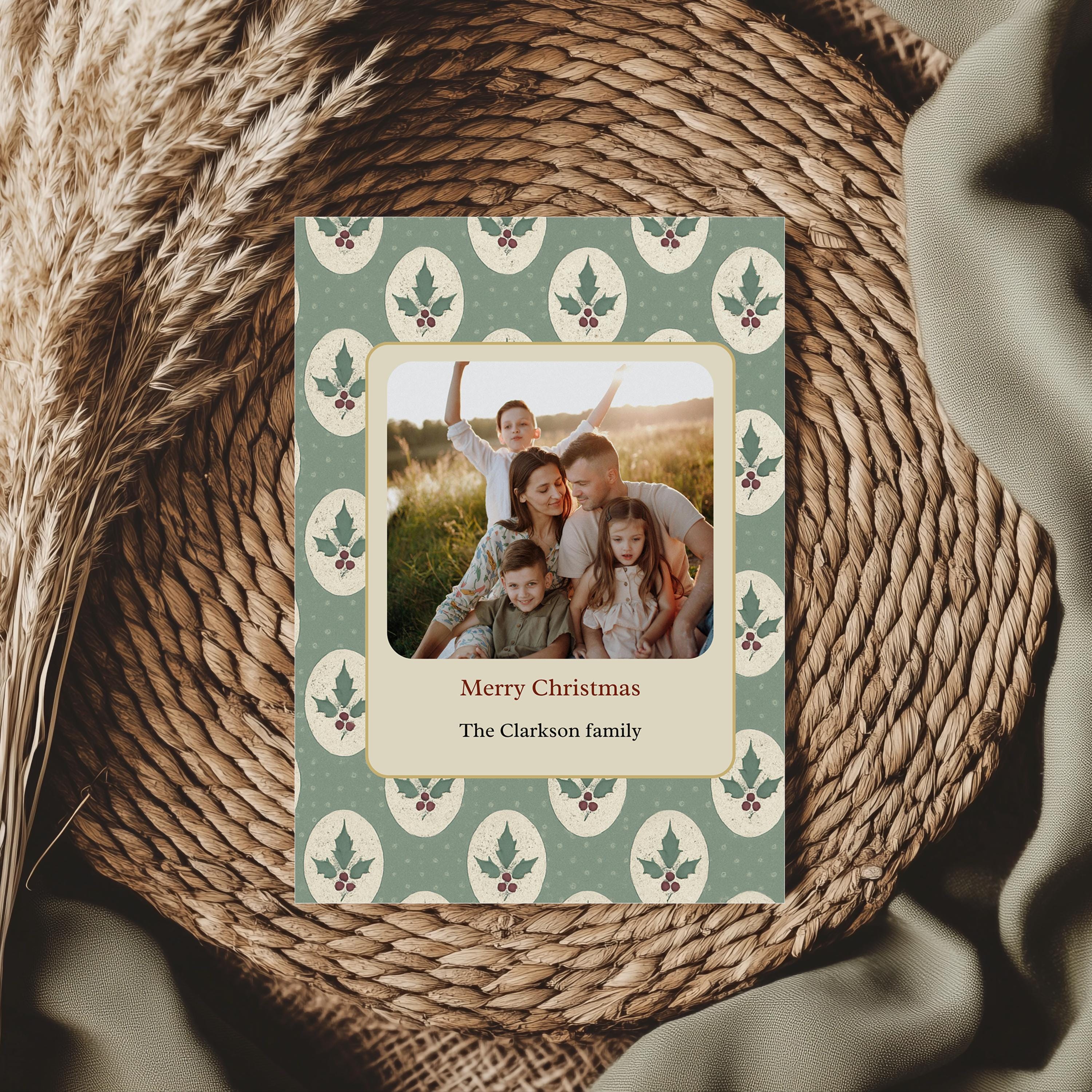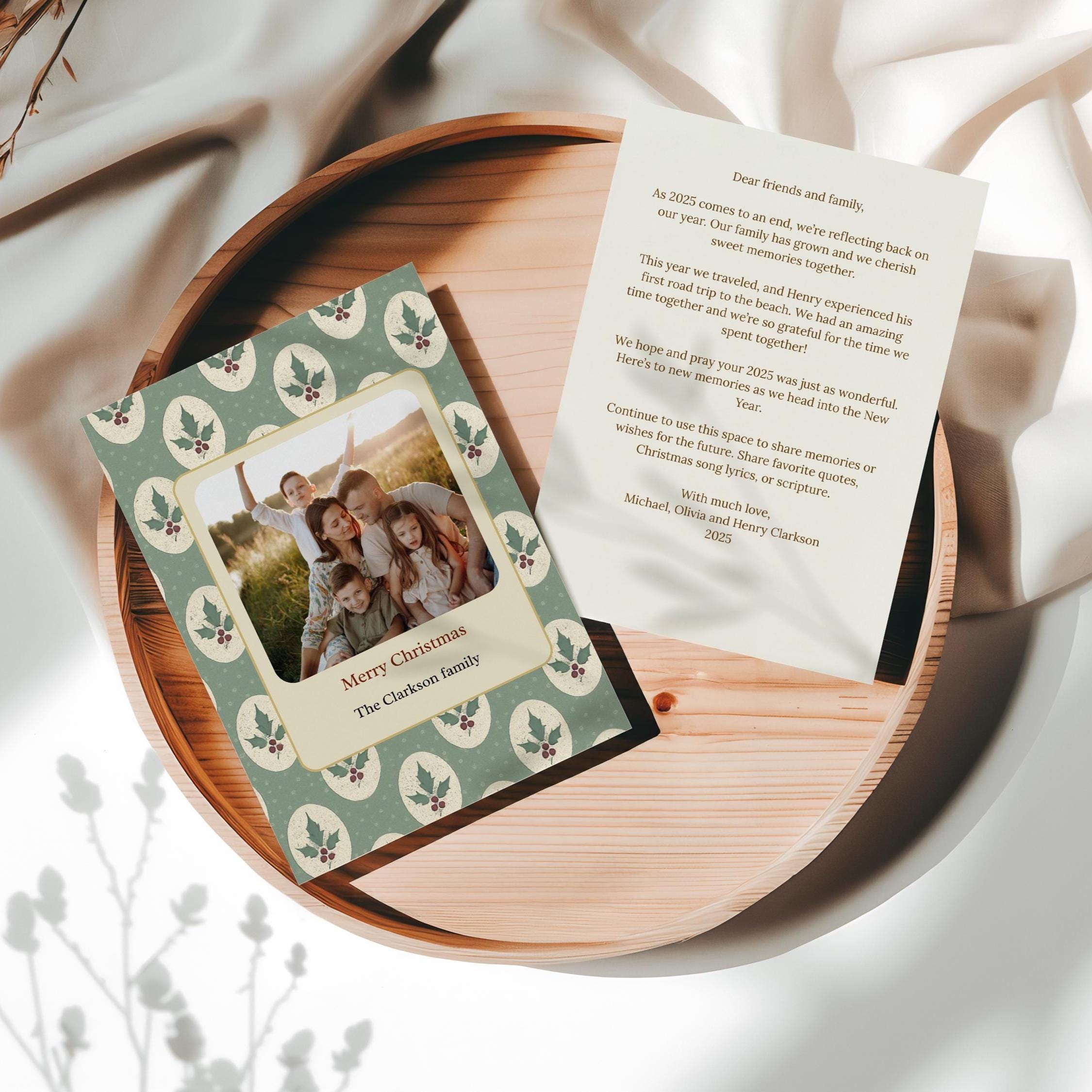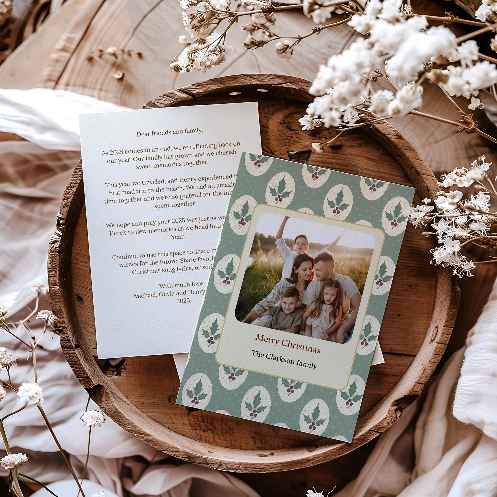 Wrap up the year with this cheerful two-sided Christmas card featuring your family photo on the front and a personalized holiday letter on the back. This holly berry design brings vintage charm and warmth to your greetings — perfect for sharing memories, milestones, and heartfelt wishes with loved ones.