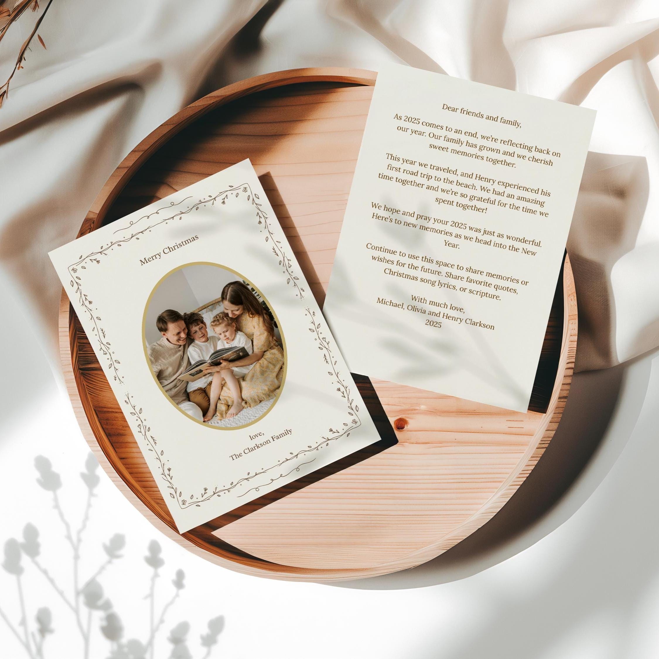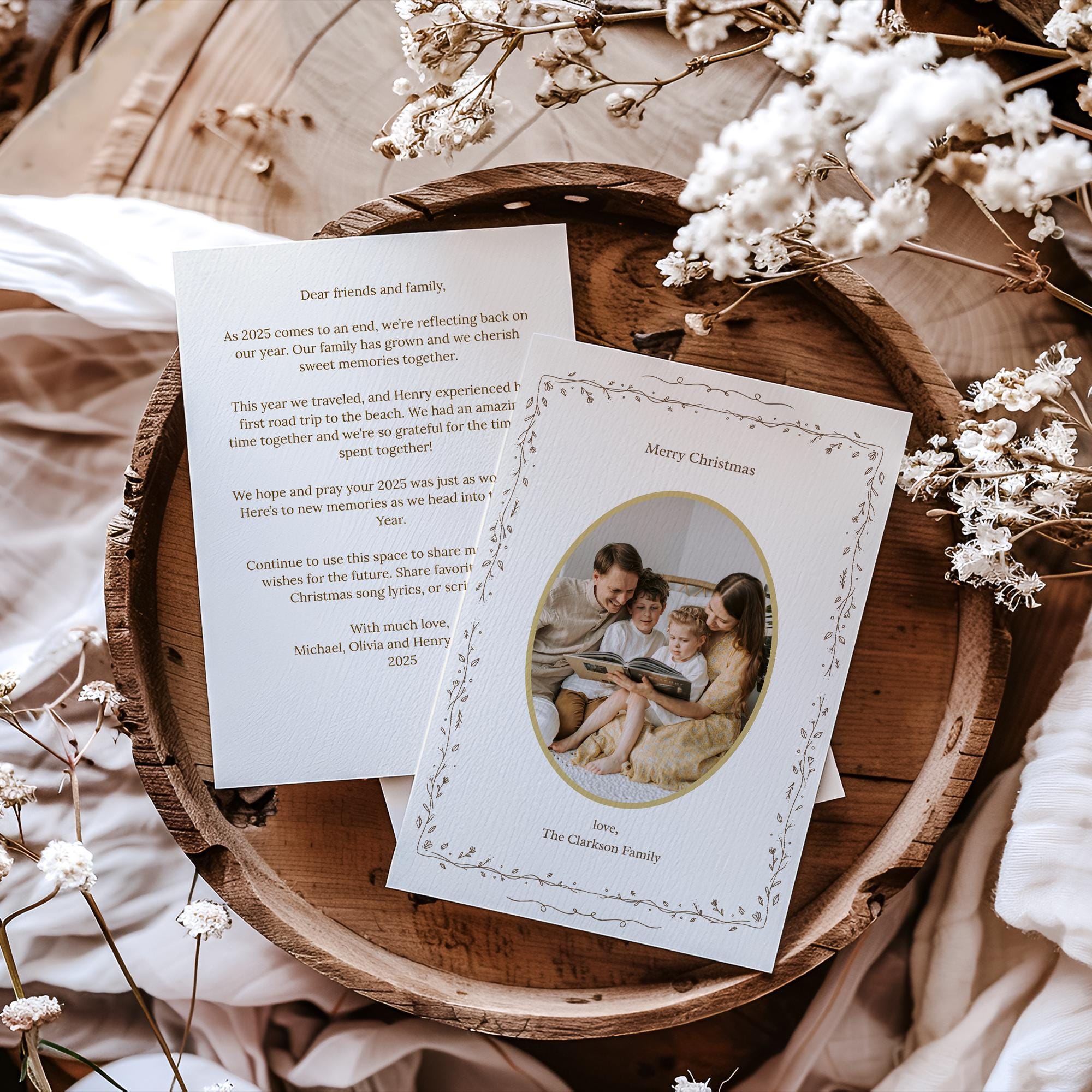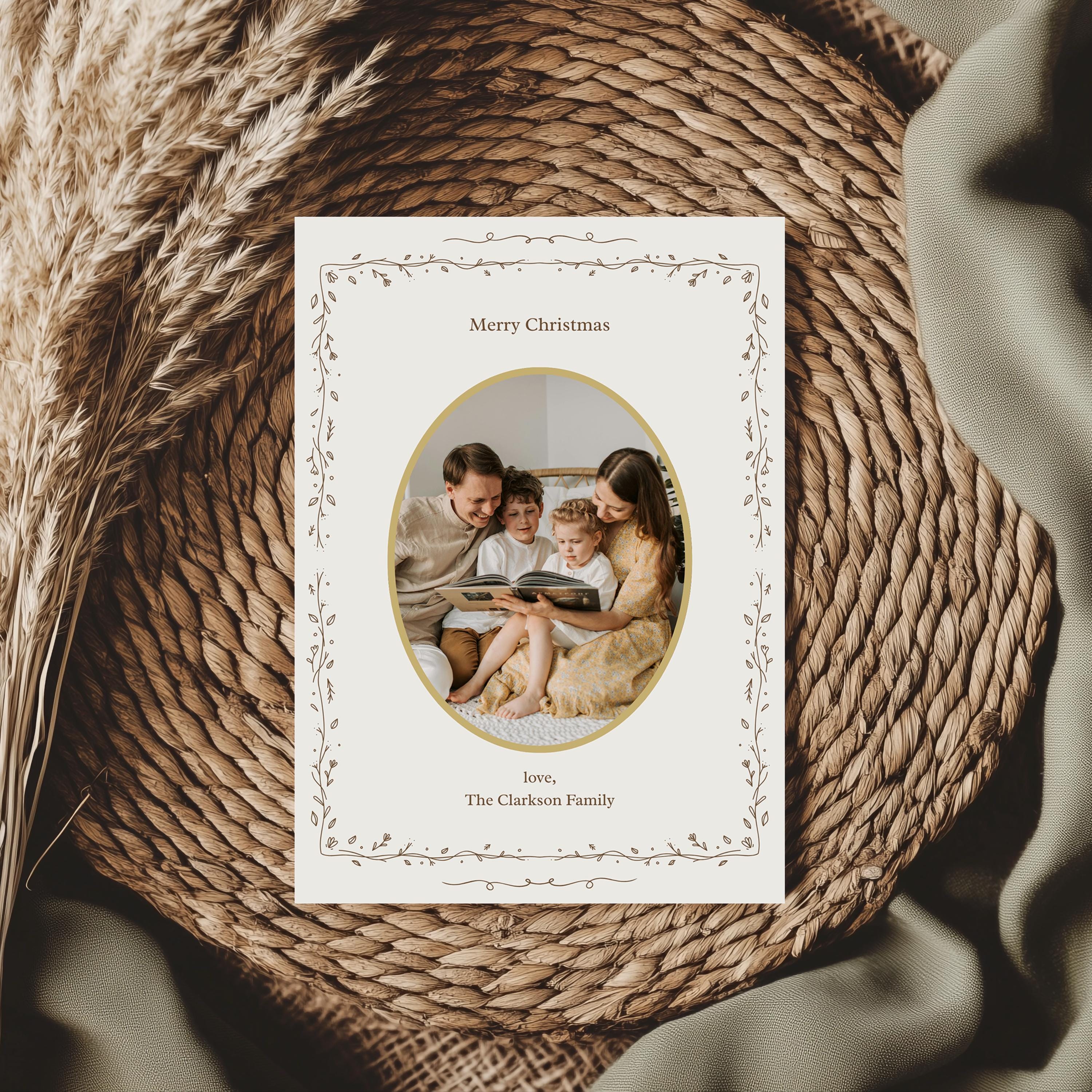 Send a timeless Christmas greeting with this elegant two-sided holiday card, featuring your family photo in a soft oval frame and a personalized Christmas letter on the back. Delicate neutral florals line the front, making it a beautiful way to reflect on the year and share love with the people who matter most.