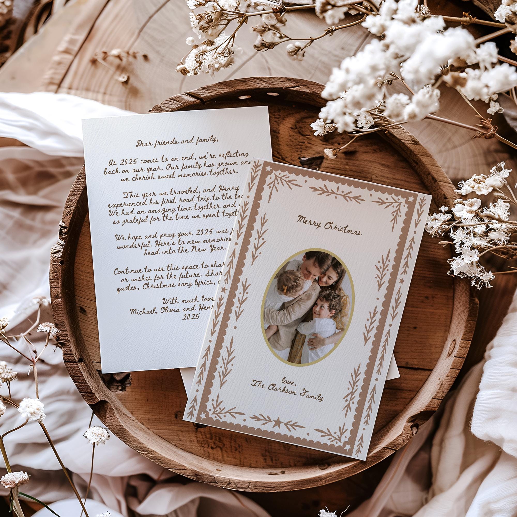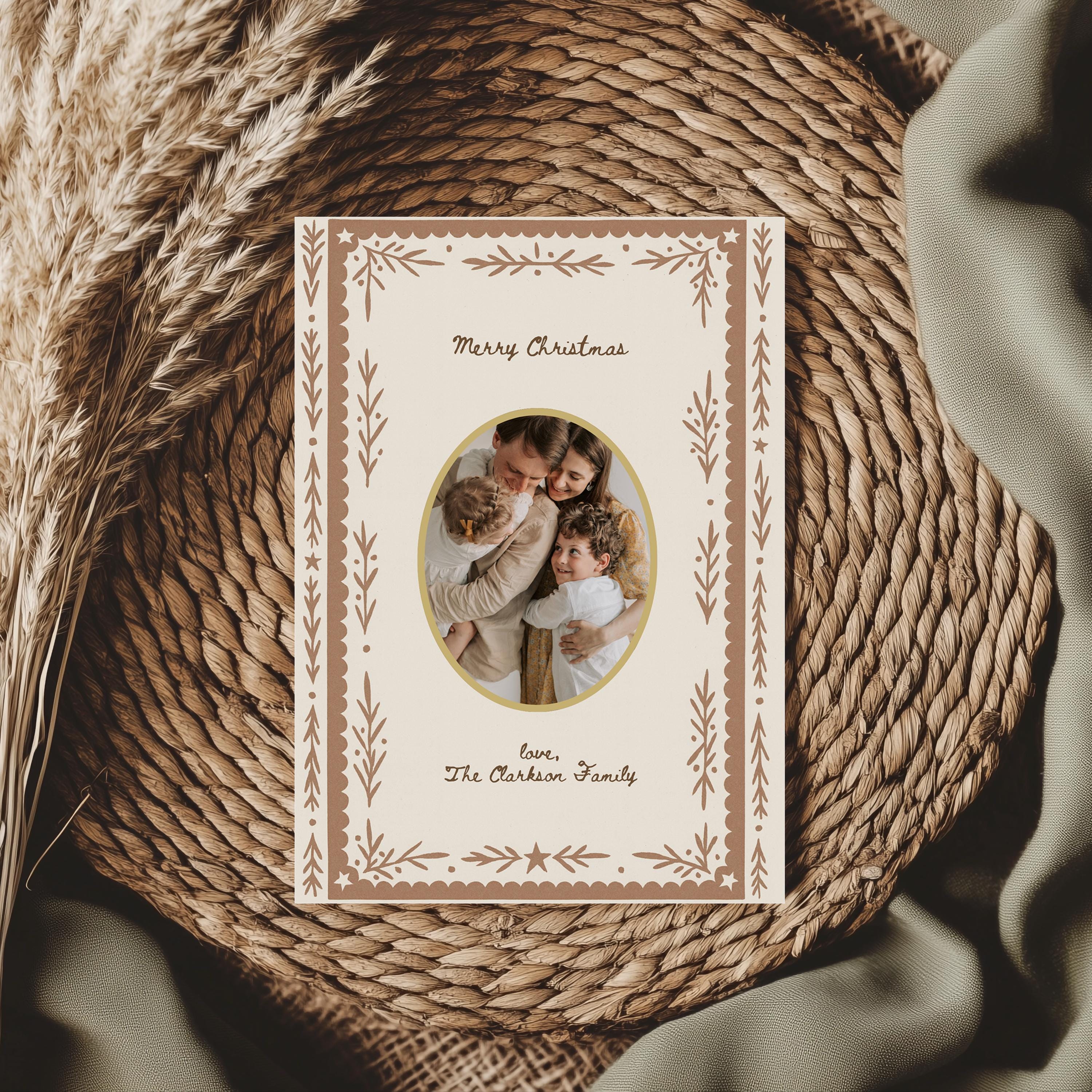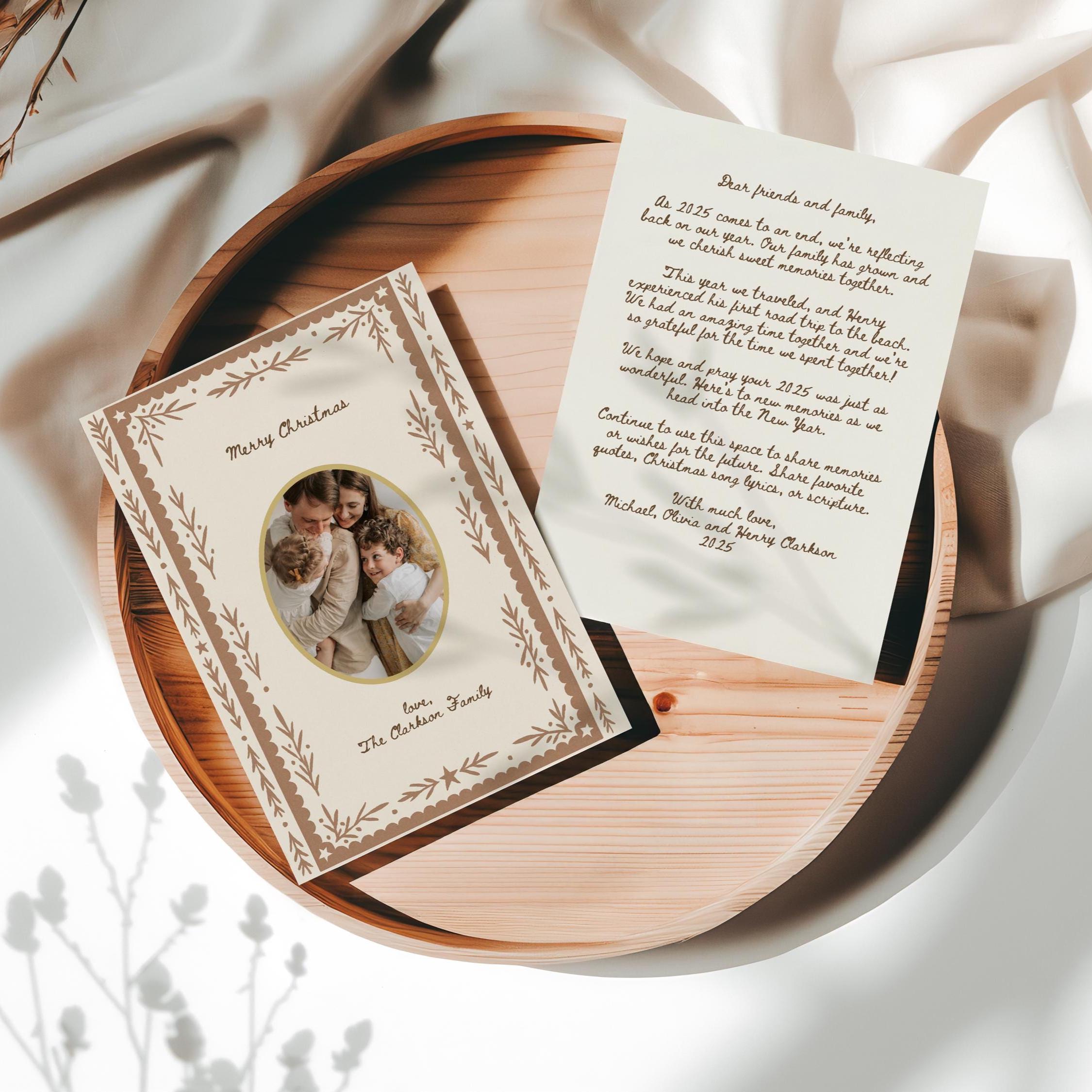 Celebrate the beauty of the season with this printable Christmas card featuring a neutral botanical frame and oval photo cutout—timeless, elegant, and completely customizable. The back of the card includes space for your family's annual letter, making it the perfect blend of heartfelt and polished. Ideal for sharing memories, milestones, and festive greetings in style.
