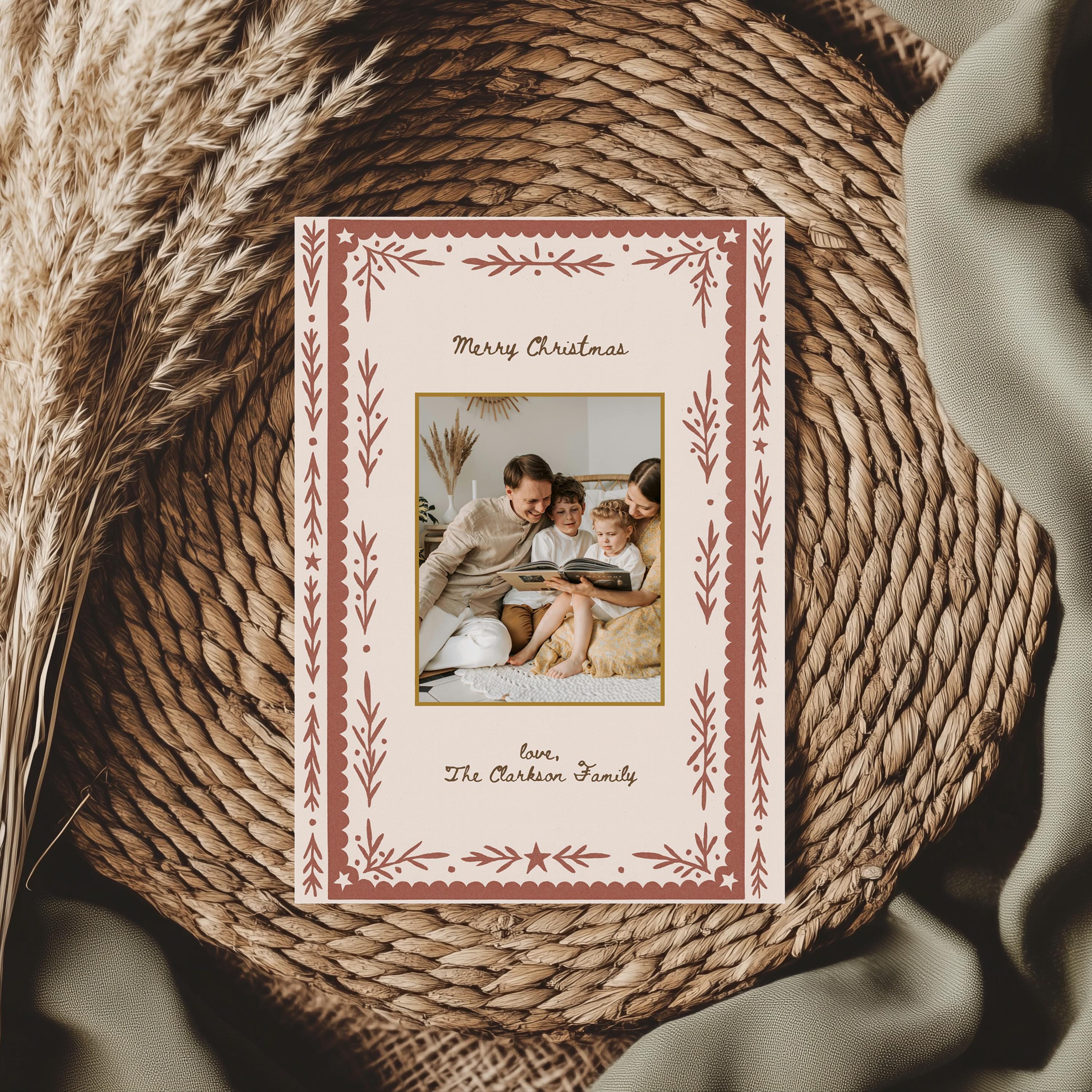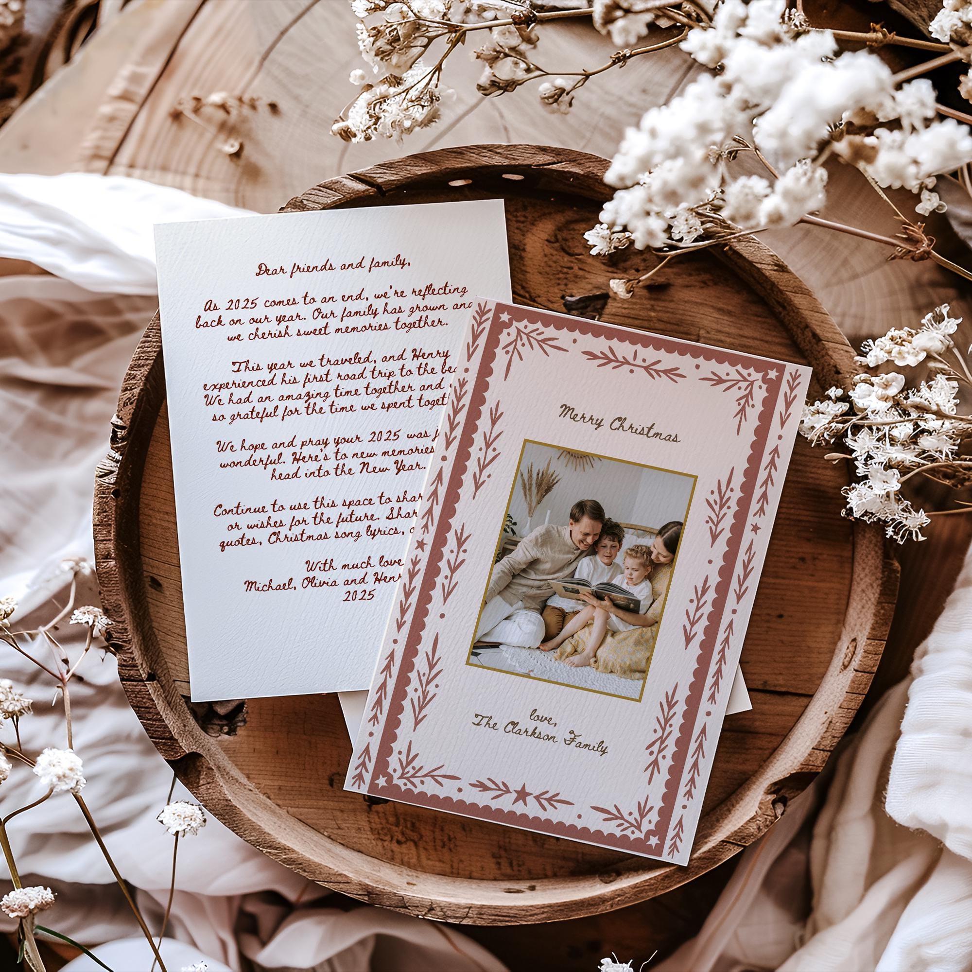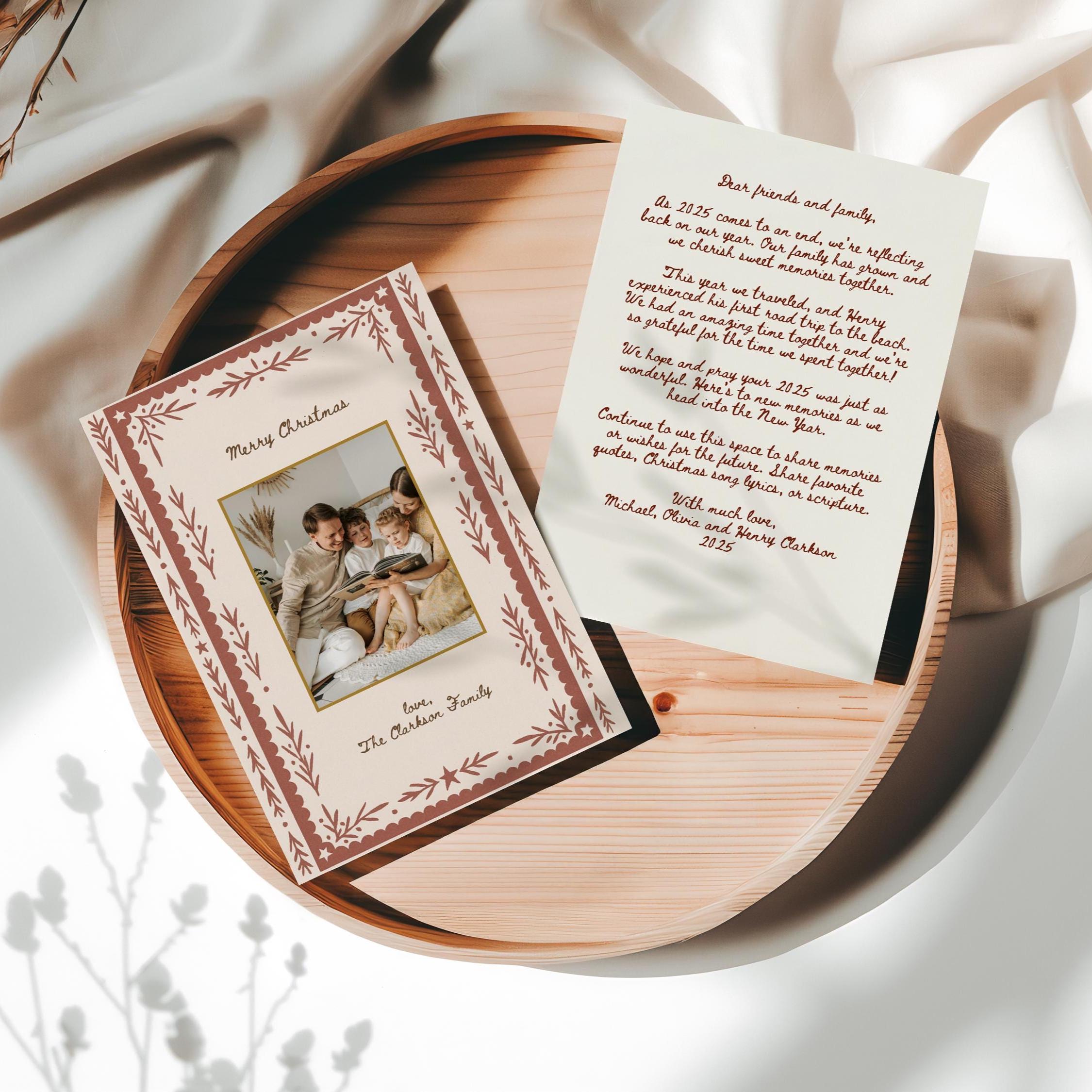 Celebrate the beauty of the season with this printable Christmas card featuring a burgundy botanical frame and oval photo cutout—timeless, elegant, and completely customizable. The back of the card includes space for your family's annual letter, making it the perfect blend of heartfelt and polished. Ideal for sharing memories, milestones, and festive greetings in style.
