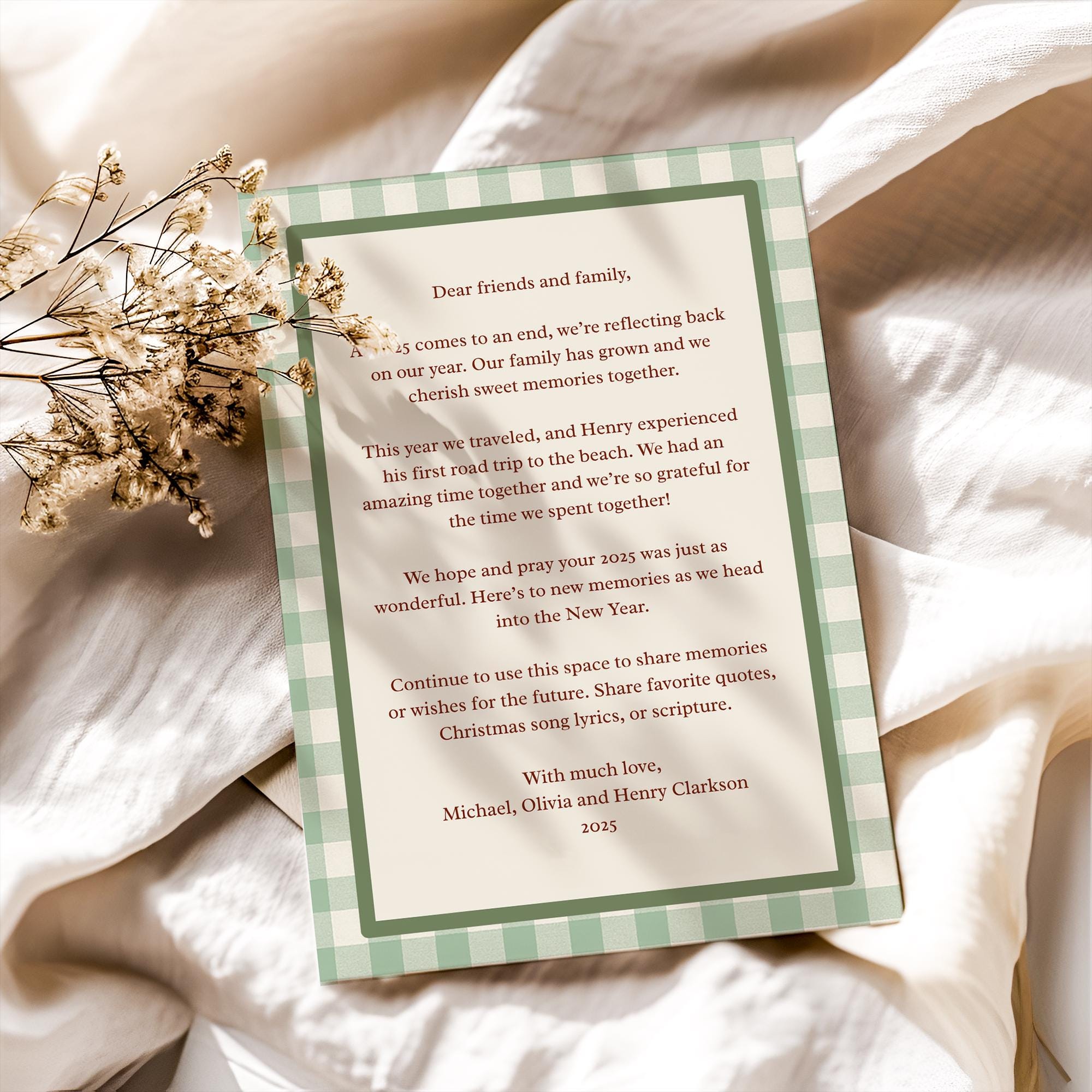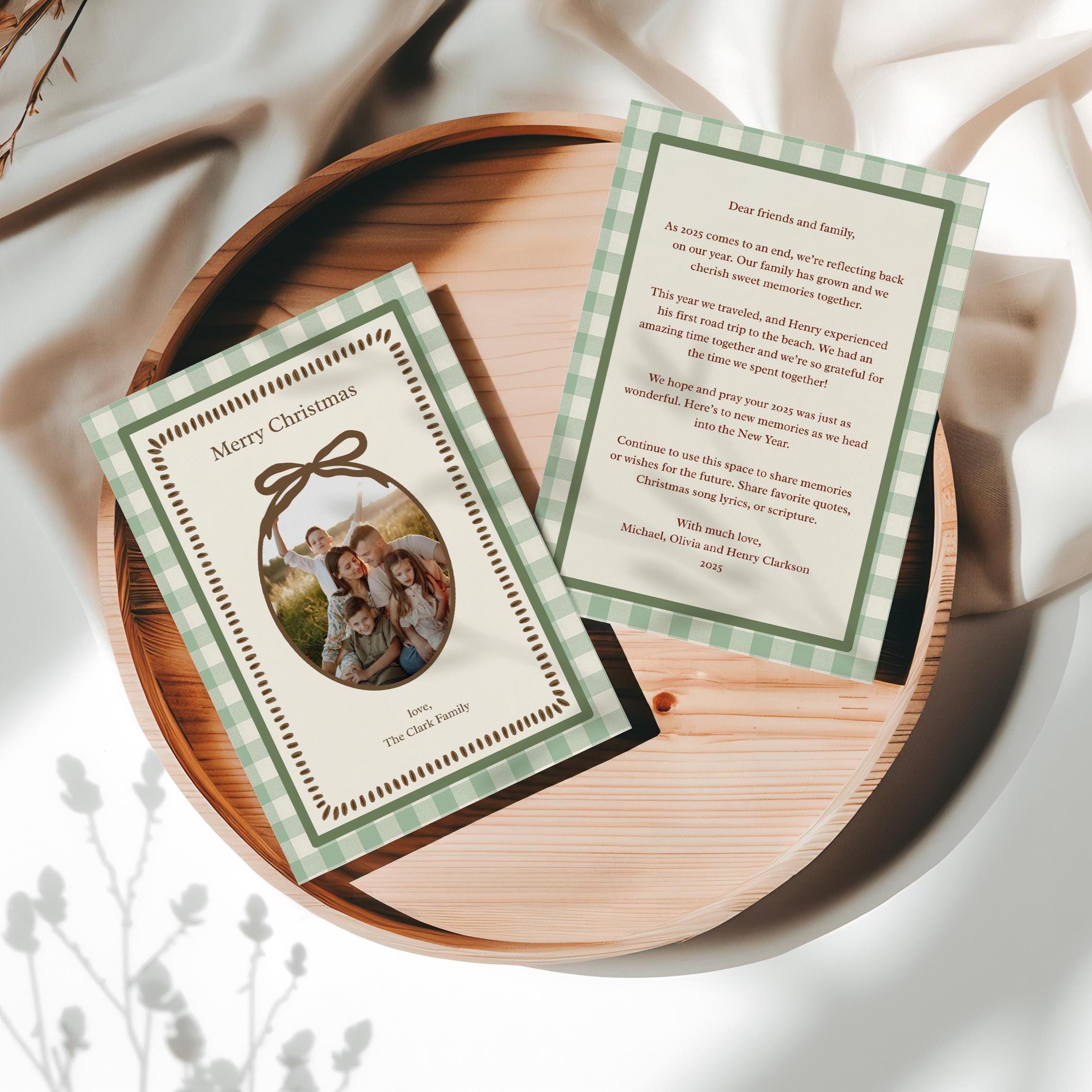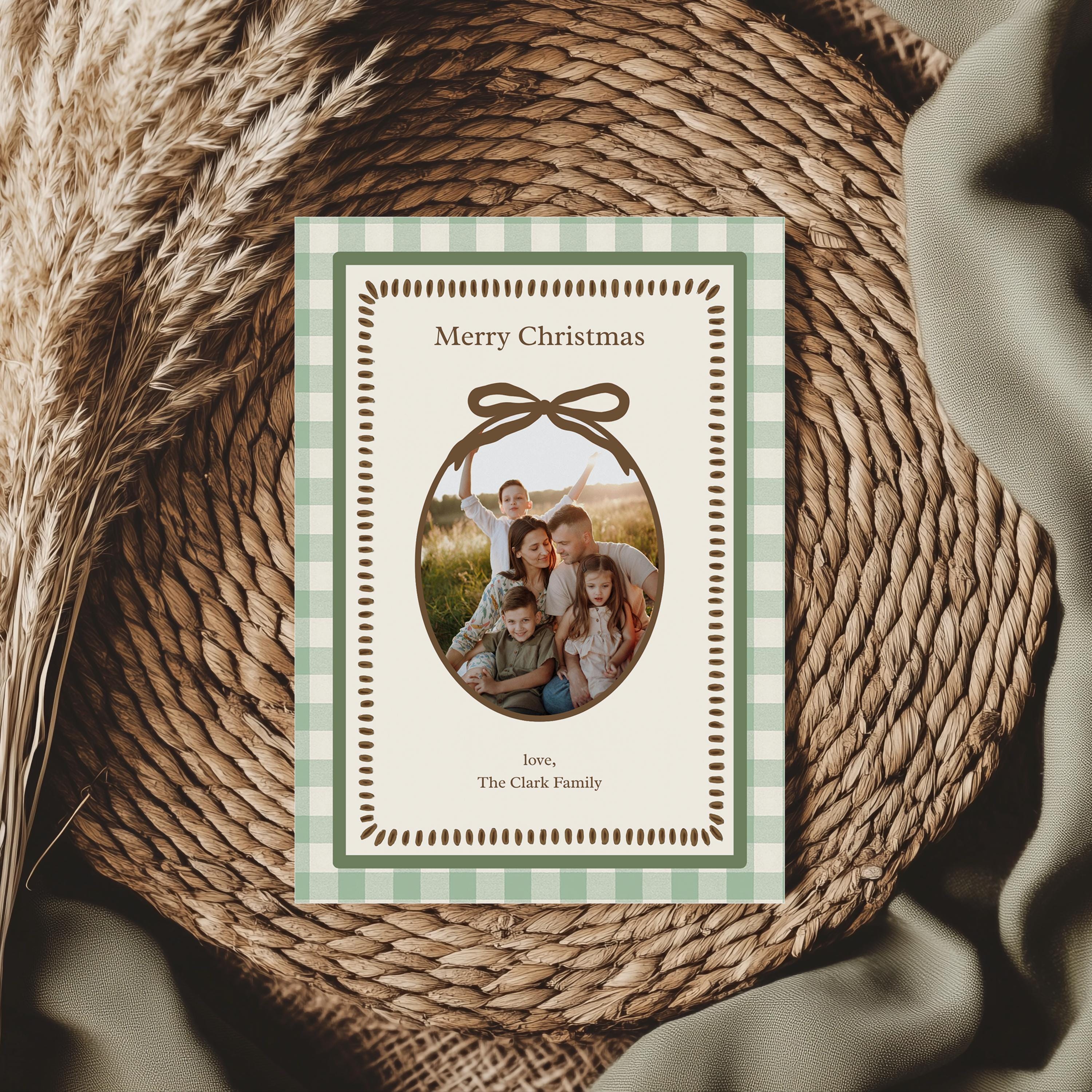 Share your family’s love and memories with this green gingham printable Christmas card, featuring a sweet bow-tied oval photo frame and matching two-sided layout. The back includes space for your yearly family letter—perfect for sharing updates and well wishes with the ones you love most.