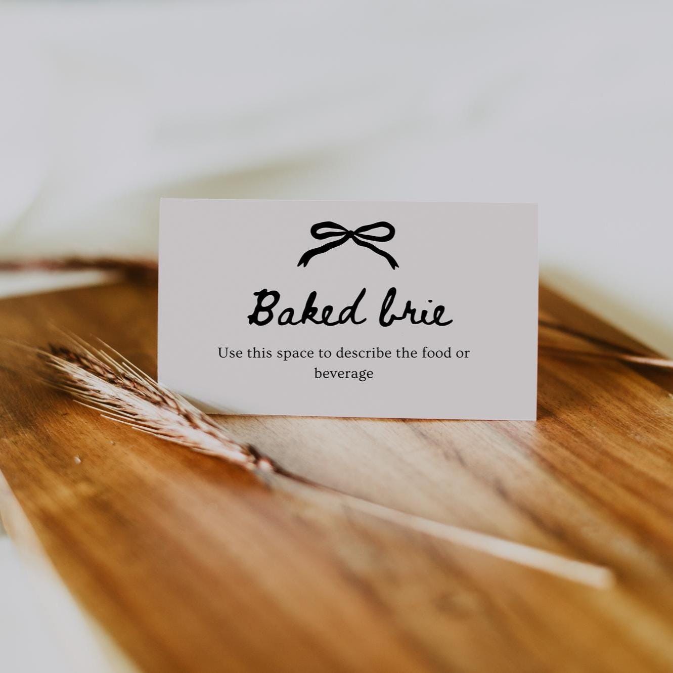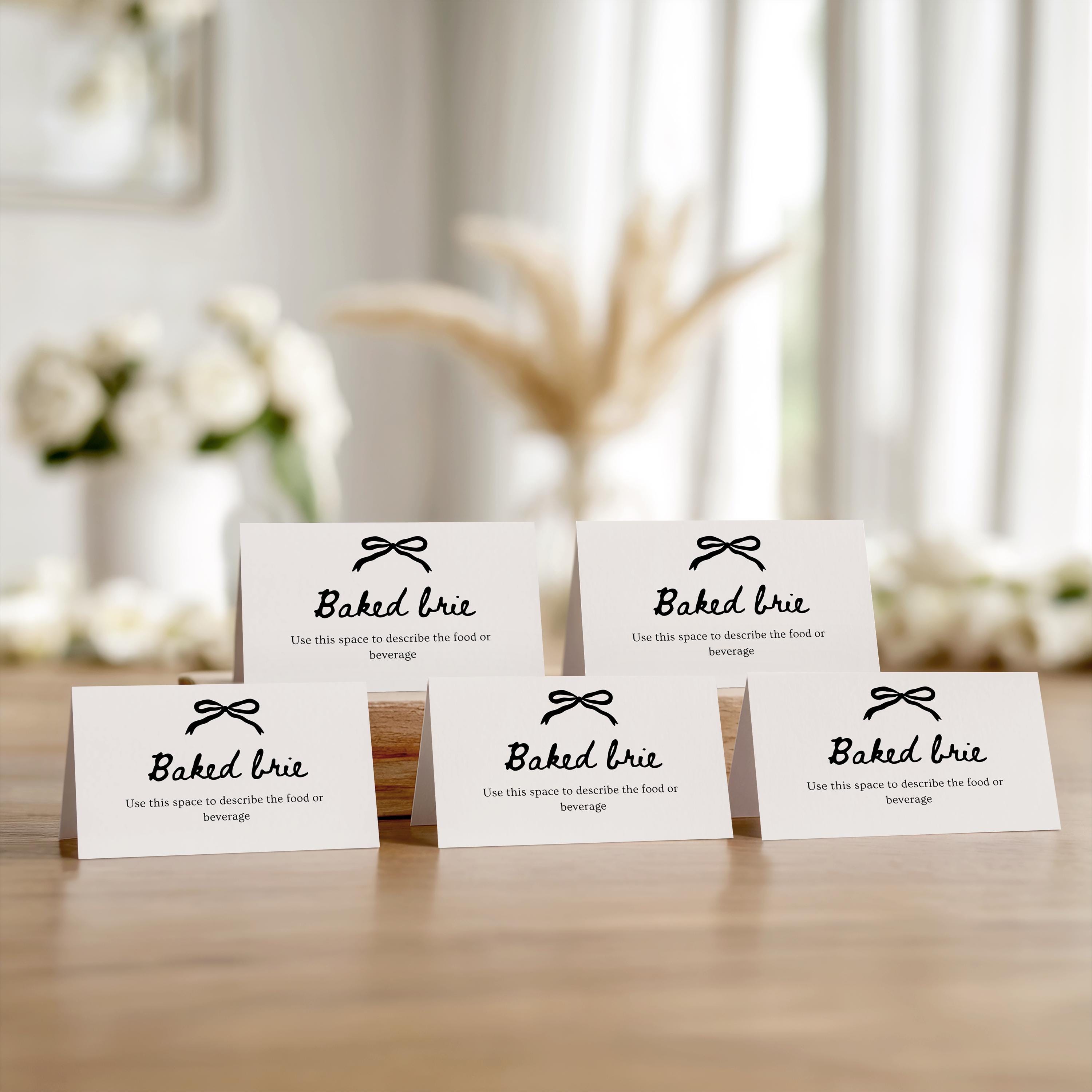 Add a simple, elegant touch to your next party with these editable food tent cards. Designed with a minimalist bow and classic handwritten typography, these printable place cards are perfect for labeling dishes, desserts, drinks, or even guest names at your holiday gathering.