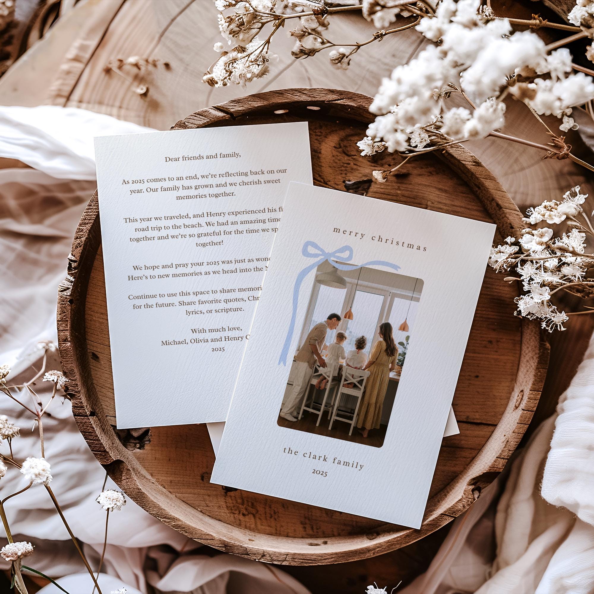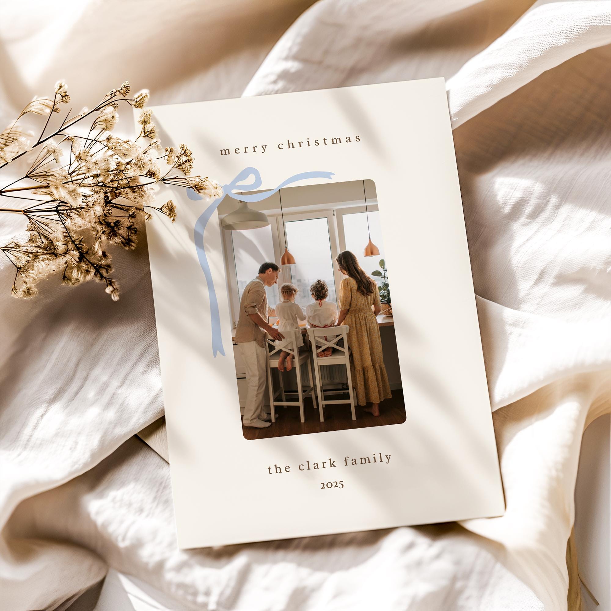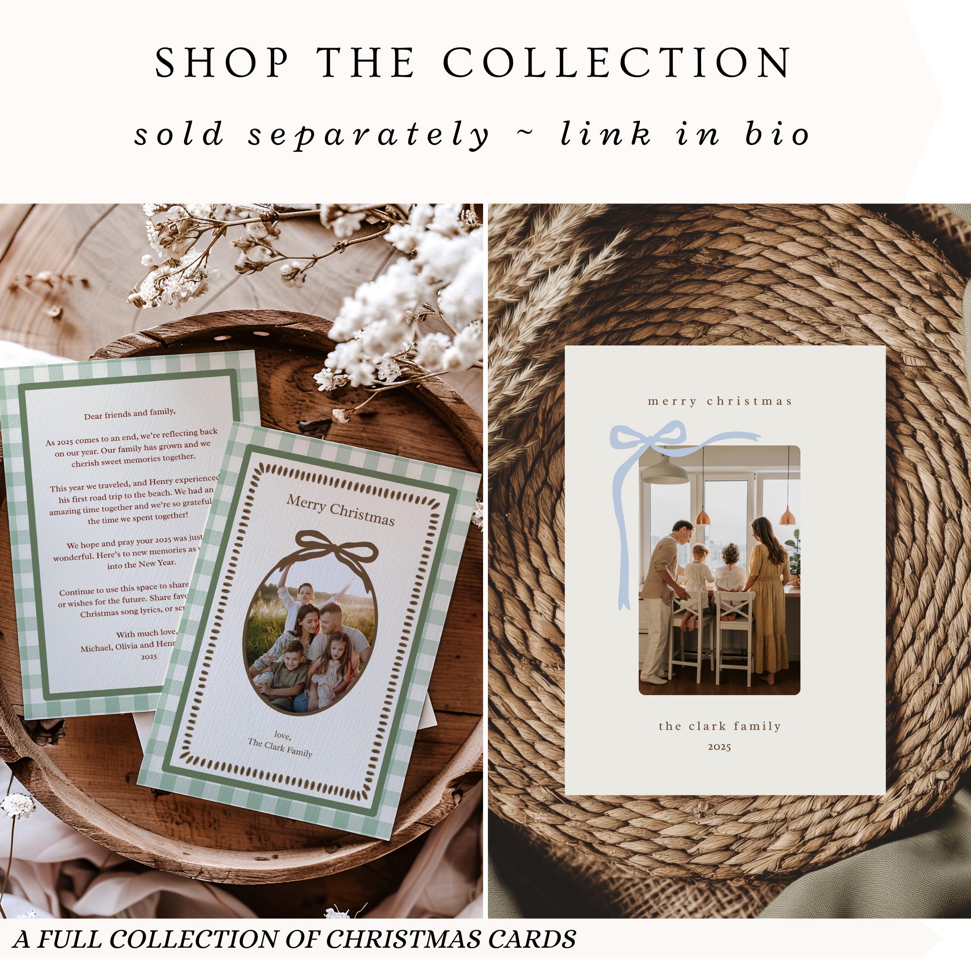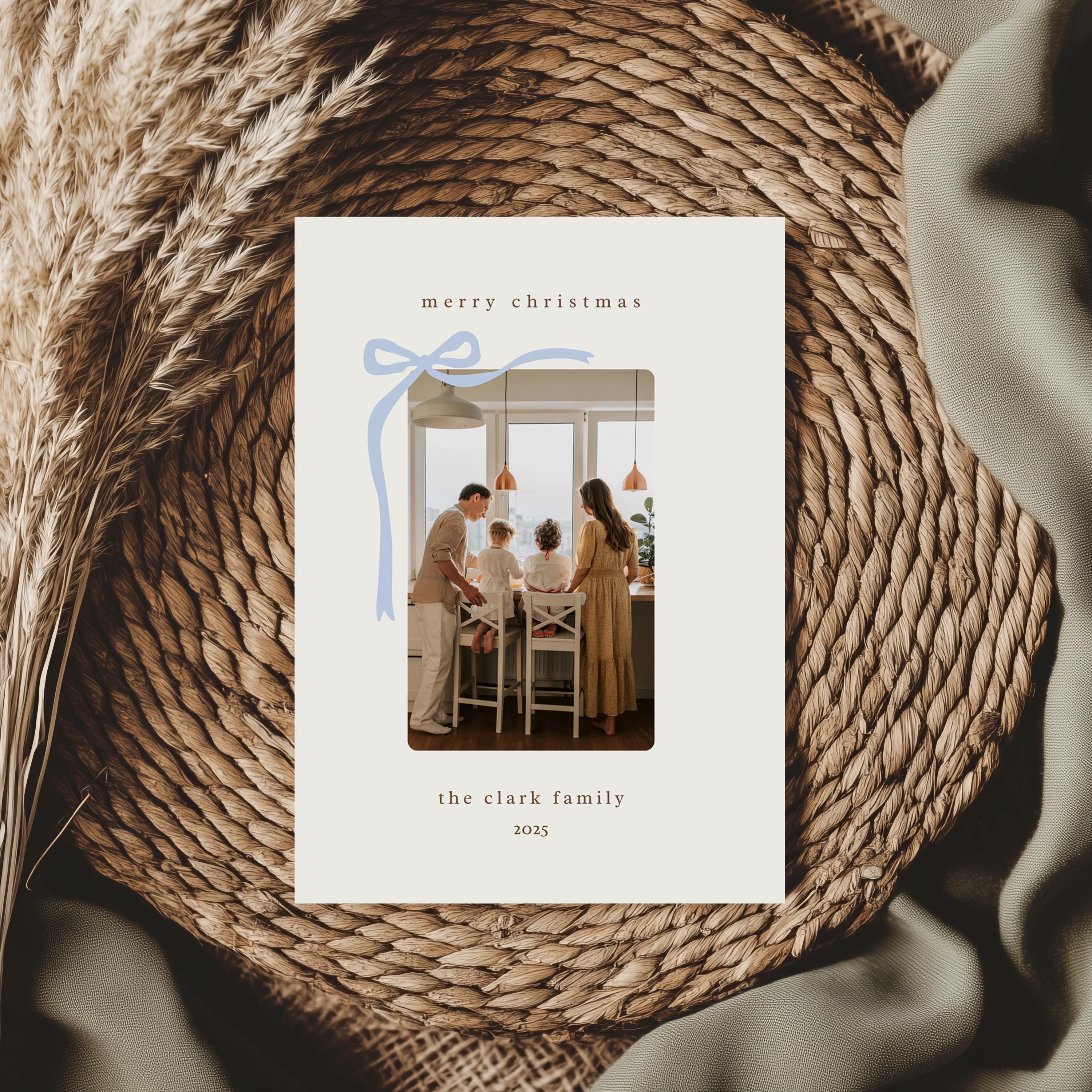 Celebrate your family’s story beautifully this season with this editable Christmas card template — a timeless blend of modern simplicity and sentimental warmth. It features a beige background with a soft blue bow, a space to easily upload and insert your own family photo, and a back side to write your annual family letter. Designed for families who love clean design, cozy details, and heartfelt connection.