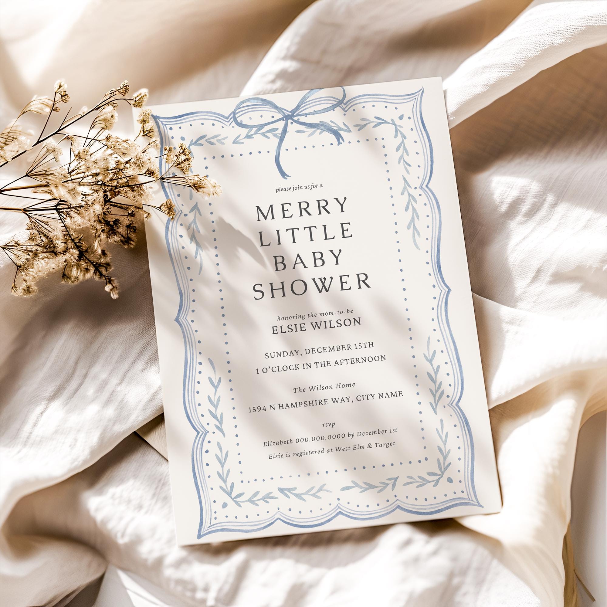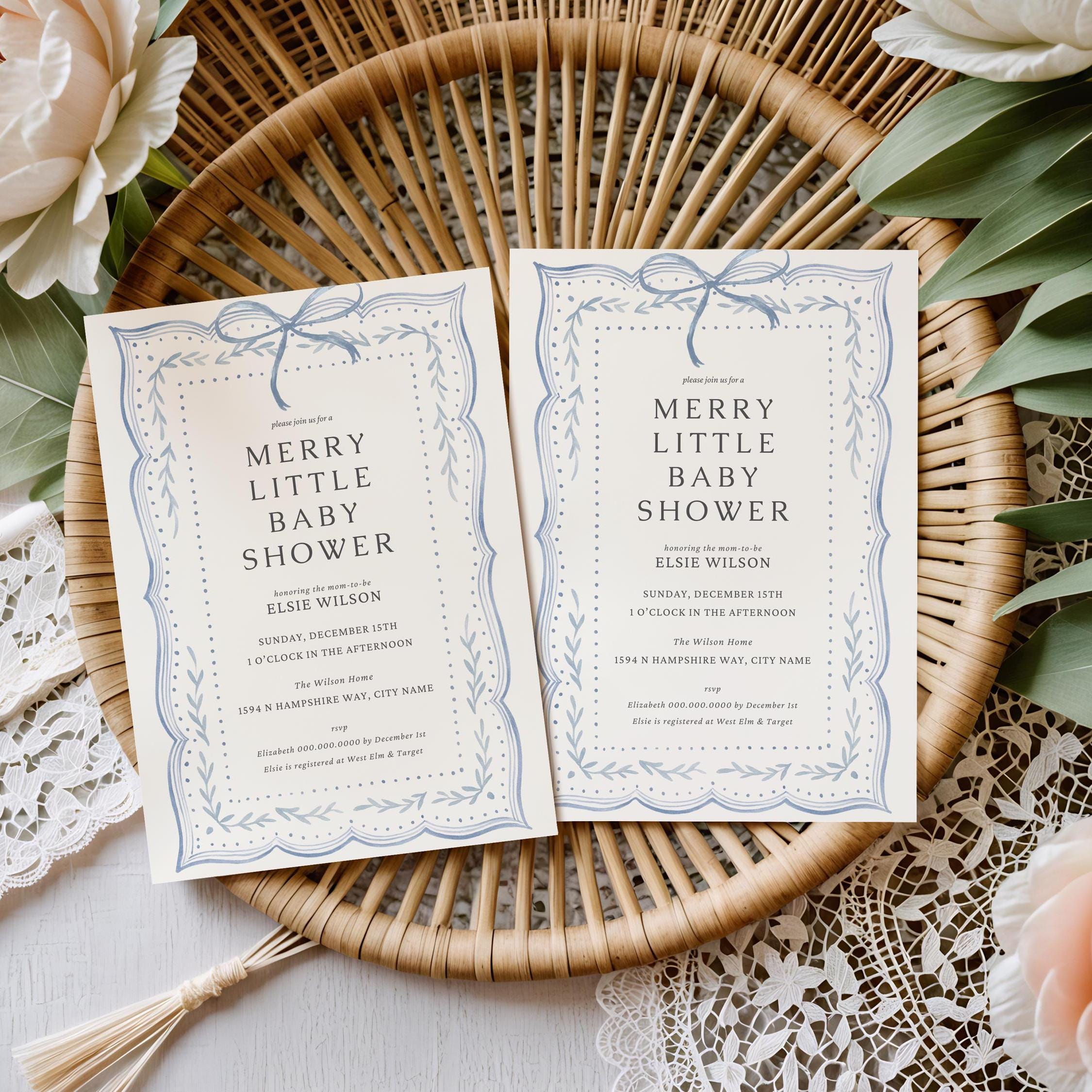 Bring a touch of Christmas charm to your celebration with this Merry Little Baby Shower Invitation. Designed with a soft watercolor blue ribbon and hand-painted pine garland border, this 5×7 inch printable invite captures the cozy beauty of the season — simple, elegant, and perfect for a winter baby shower.