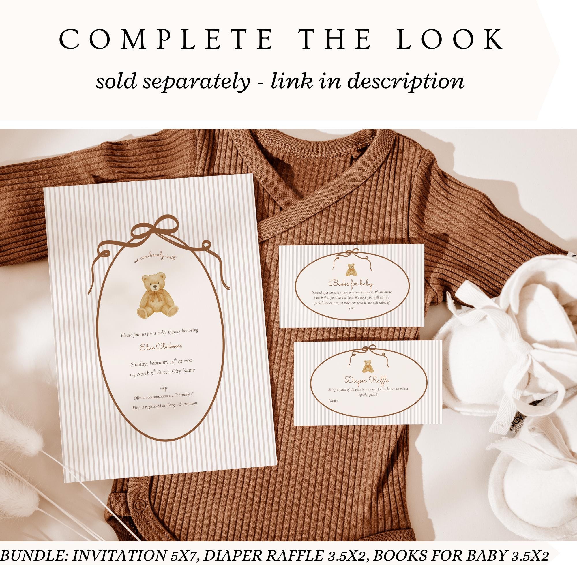 Celebrate your little one with this warm and charming We Can Bearly Wait baby shower invitation, featuring a soft watercolor teddy bear, taupe bow detail, and classic neutral stripe background. This 5×7 editable baby shower template is perfect for moms planning a cozy, neutral, or vintage-inspired theme.