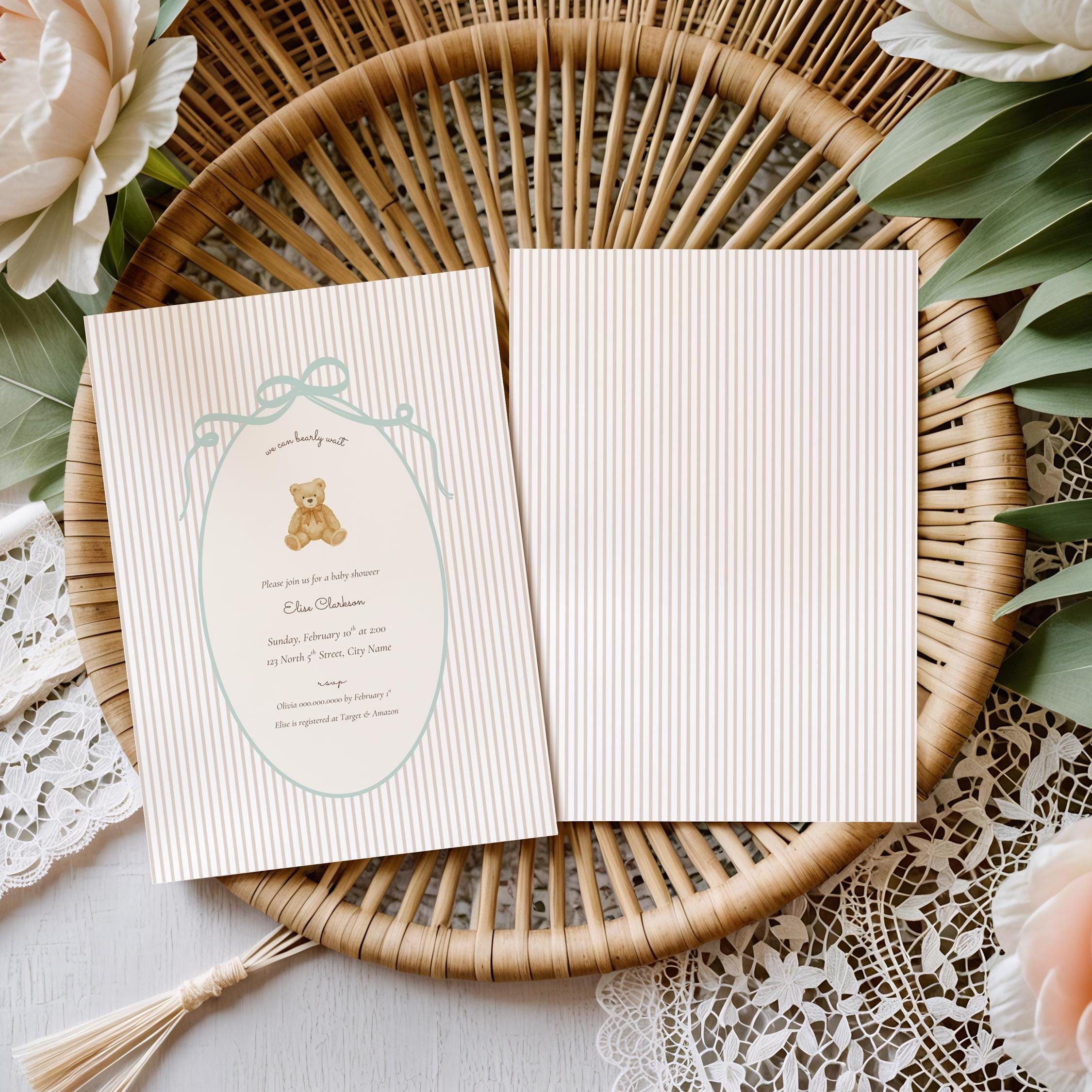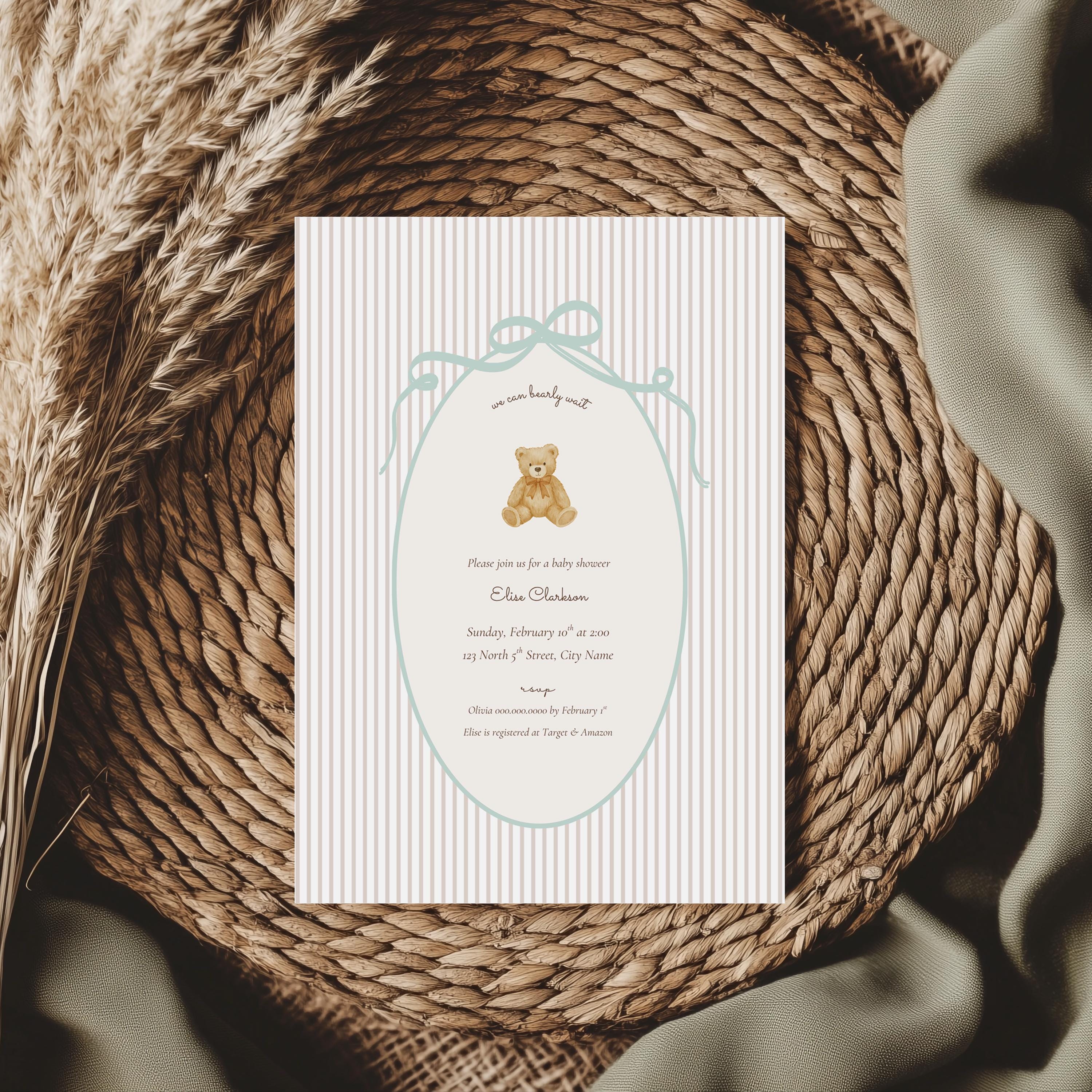 Celebrate the mom-to-be with this sweet and timeless We Can Bearly Wait Baby Shower Invitation, featuring a soft watercolor teddy bear, hand-painted green bow, and classic neutral stripe background. The gentle tones and simple design make it perfect for a gender neutral baby shower, a boho teddy bear shower, or a cozy bearly wait baby shower theme.