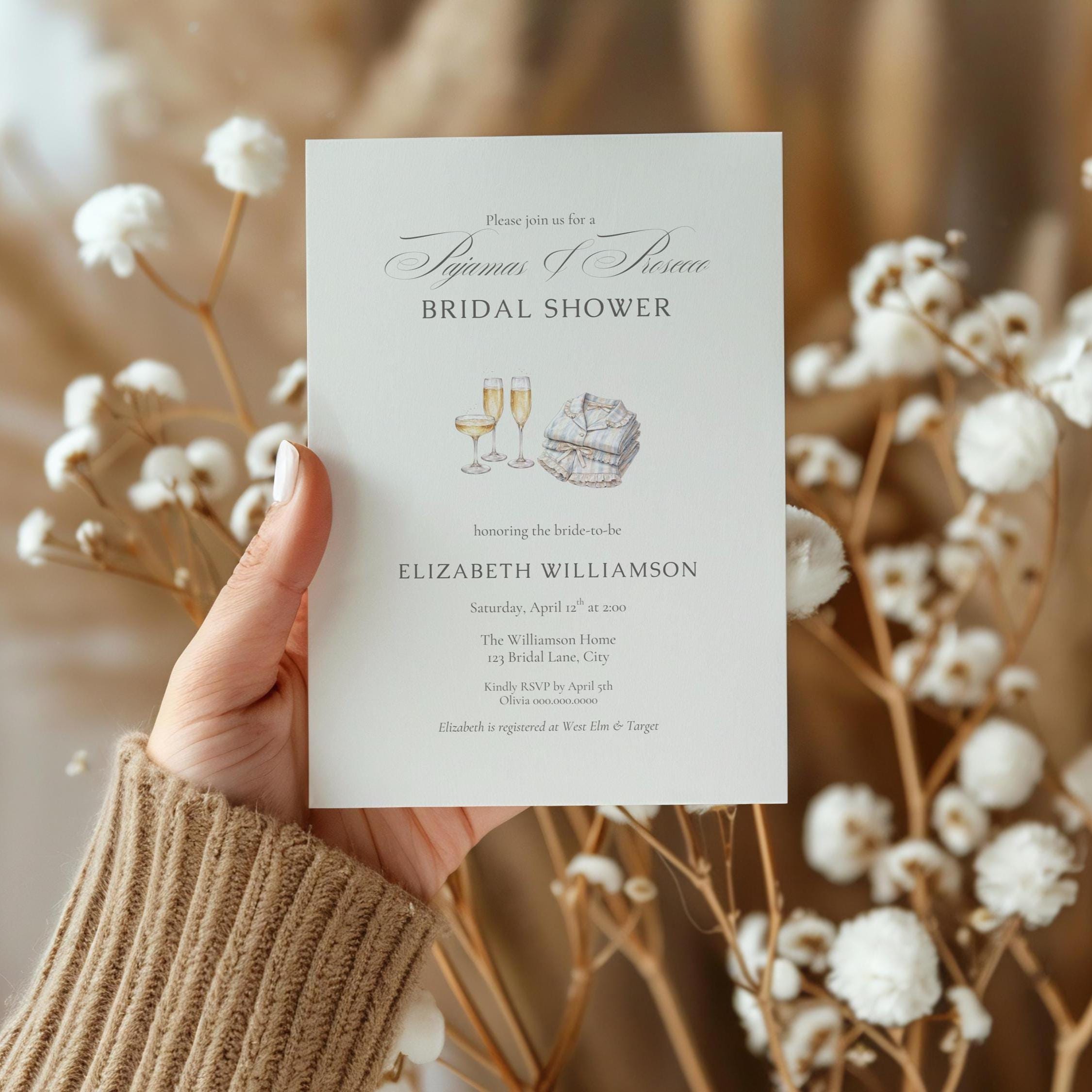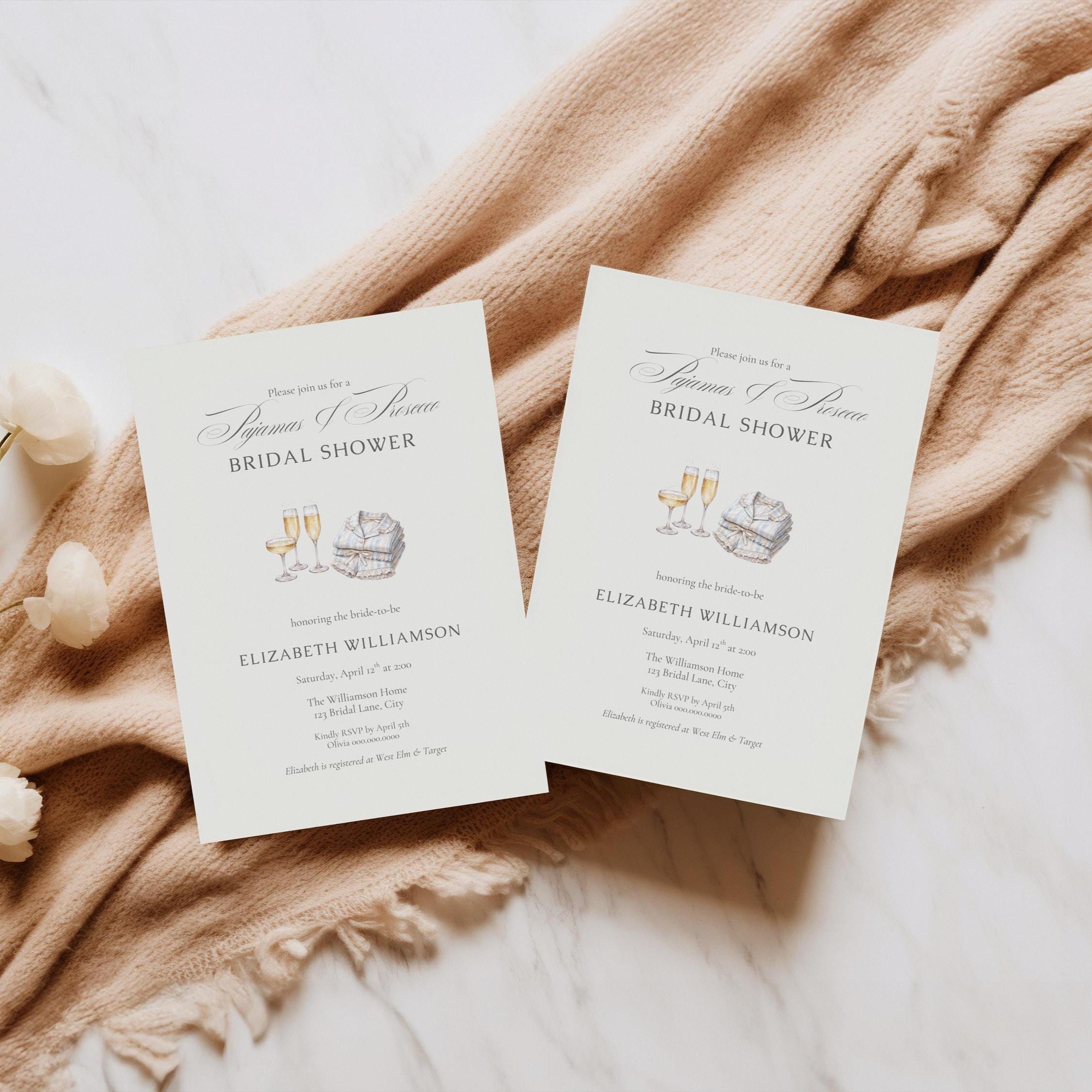 Perfect for a morning or afternoon gathering, this design is ideal for hosts planning a pajama-themed bridal shower, brunch celebration, or laid-back girls’ day in honor of the bride. The neutral color palette and timeless style make it easy to coordinate with soft florals, linens, and cozy decor.