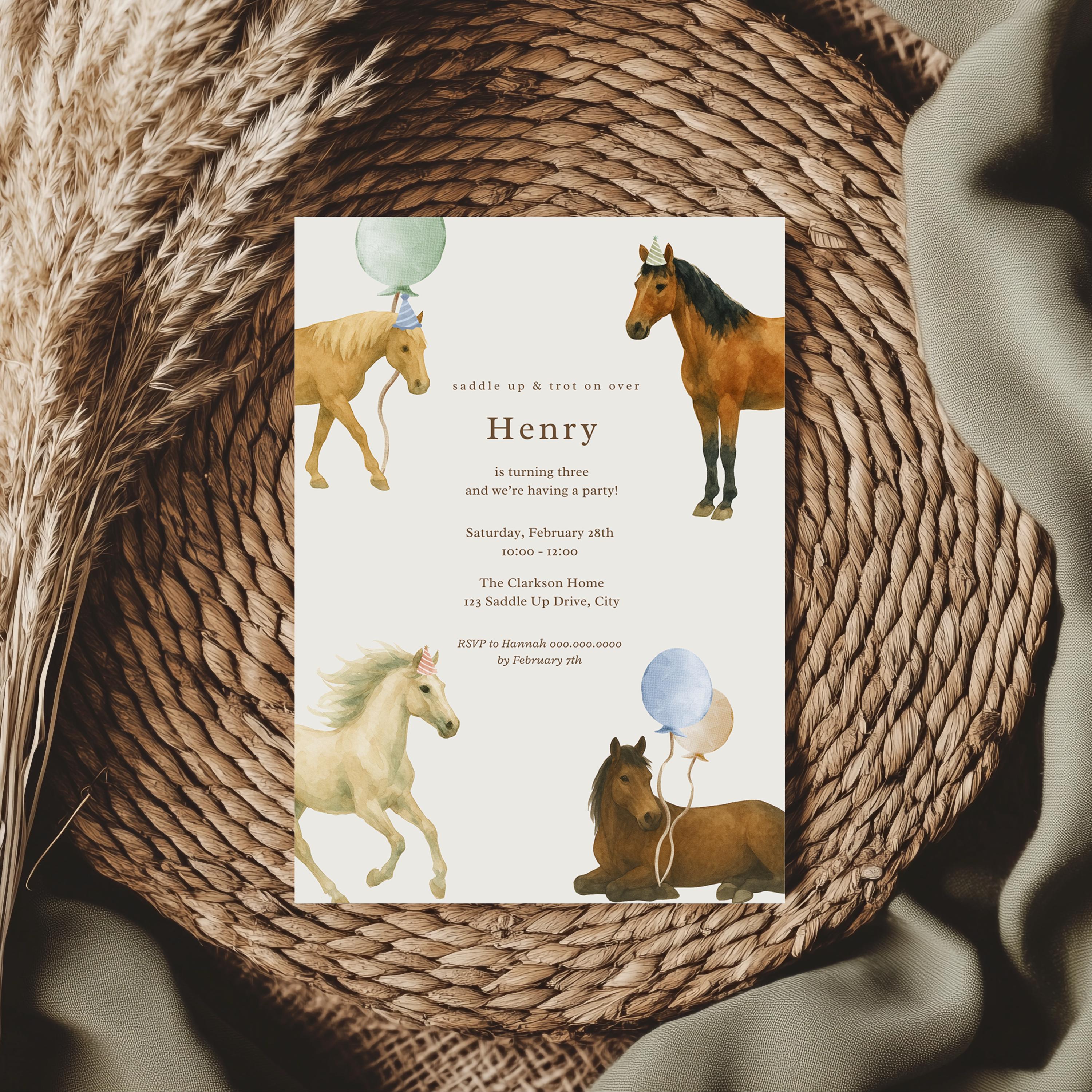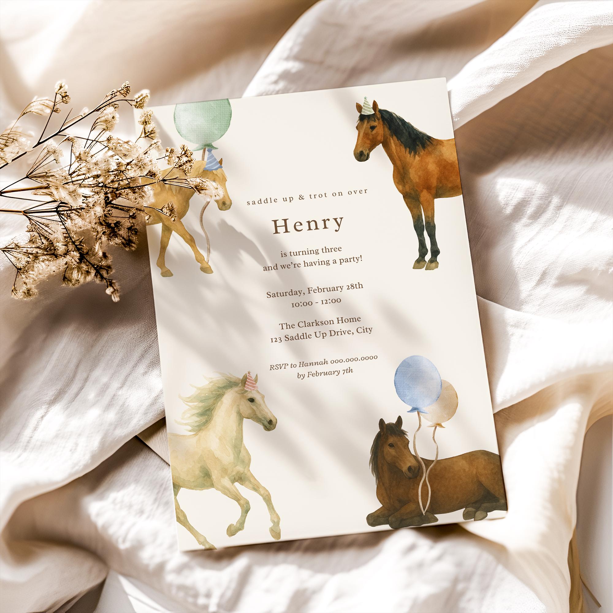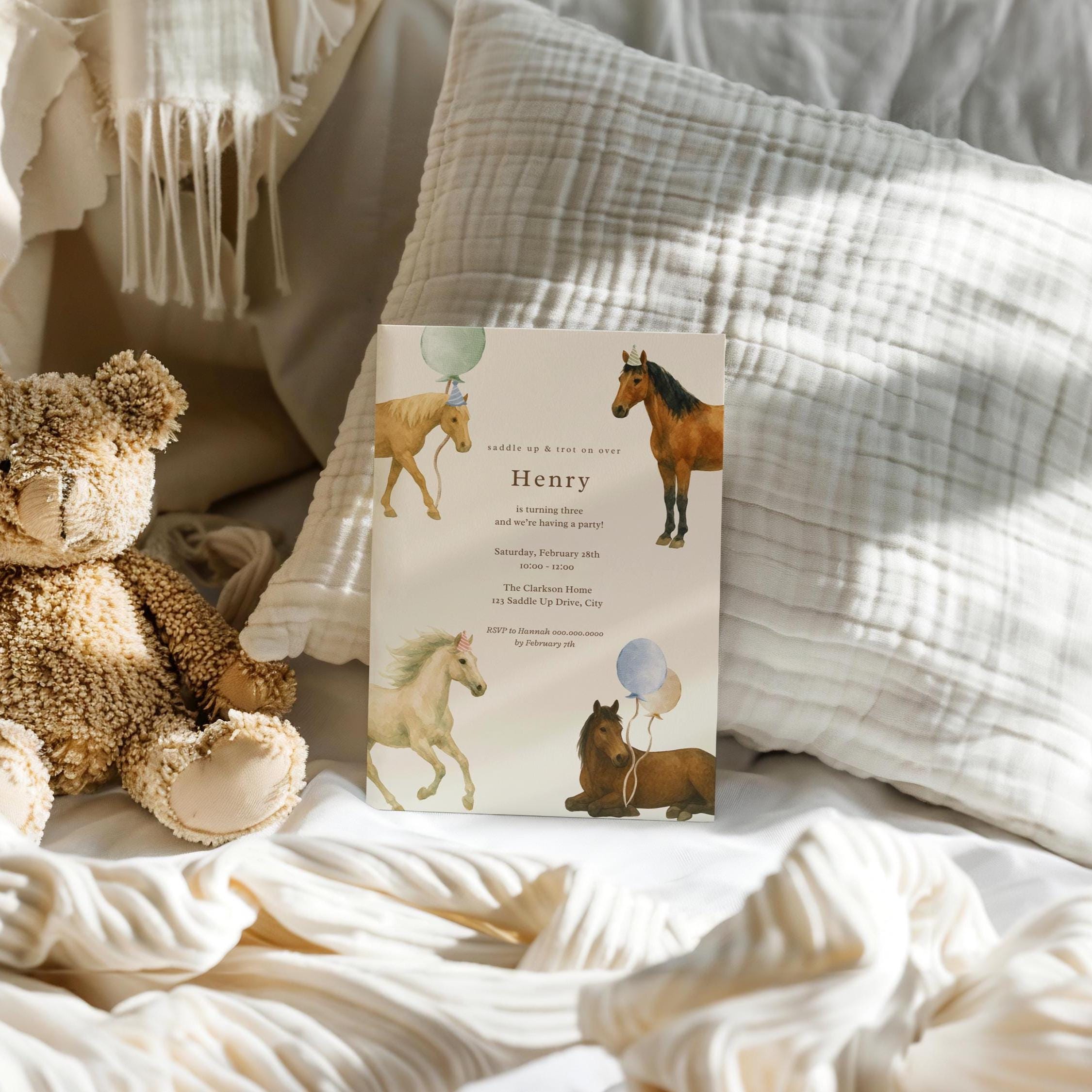 This design features soft watercolor horses, gentle neutral tones, and playful balloon details — making it ideal for boys or girls and easy to coordinate with simple, cozy party decor.