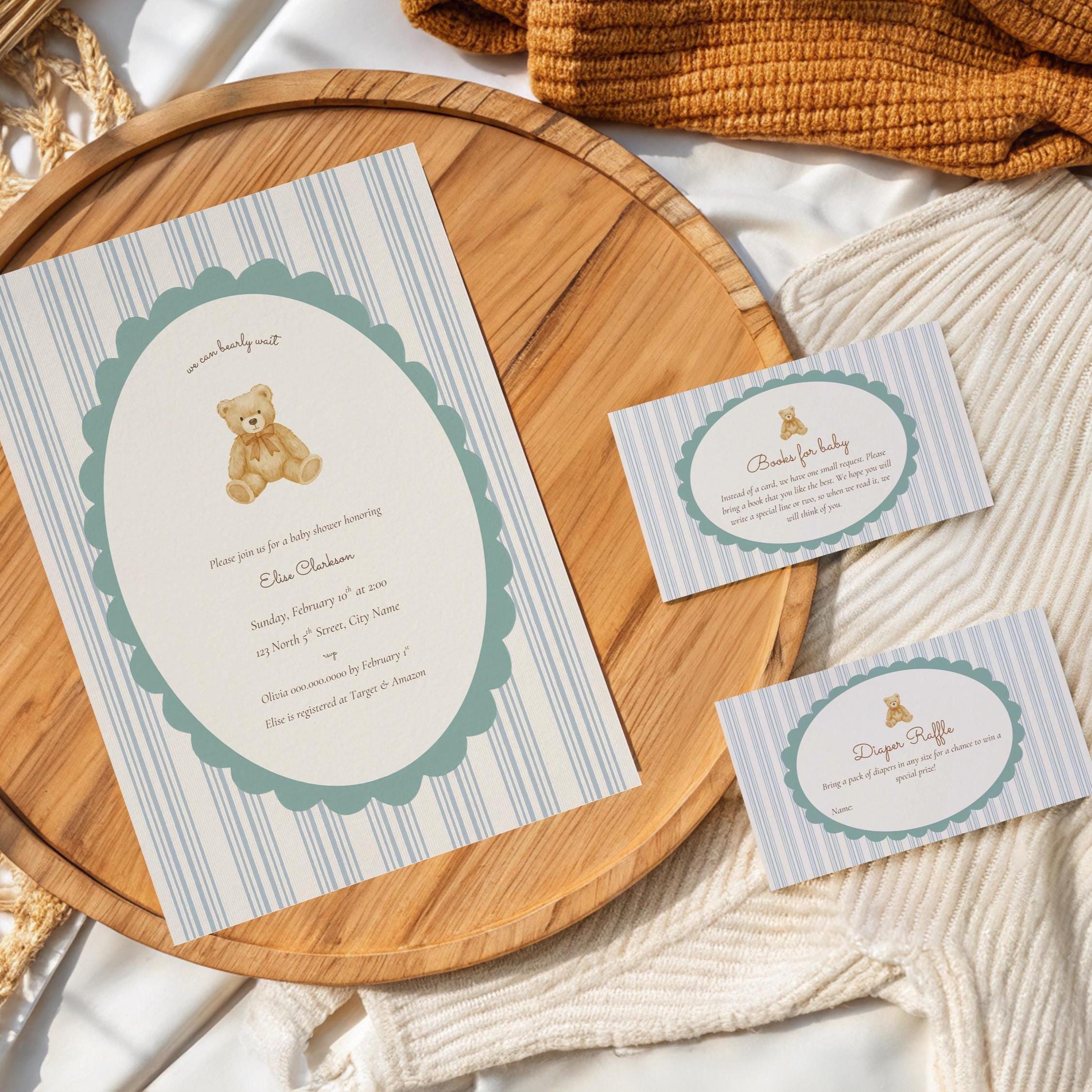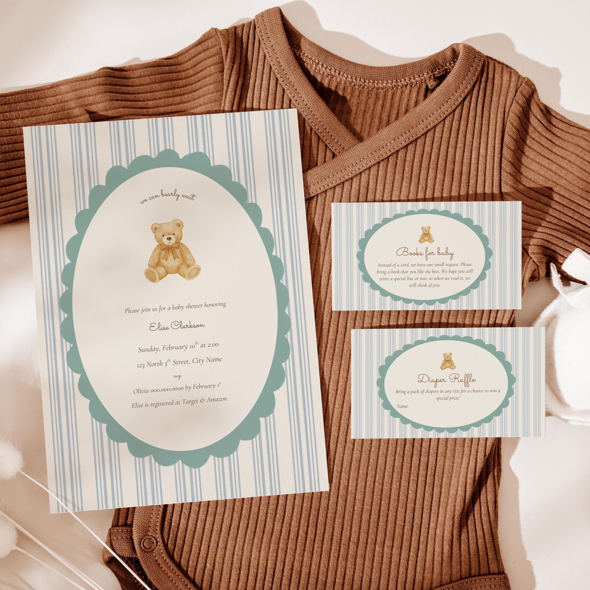 Celebrate your little one with the sweetest We Can Bearly Wait baby shower invitation bundle. This set comes with an invitation, books for baby and diaper raffle card. This charming design features a soft watercolor teddy bear, a scalloped sage-green frame, and classic vertical stripes for that cozy, timeless look perfect for a boho bear baby shower or a gender neutral baby shower theme.