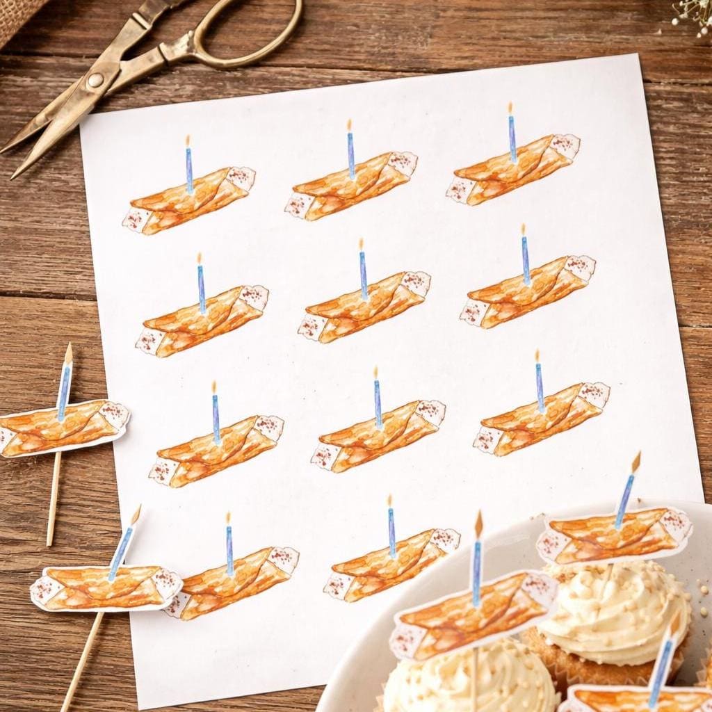 Simply cut out each cannoli, attach it to a toothpick or skewer with tape or glue, and place it into your cupcakes for an instant, cohesive party look. Prefer a different size? The template can be easily adjusted larger or smaller before printing to suit your style or cupcake size.