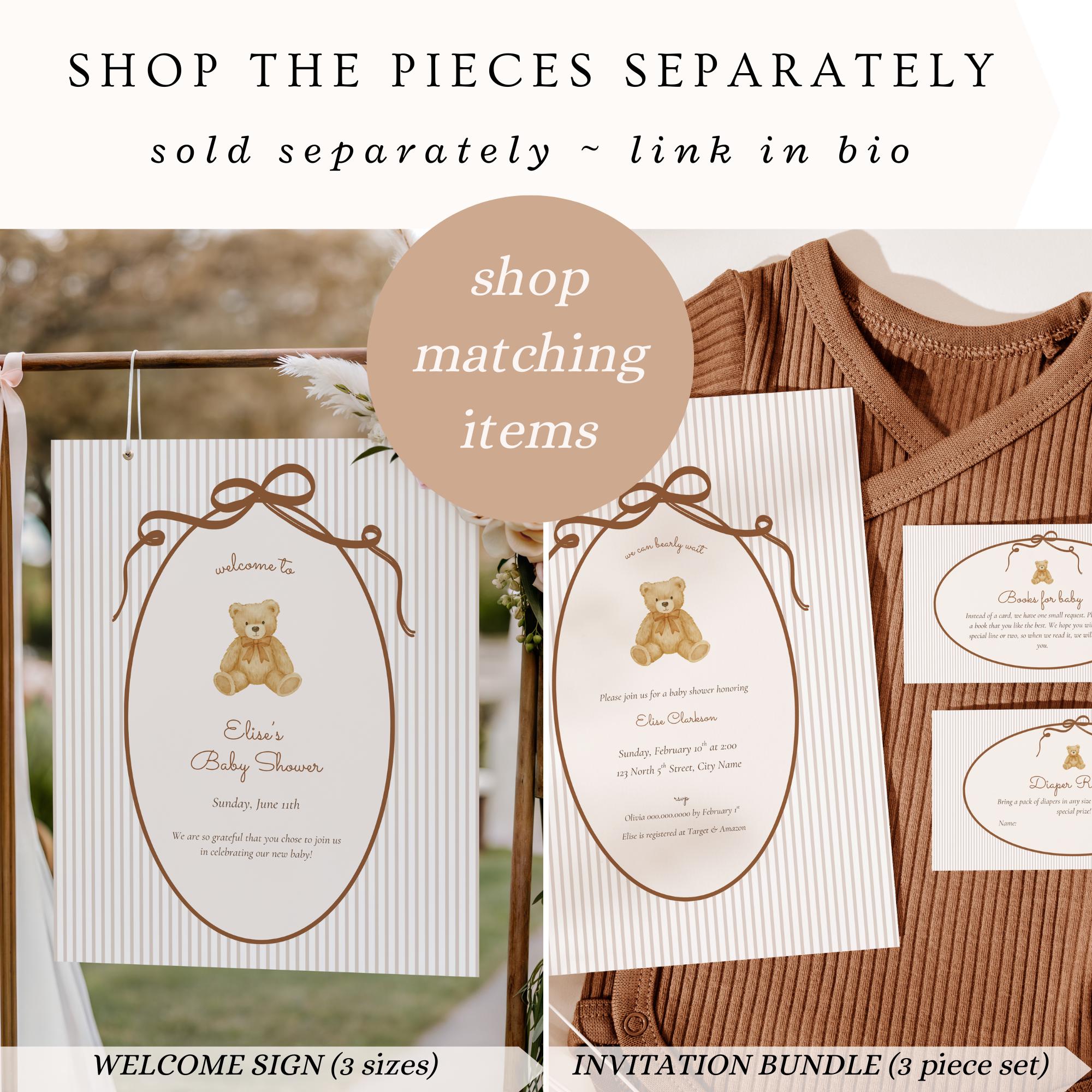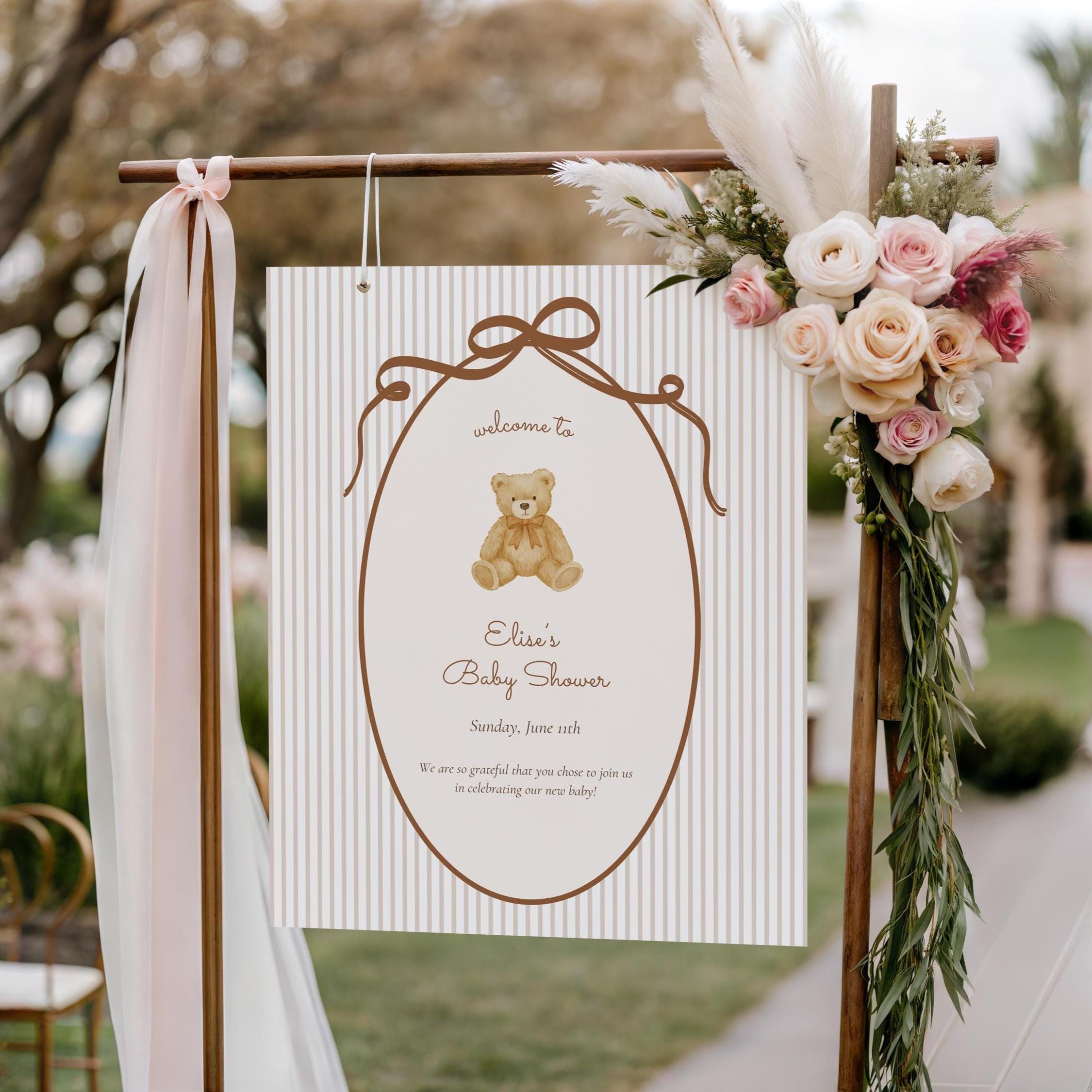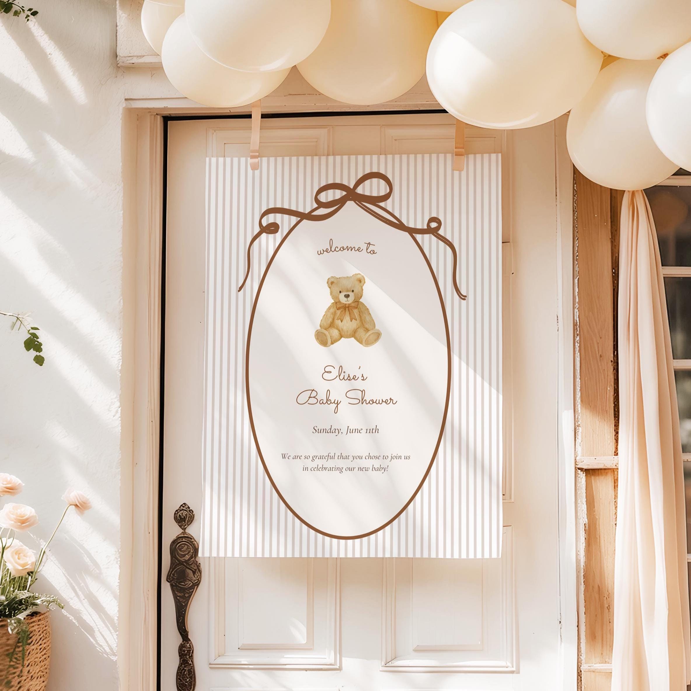 Designed with a soft, romantic vintage aesthetic, this sign pairs beautifully with neutral baby showers, teddy bear themes, and classic nursery-inspired decor. Simply edit in Canva, download, and print at home or your favorite print shop.