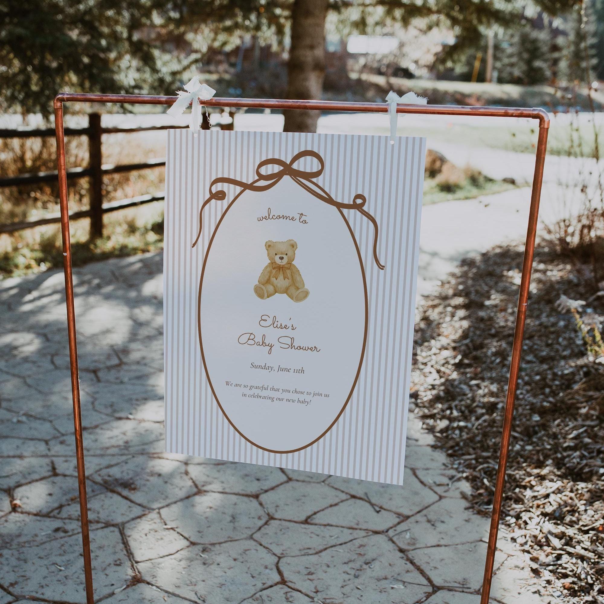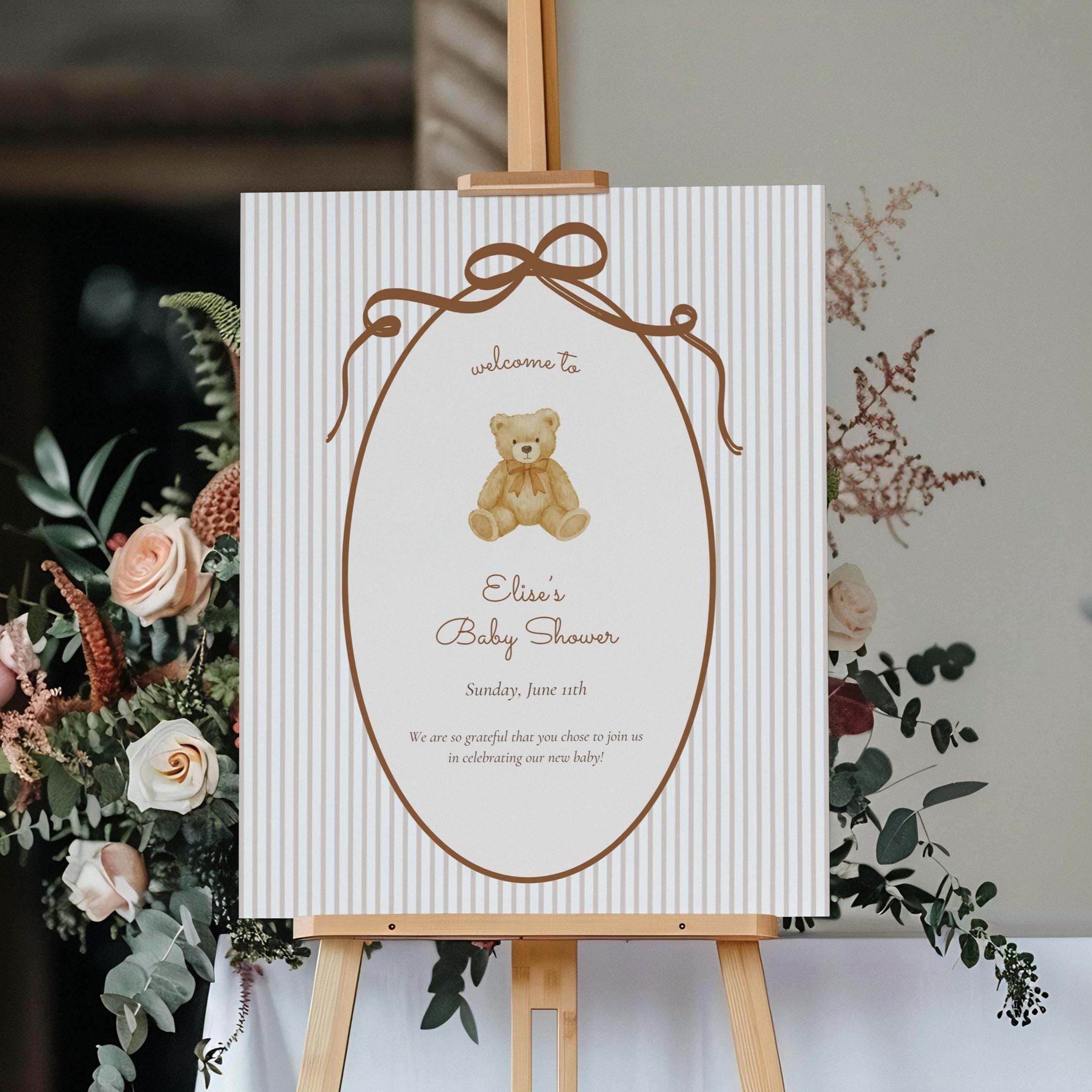 This editable teddy bear baby shower welcome sign features soft neutrals, delicate stripes, and a classic storybook feel—perfect for creating a warm, timeless entrance to your celebration.