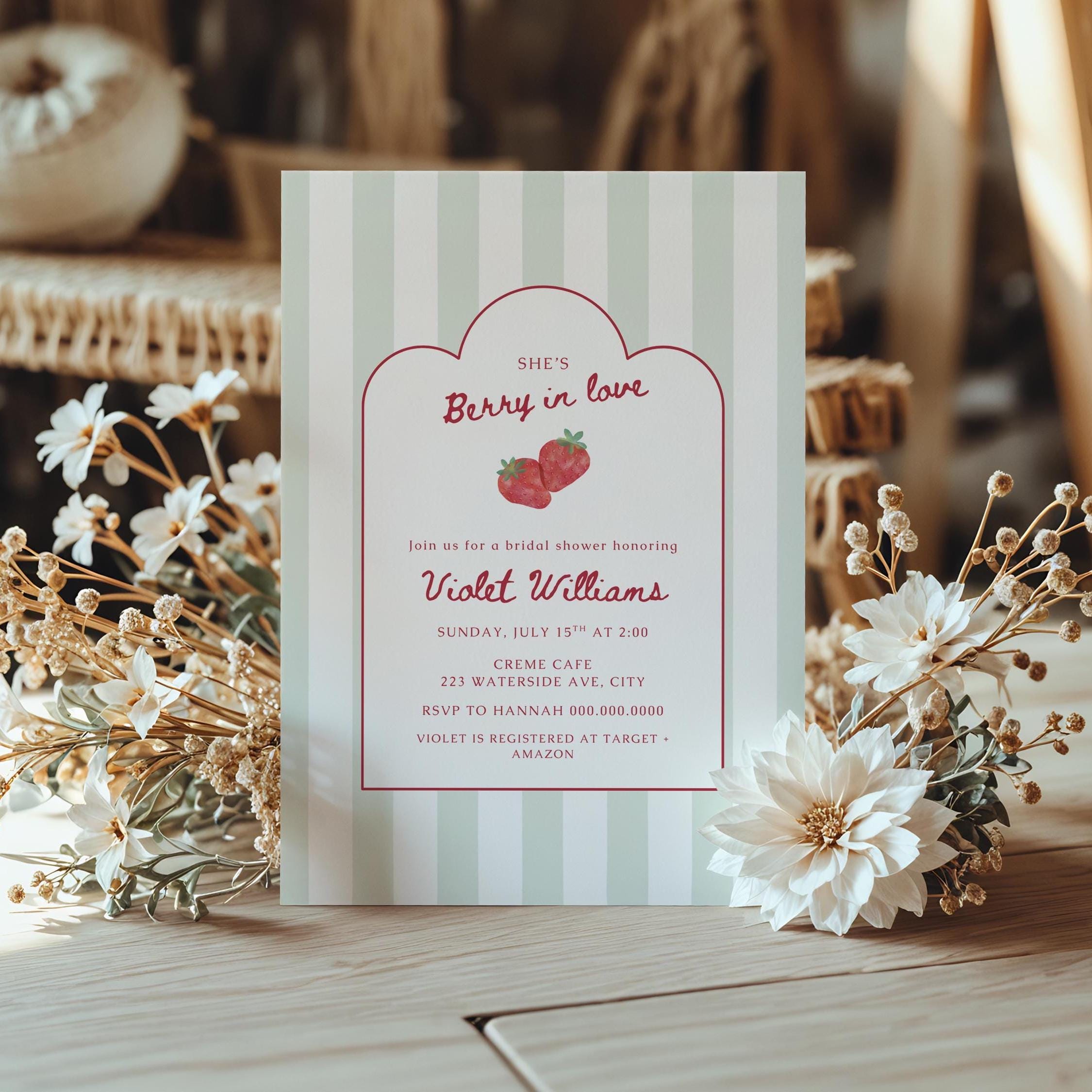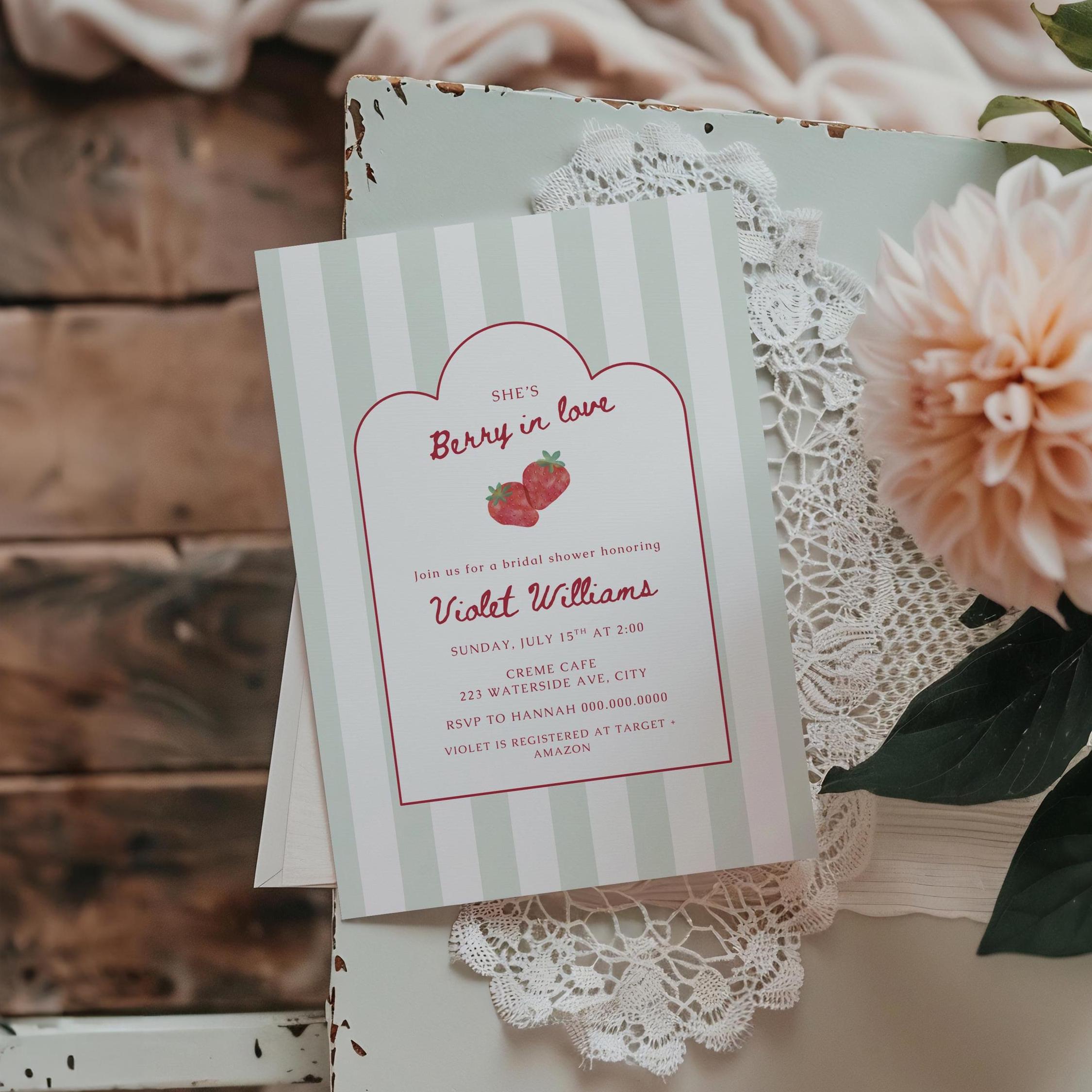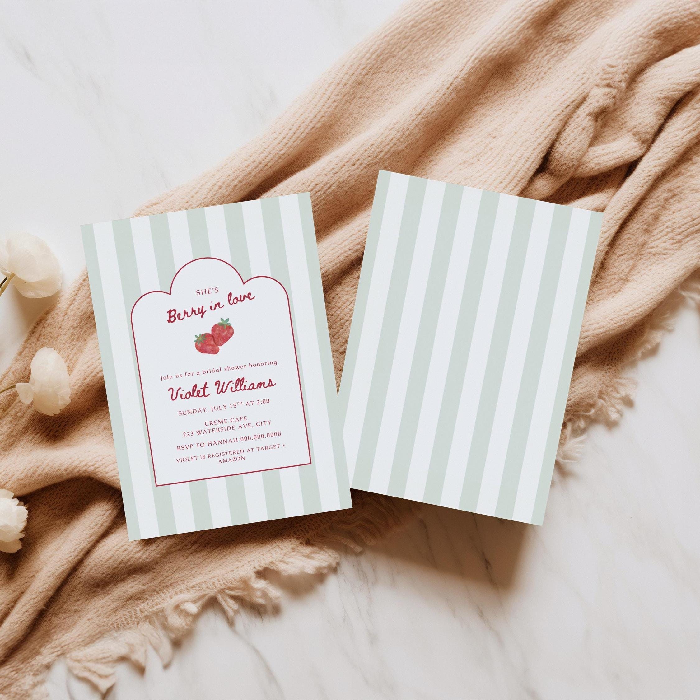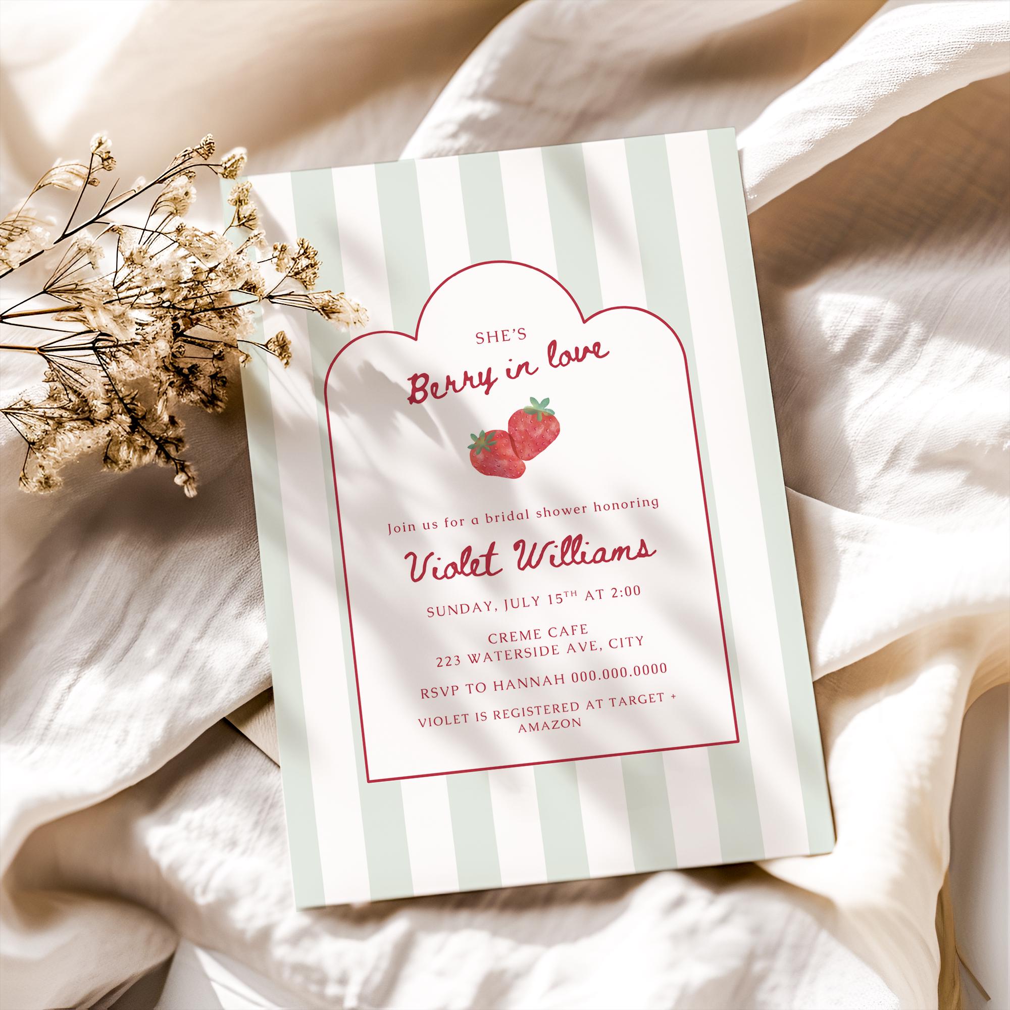 Celebrate the sweetest bride-to-be with this charming Berry In Love berry-themed bridal shower invitation! This editable 5x7 Canva template features soft sage stripes, delicate scalloped framing, and romantic strawberry accents—perfect for a feminine, garden-inspired celebration.