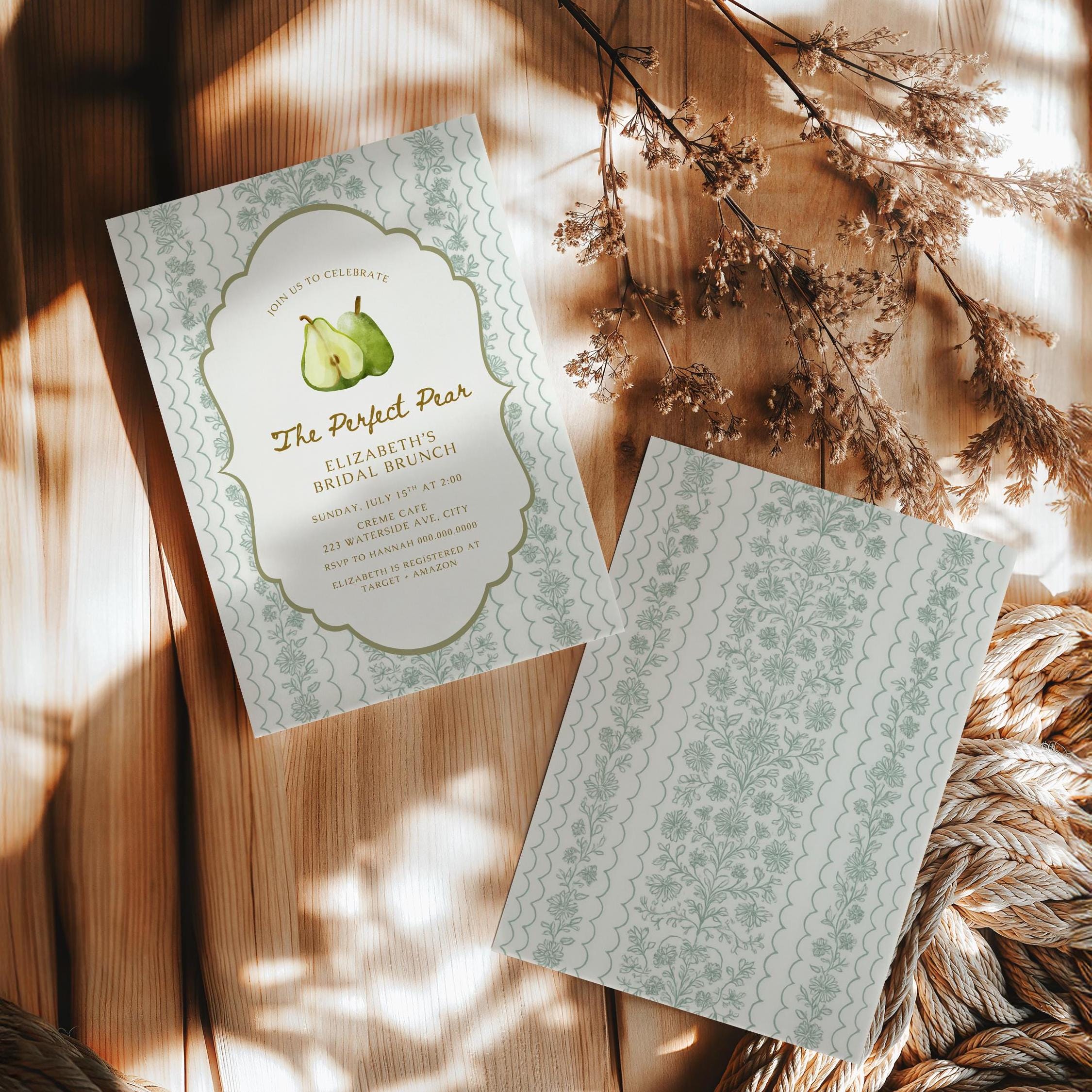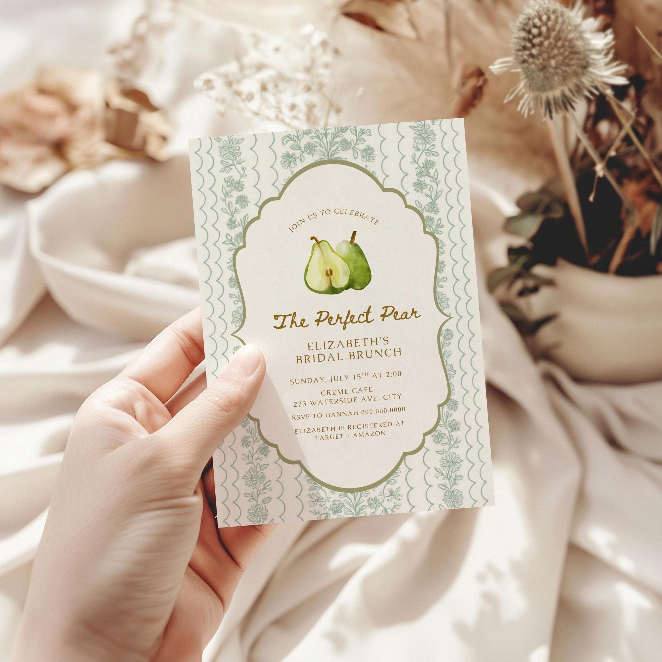 Celebrate the sweetest bride-to-be with this charming pear-themed bridal shower invitation! This Perfect Pear editable 5x7 Canva template features a sketched design, delicate framing, and romantic watercolor pear accents—perfect for a feminine, garden-inspired celebration.