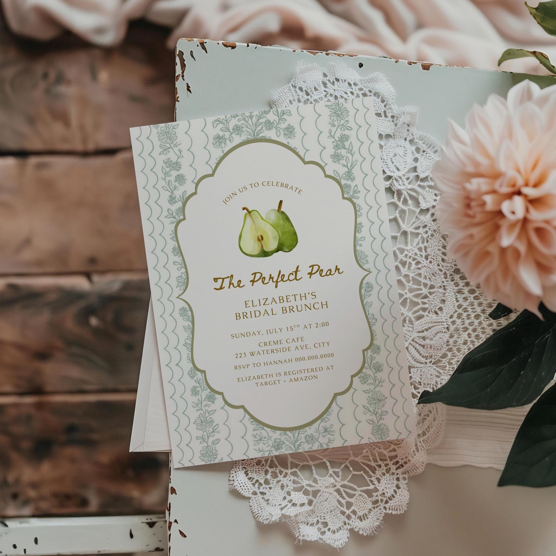 Perfect for a perfect pear bridal shower theme, garden party shower, or summer bridal brunch