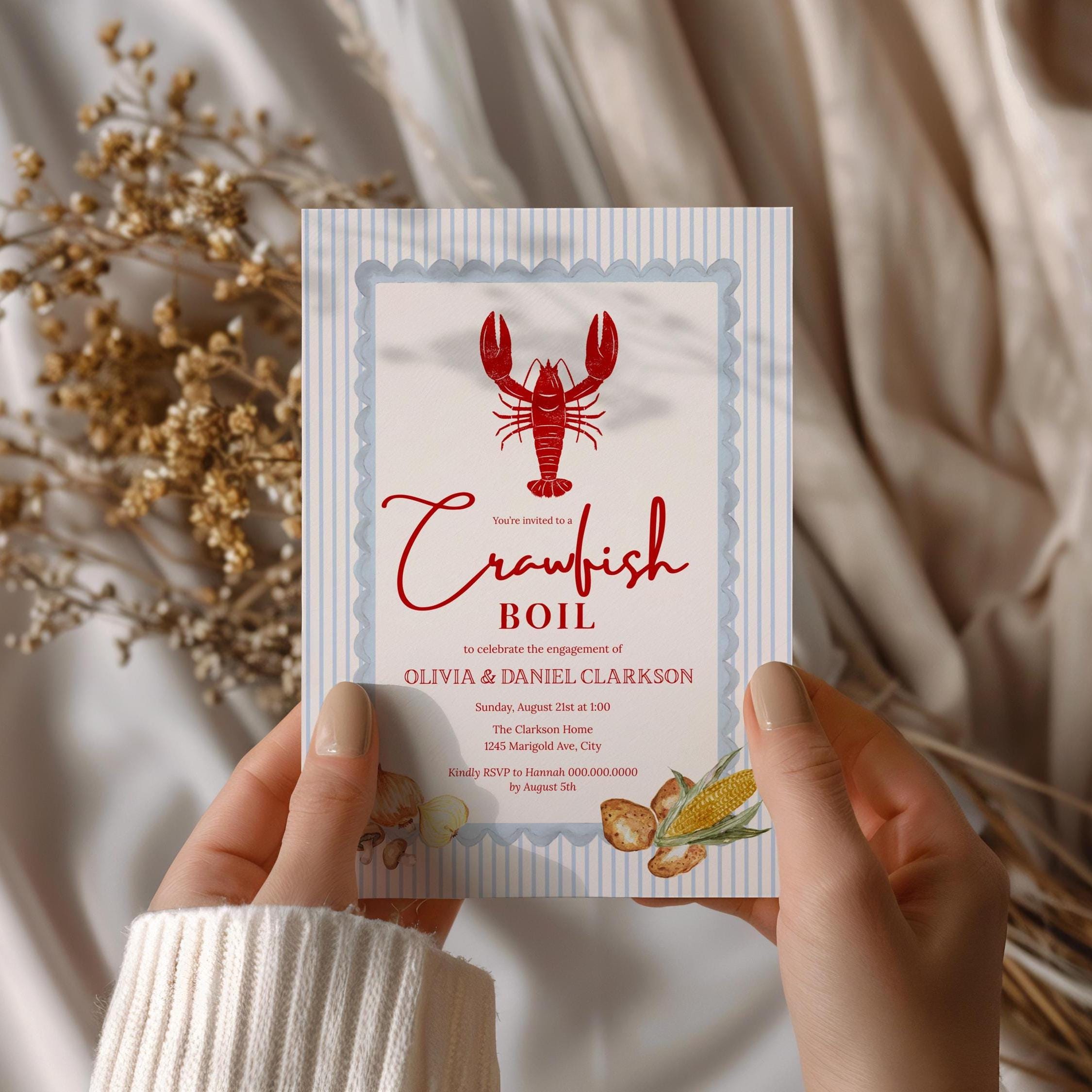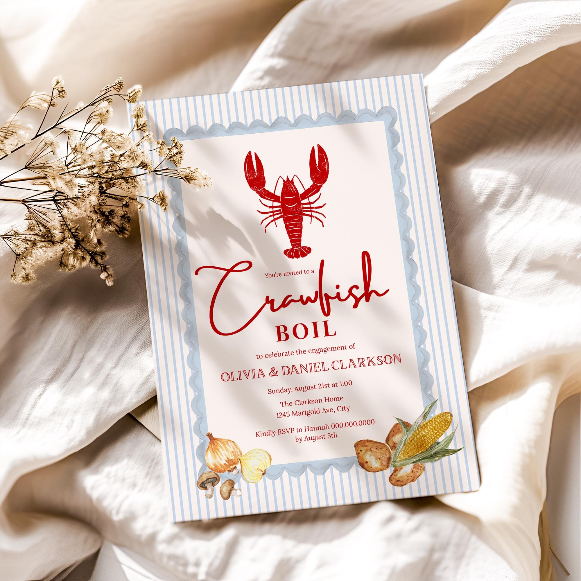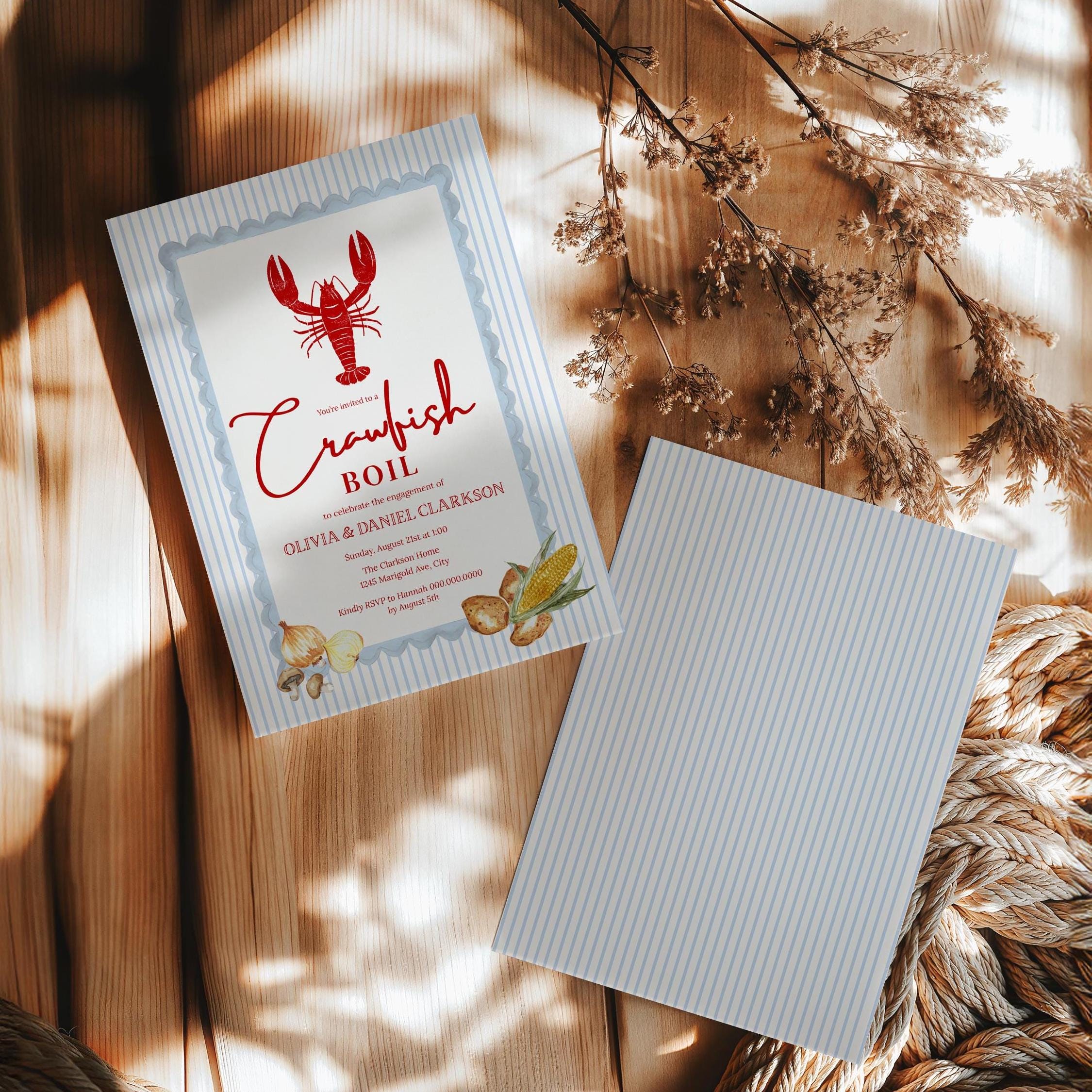 Celebrate your love with a laid-back, Southern-style gathering using this beautifully designed Crawfish Boil Engagement Party Invitation Template. Featuring a classic red crawfish illustration, soft blue stripes, and a charming scalloped frame, this invite blends coastal charm with an elevated, romantic feel—perfect for backyard boils, summer parties, or Louisiana-inspired celebrations.